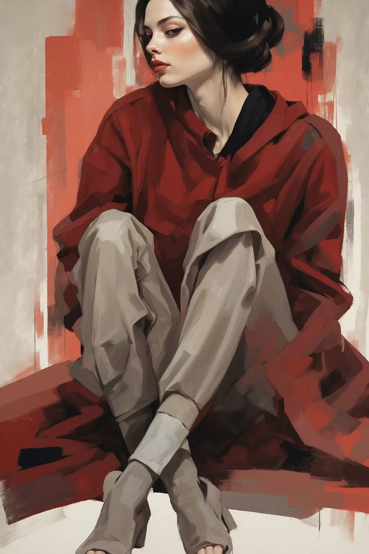 Picture Girl in a red cloak sitting with folded legs Nr s45624