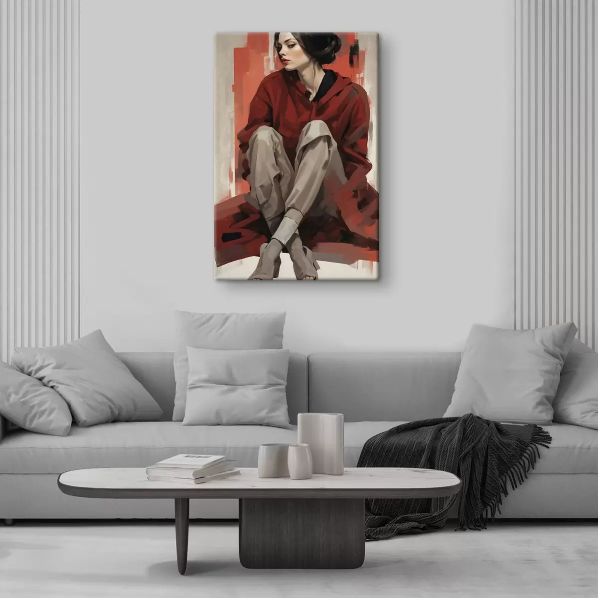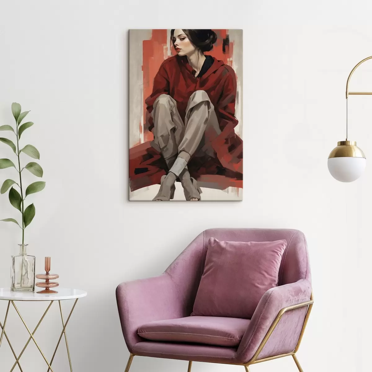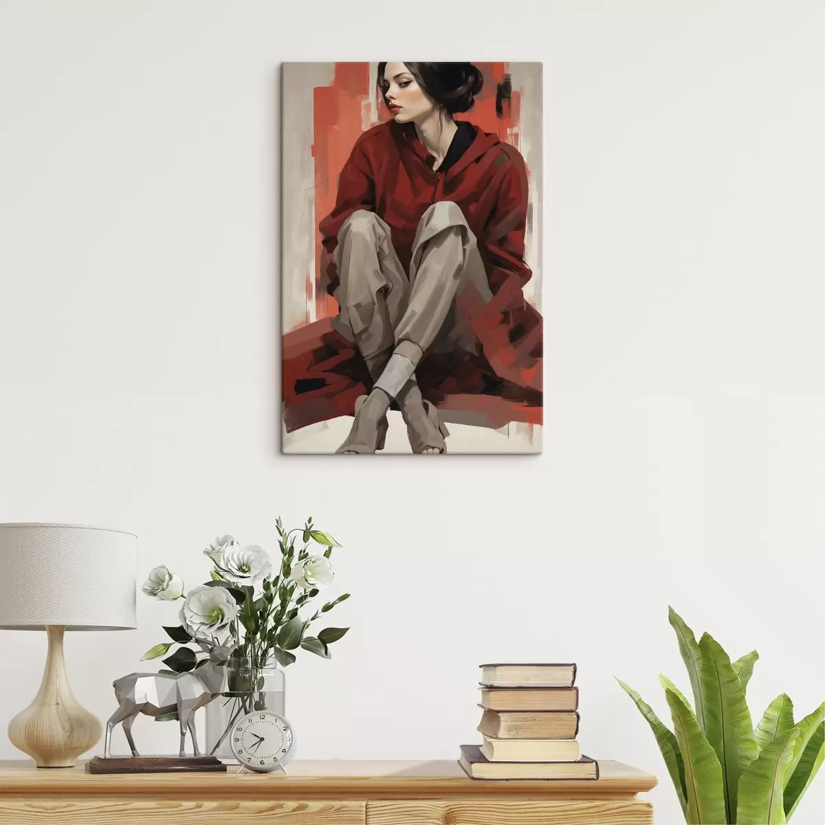 wall murals Girl in a red cloak sitting with folded legs s45624