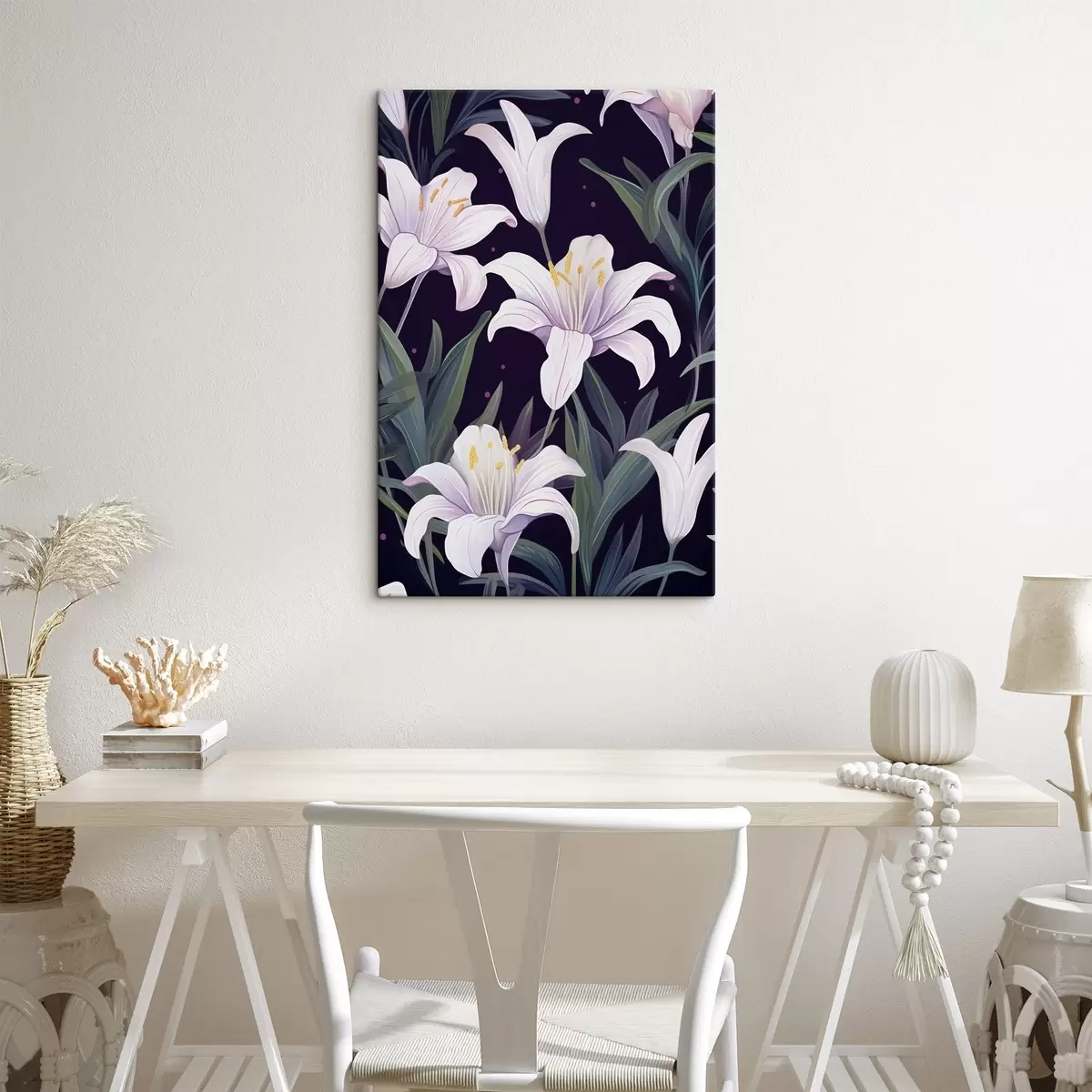 wall murals Delicate lilies on a dark background with green leaves s45697