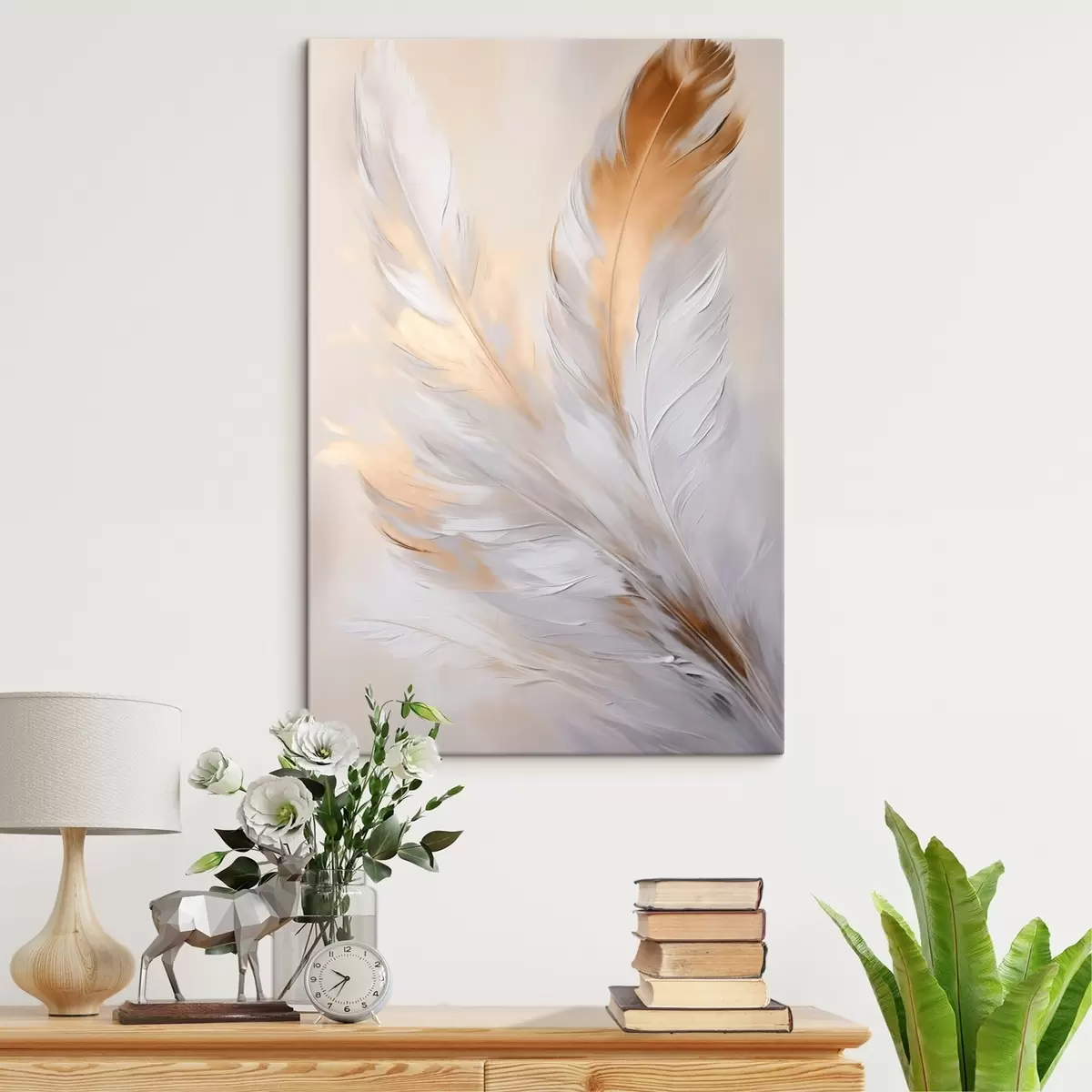 Picture Feathers with orange accents, soft lighting, textured minimalist composition, modern art Nr s45944