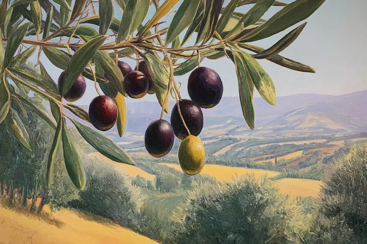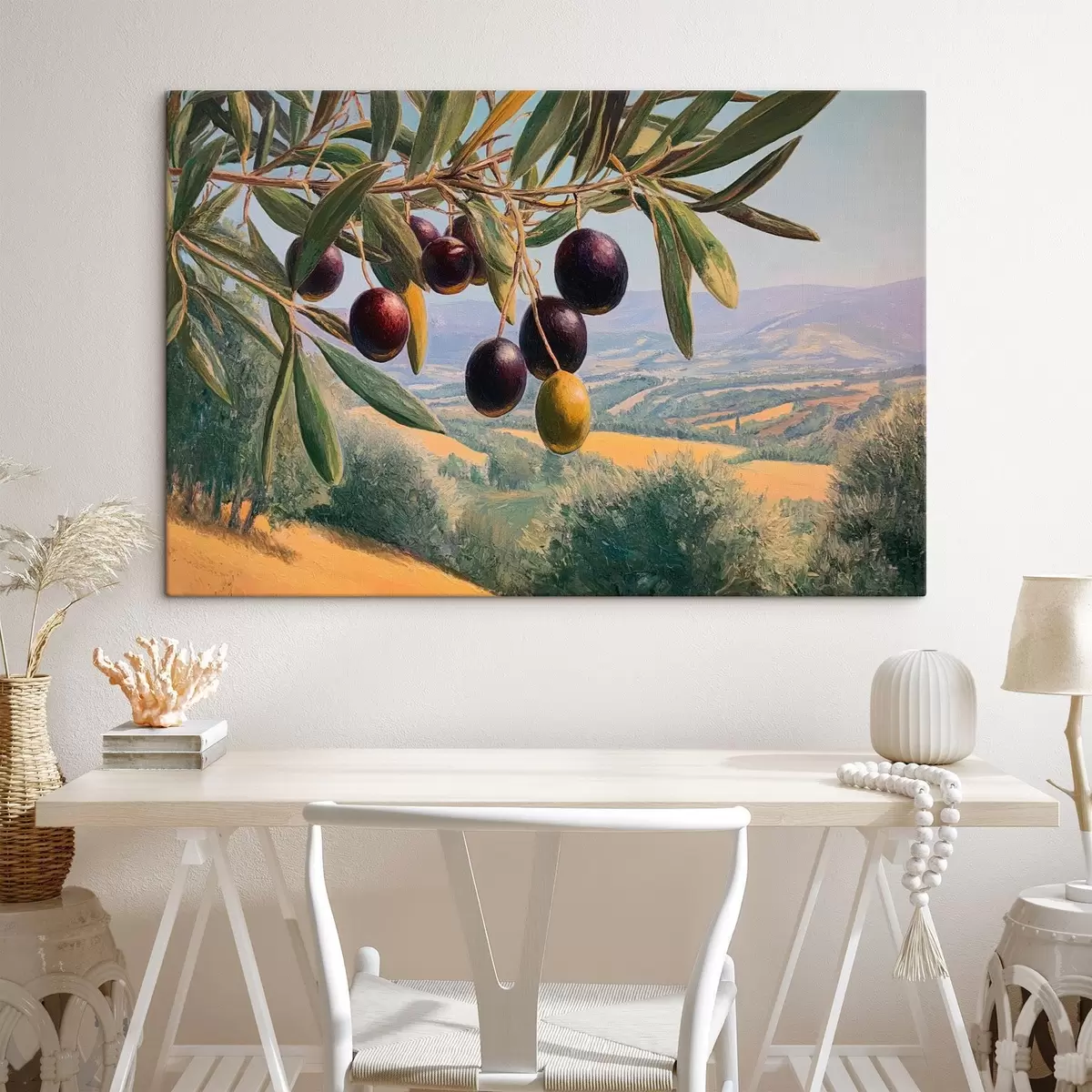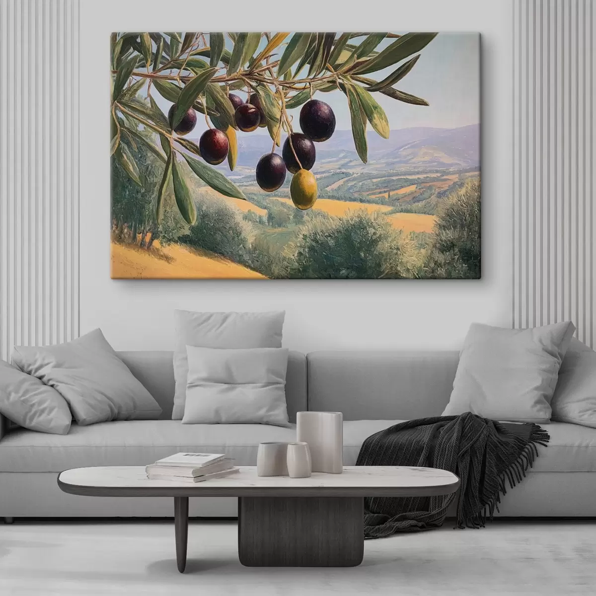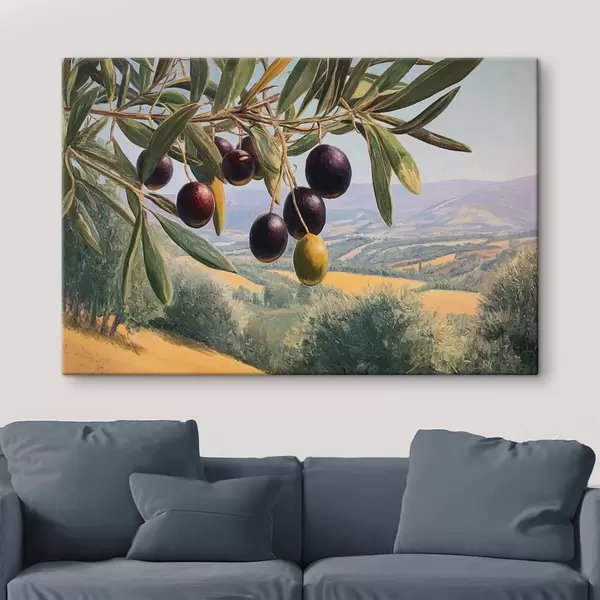 Picture Olive branch with dark fruits against a summer landscape Nr s46150