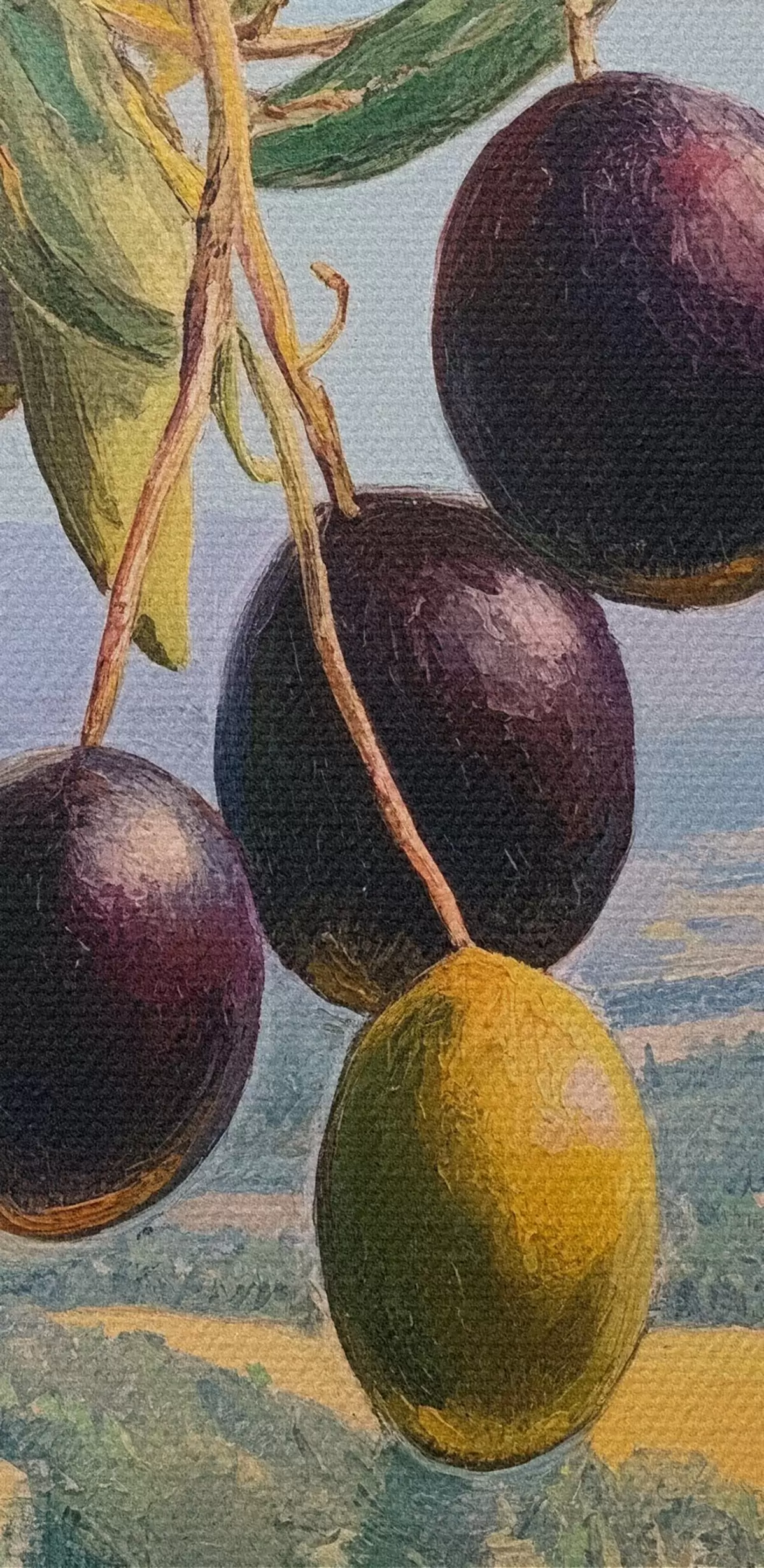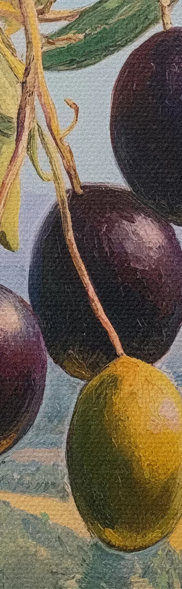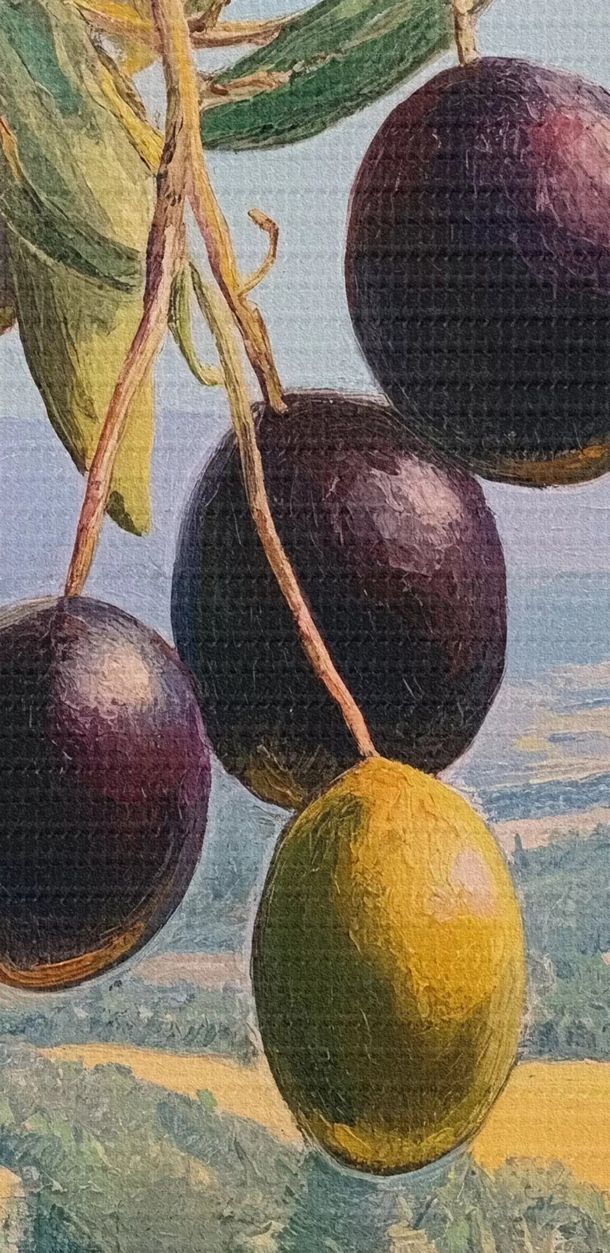 Picture Olive branch with dark fruits against a summer landscape Nr s46150