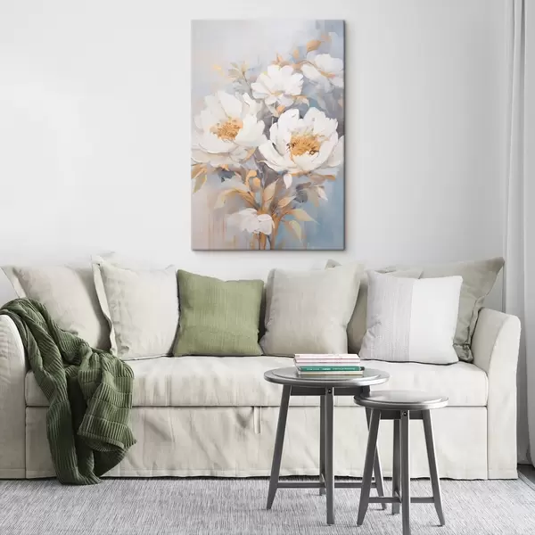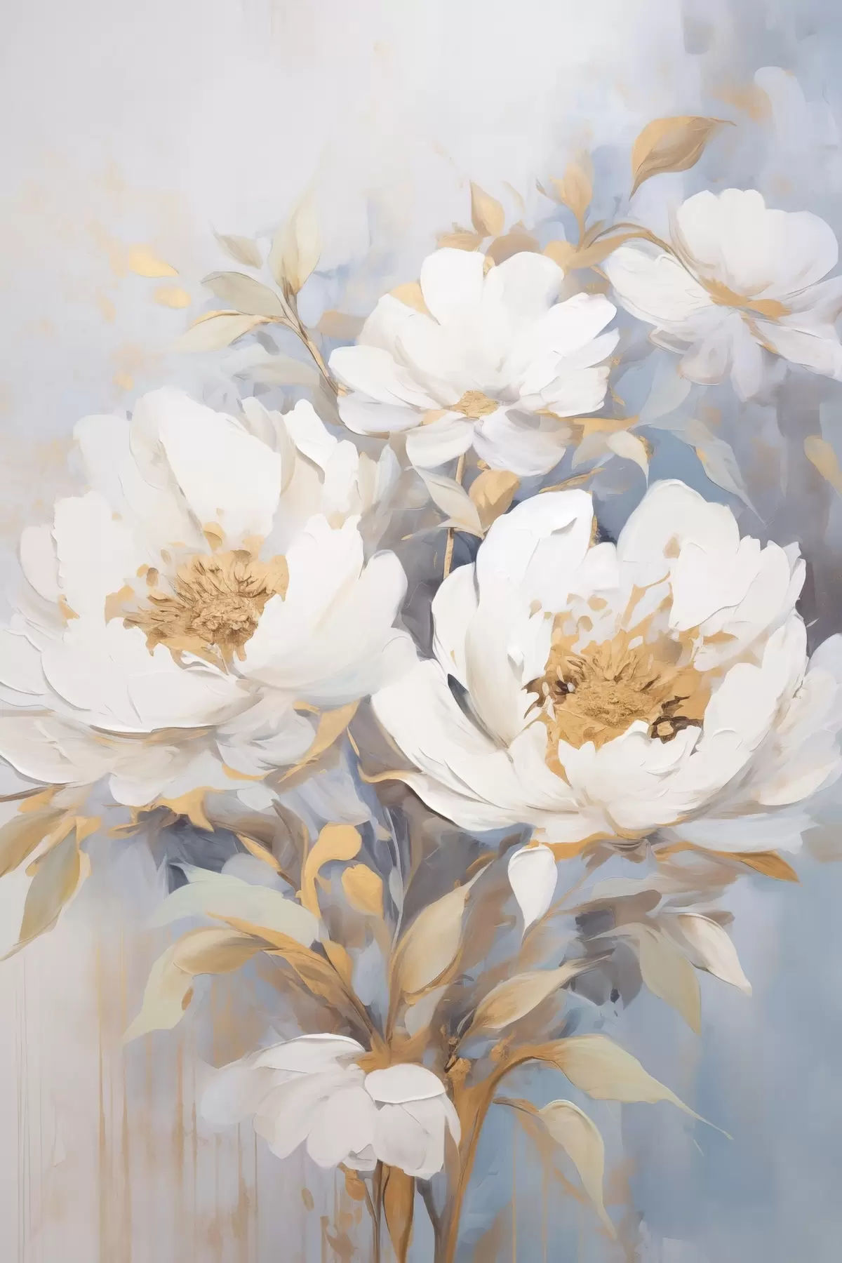 Picture White peonies with yellow centers and leaves, soft brushstrokes, light blue background, floral arrangement Nr s46270