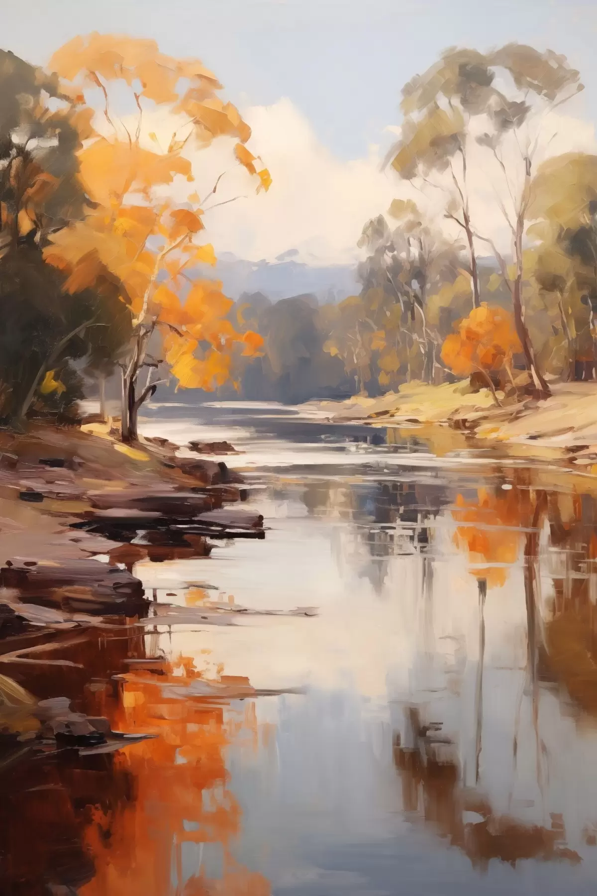 Picture Autumn landscape, river with trees on the shore, forest in the background, reflections on the water Nr s46280