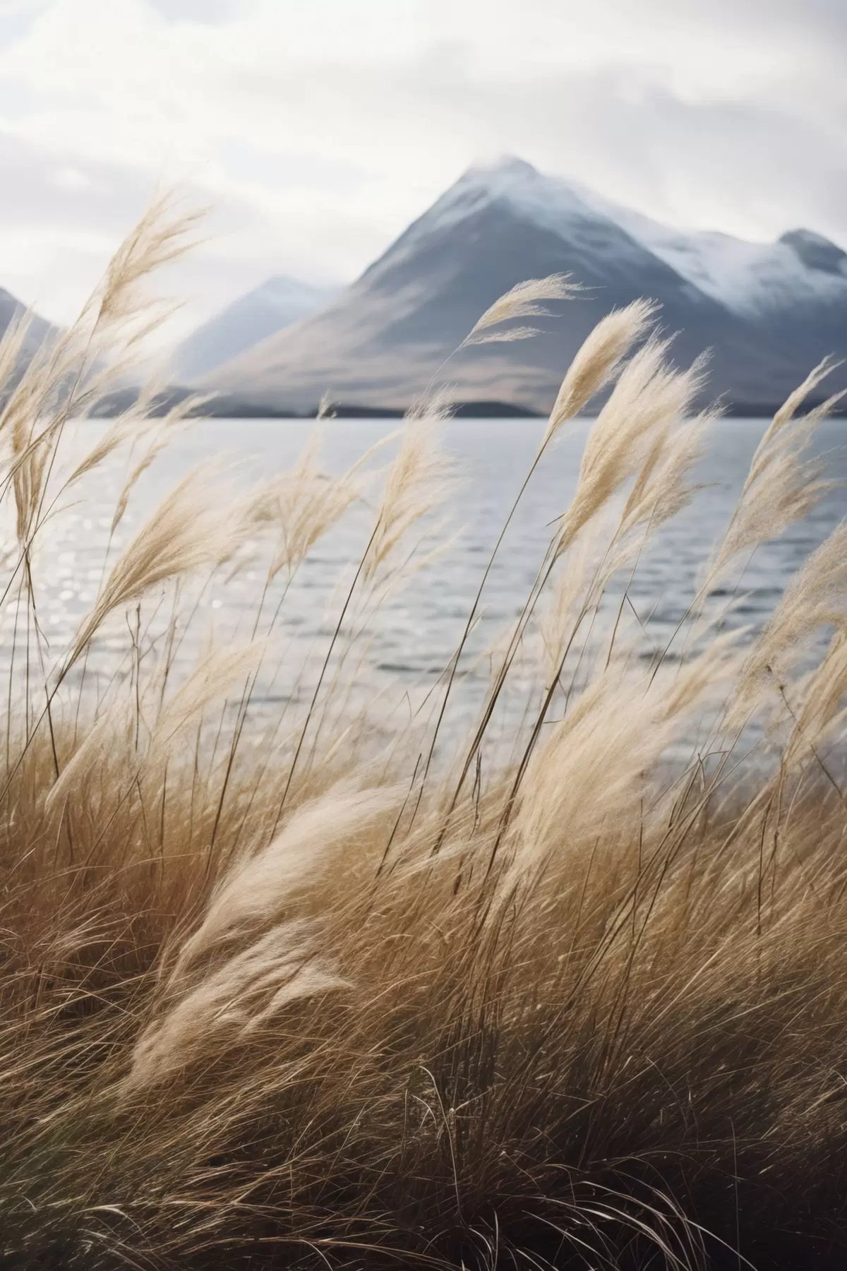 Picture Pampas grass with a lake and mountains in the background, soft lighting, muted colors, naturalistic style Nr s46283