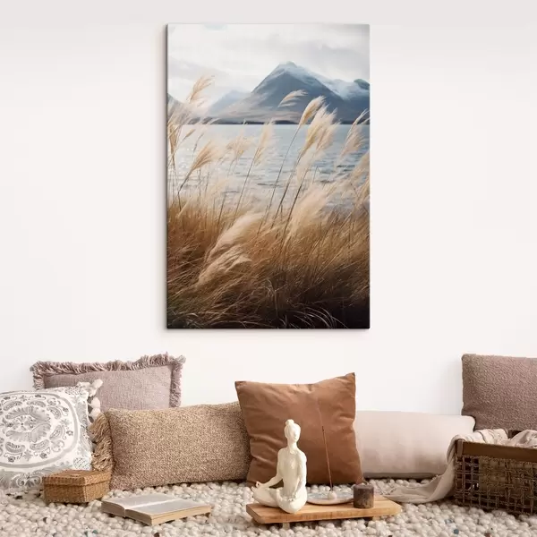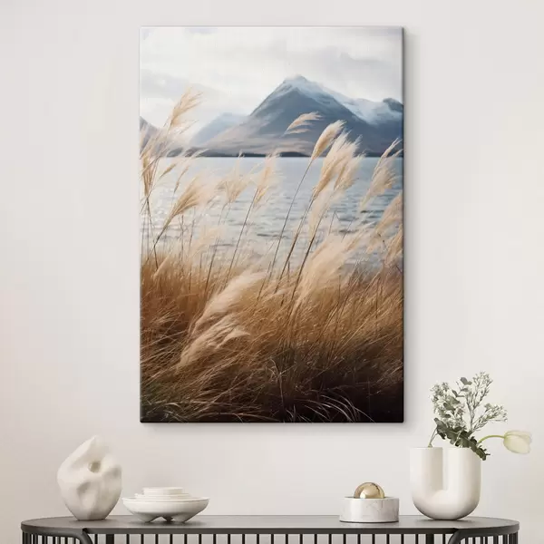wall murals Pampas grass with a lake and mountains in the background, soft lighting, muted colors, naturalistic style s46283