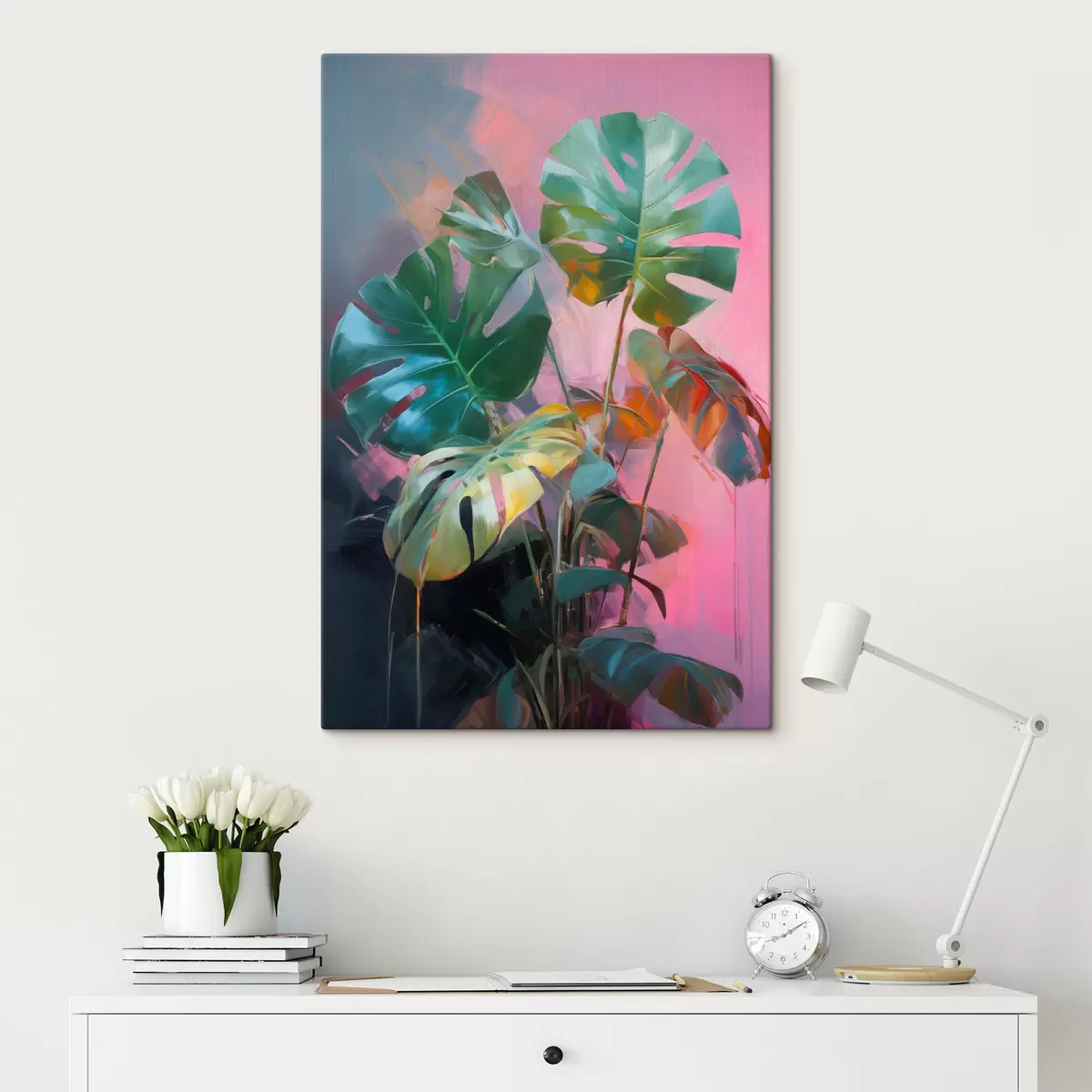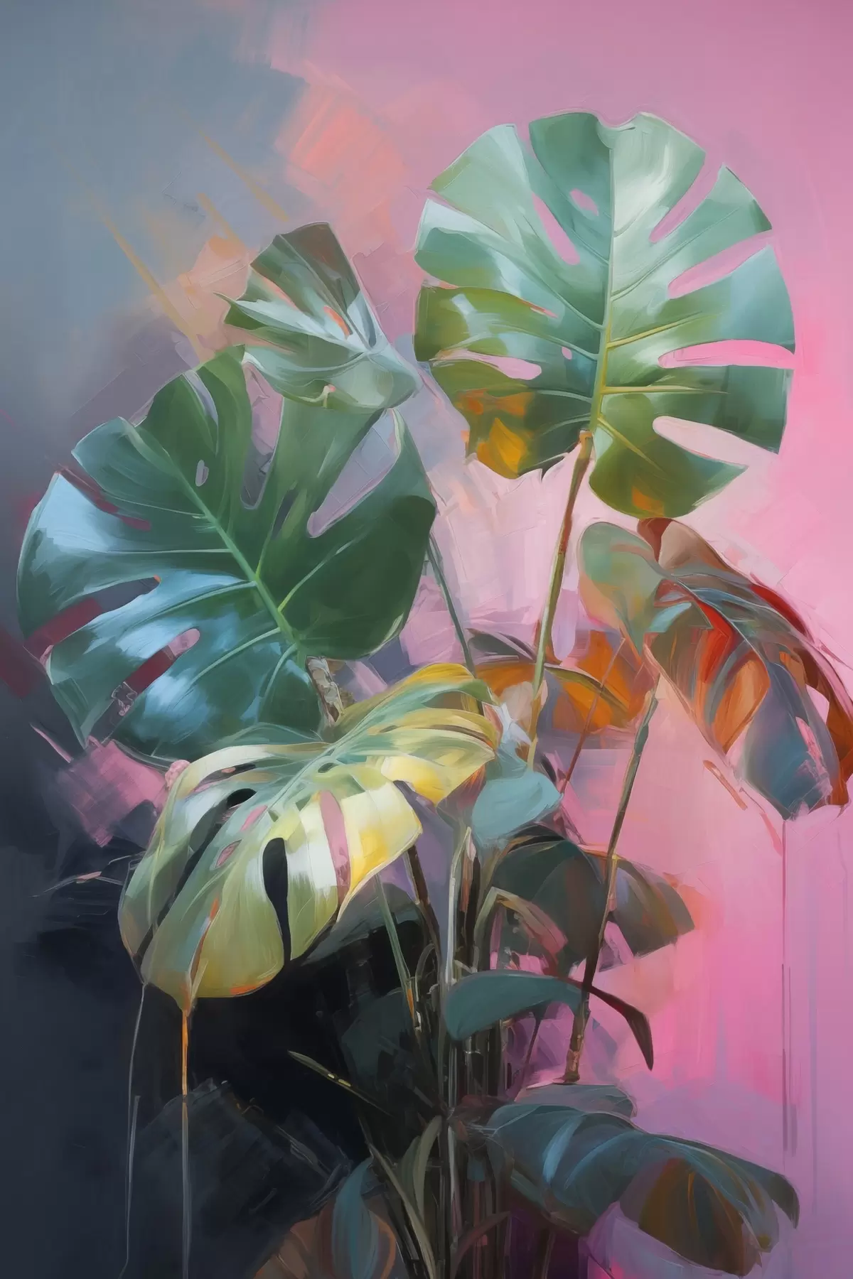 Picture Abstract monstera plant with vibrant green leaves, against a backdrop of soft pink and purple hues Nr s46286