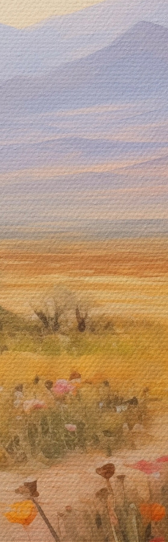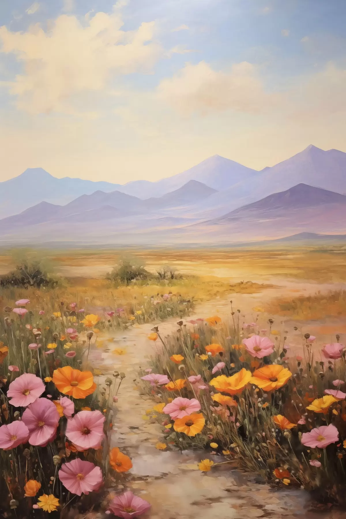 Picture Landscape, a field of colorful flowers with mountains in the background, soft and pastel colors Nr s46686
