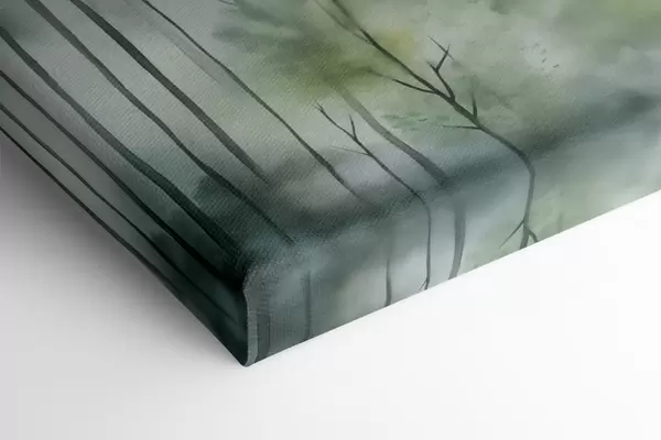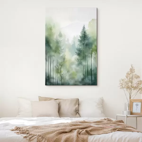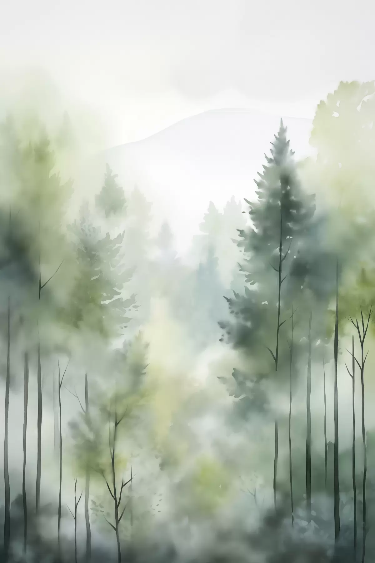 Picture Watercolor painting imitation of a misty forest with tall pine trees and mountains in the background Nr s46690