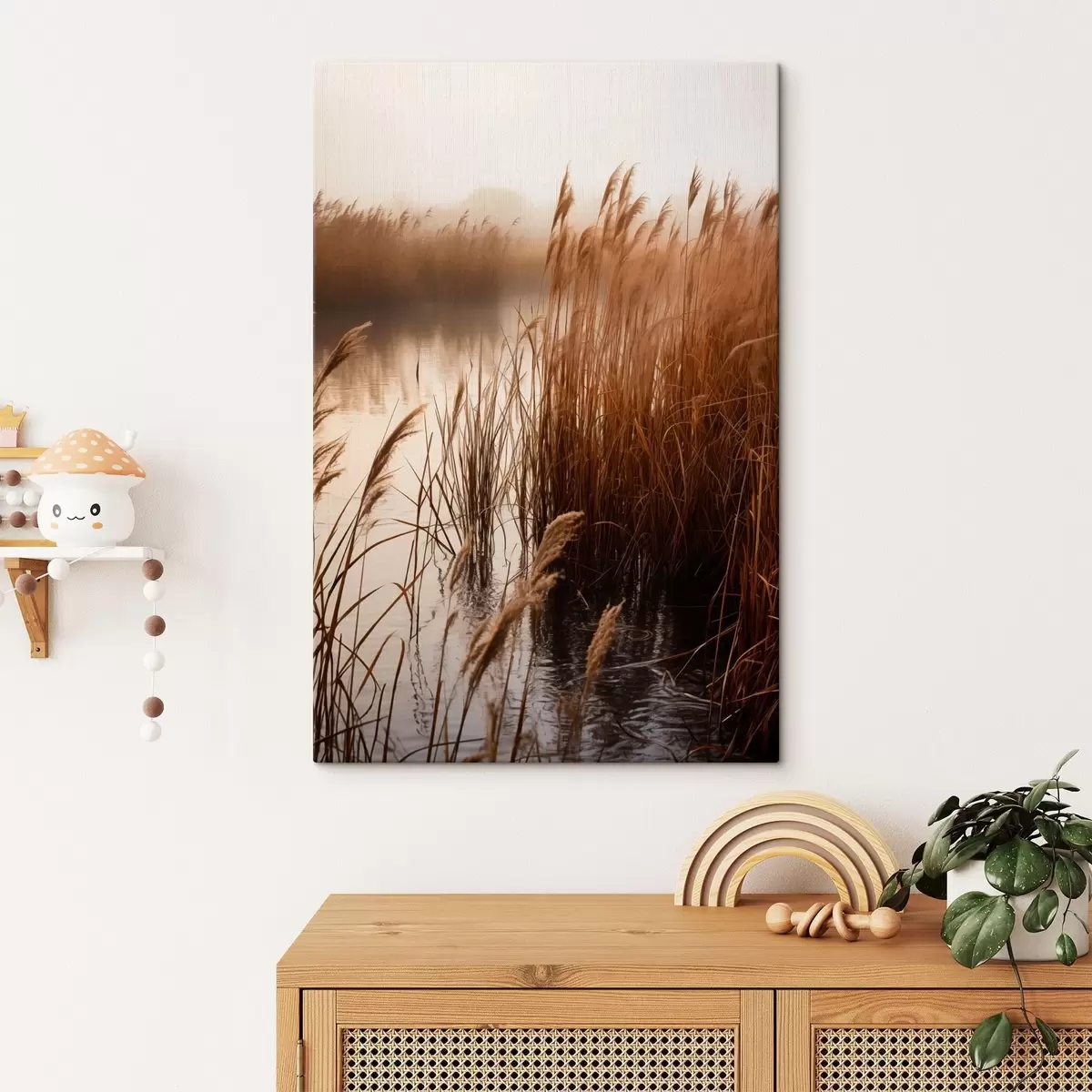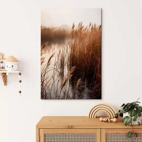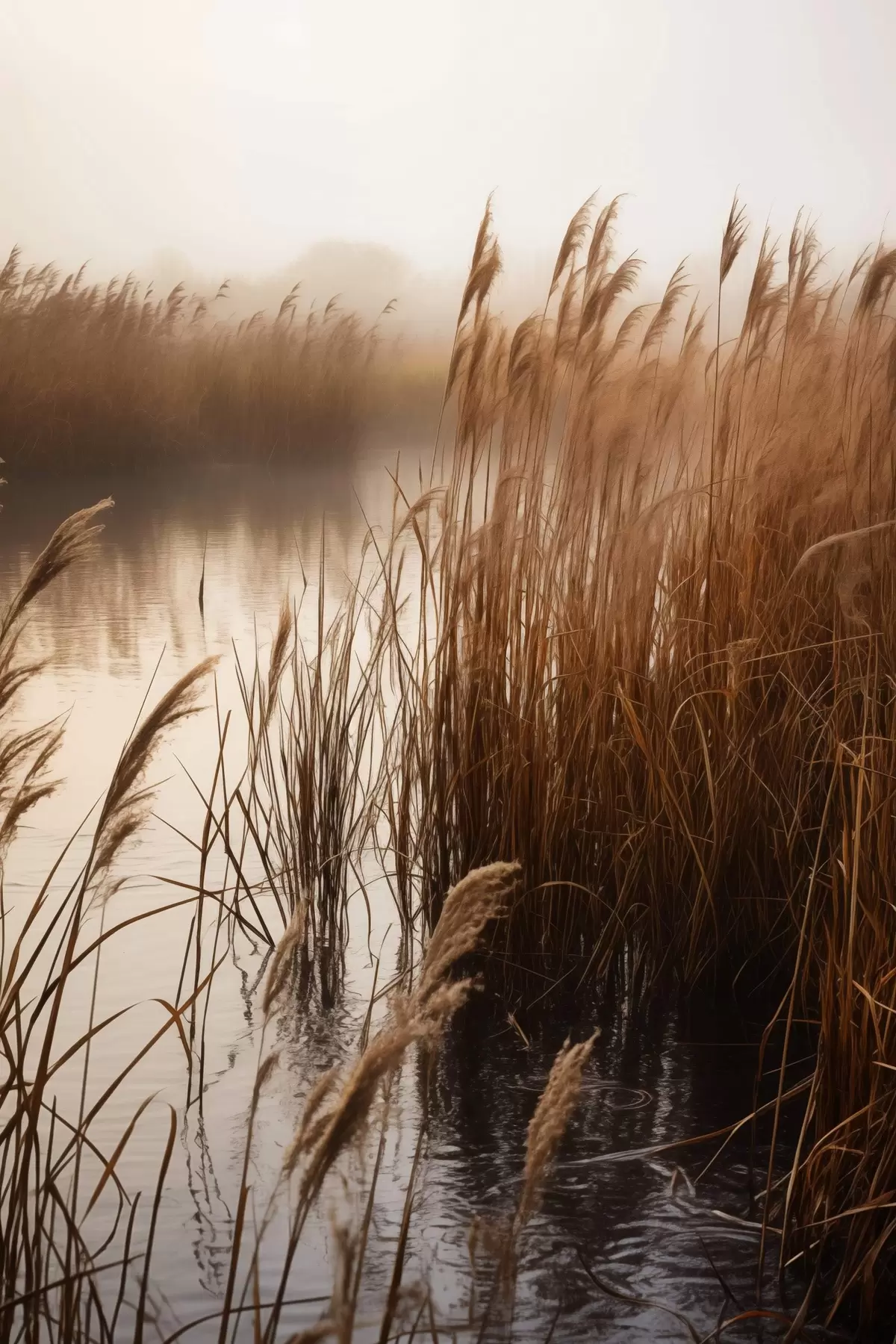 Picture Tall reeds growing in a body of water, the water reflects the reeds, foggy background, soft light, nature scene Nr s46695