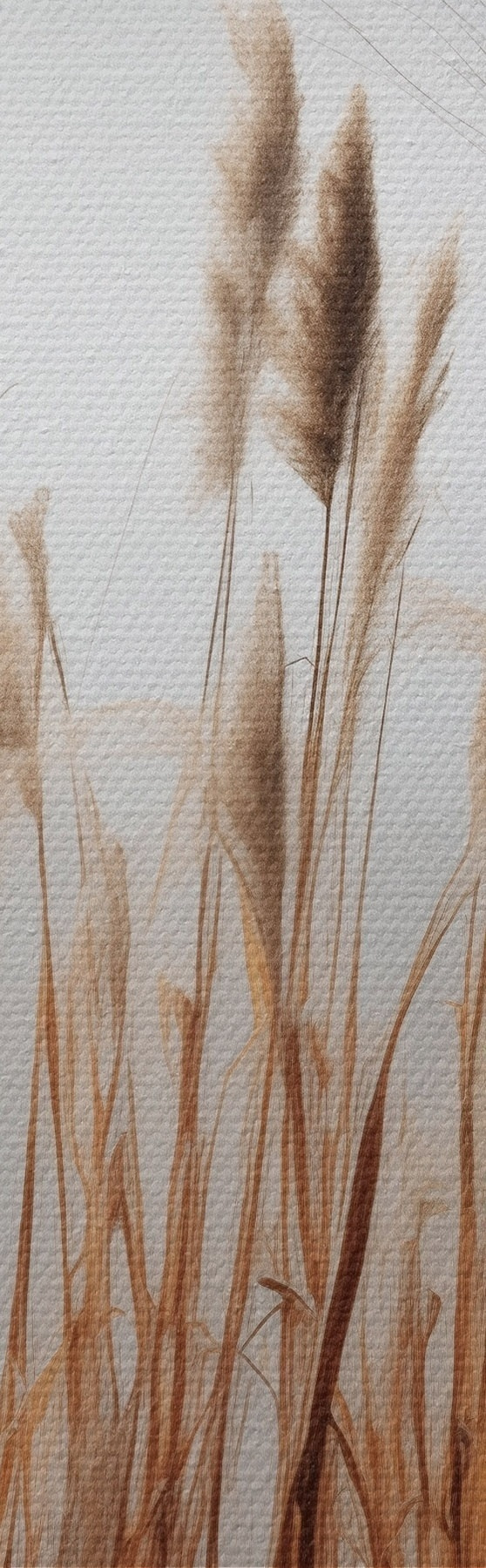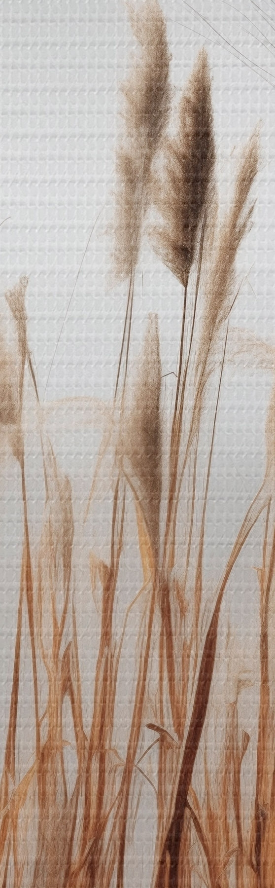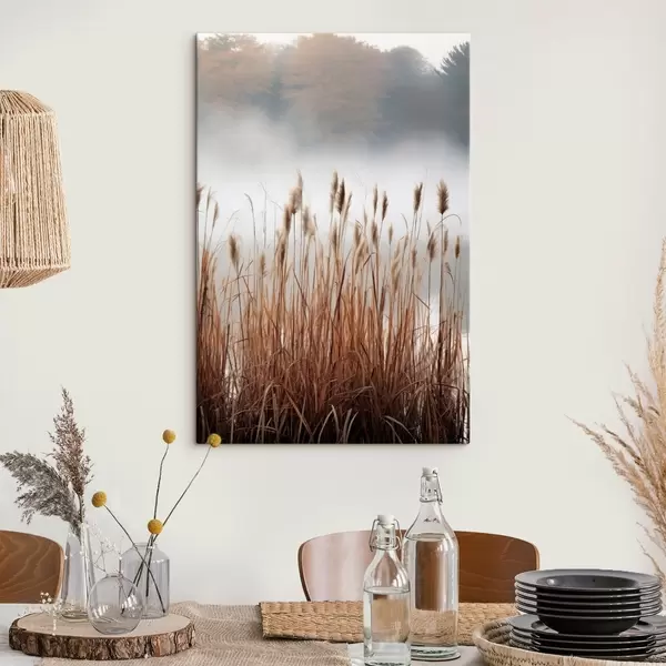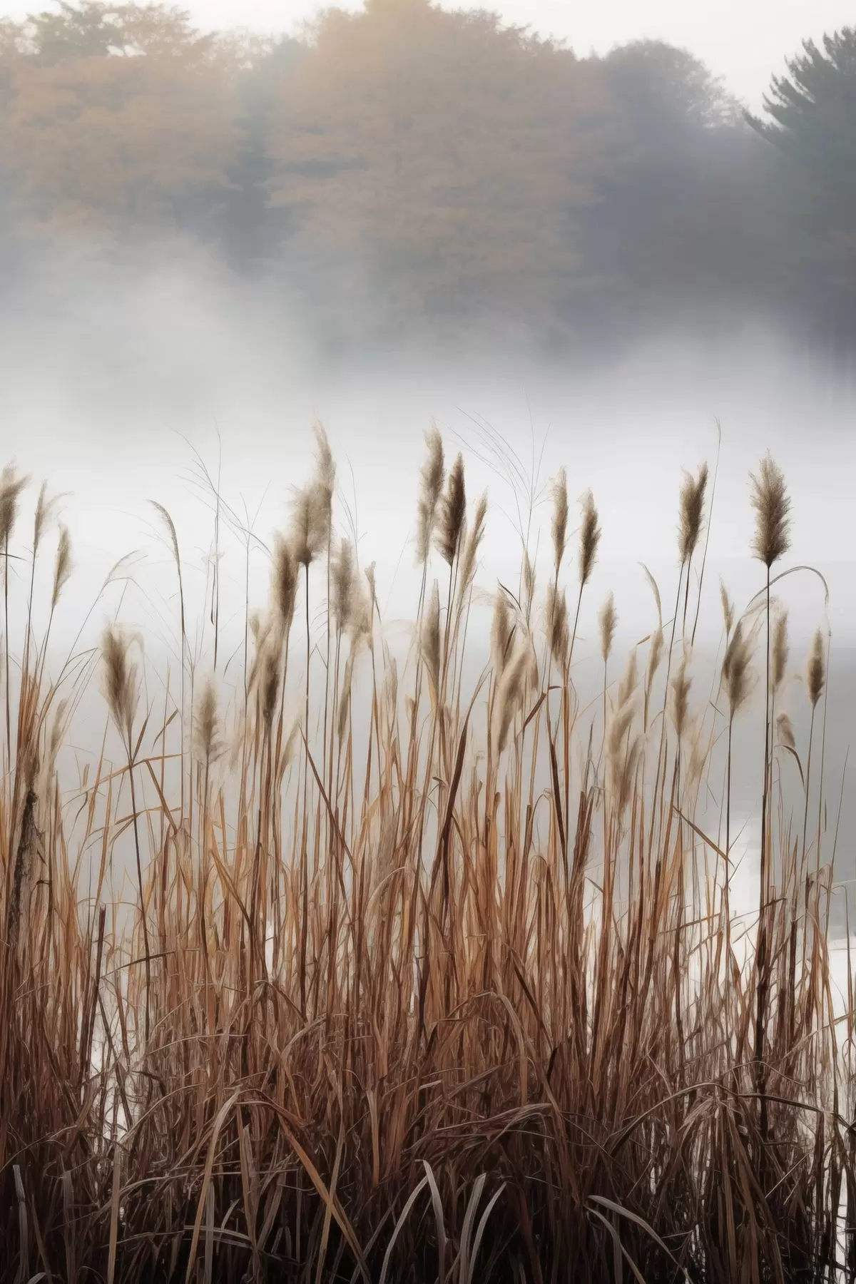 Picture Tall reeds growing in a body of water, the water reflects the reeds, foggy background, soft light, nature scene Nr s46696