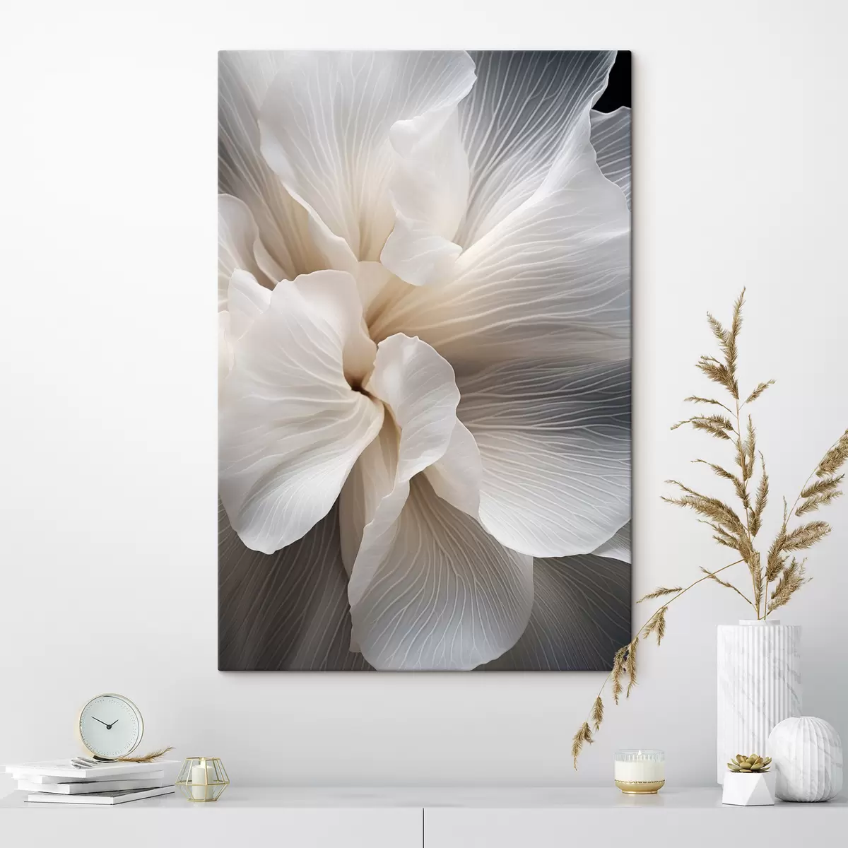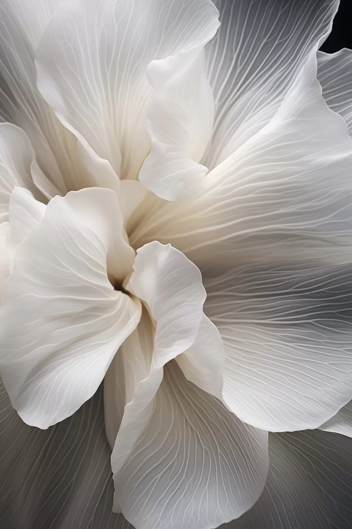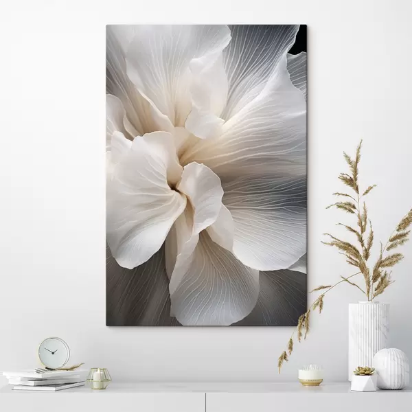 Picture Close-up of delicate abstract white floral petals with intricate lines and a blurred dark background Nr s47018