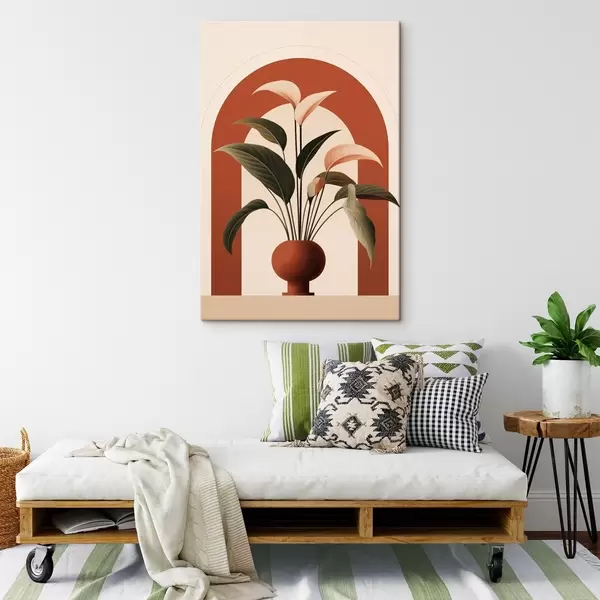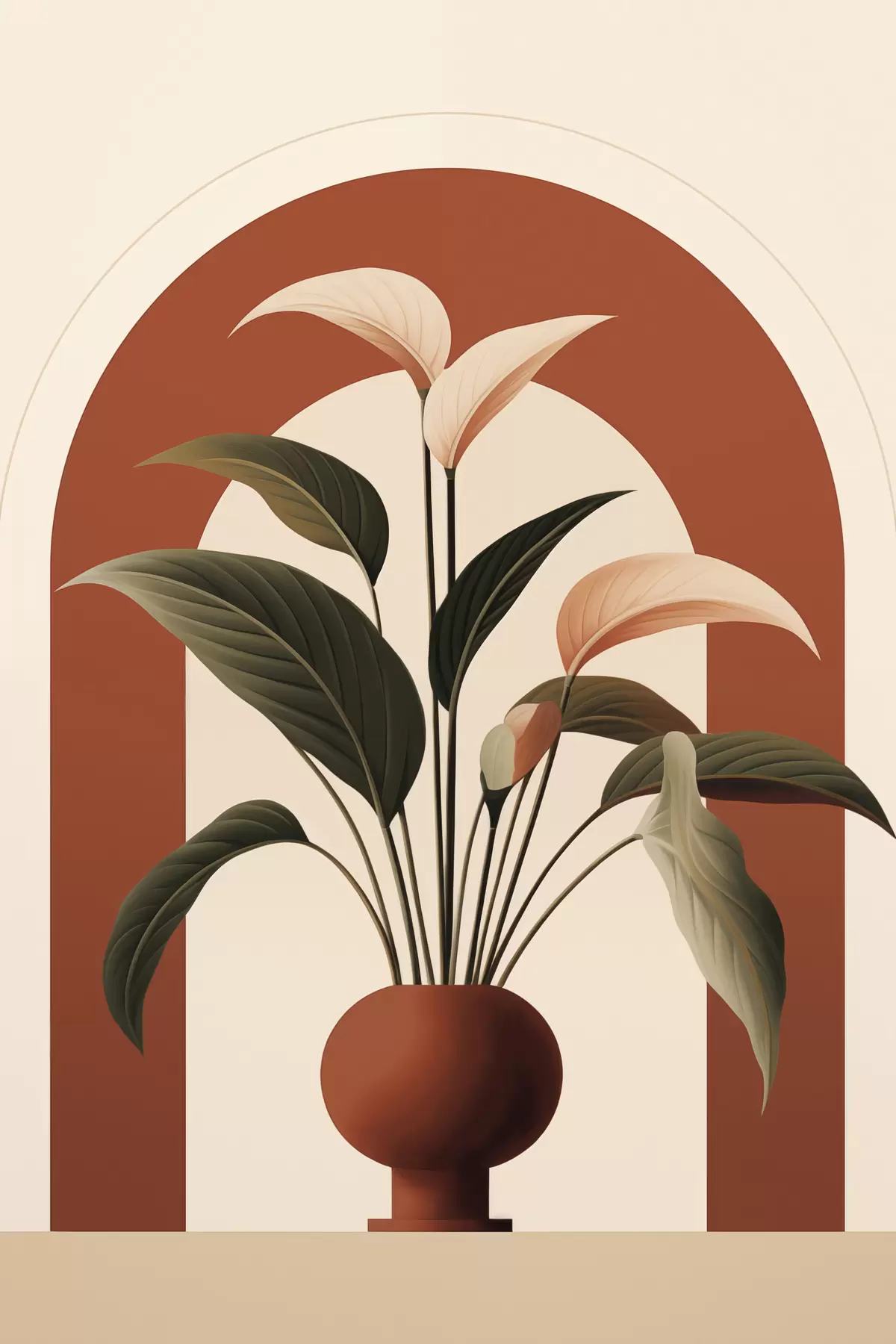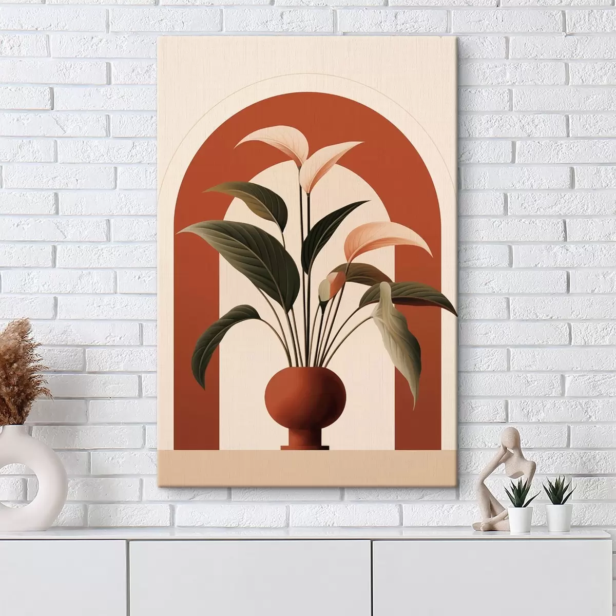 wall murals Abstract potted plant with large green and beige leaves in front of a cream-colored archway with a terracotta accent s47032