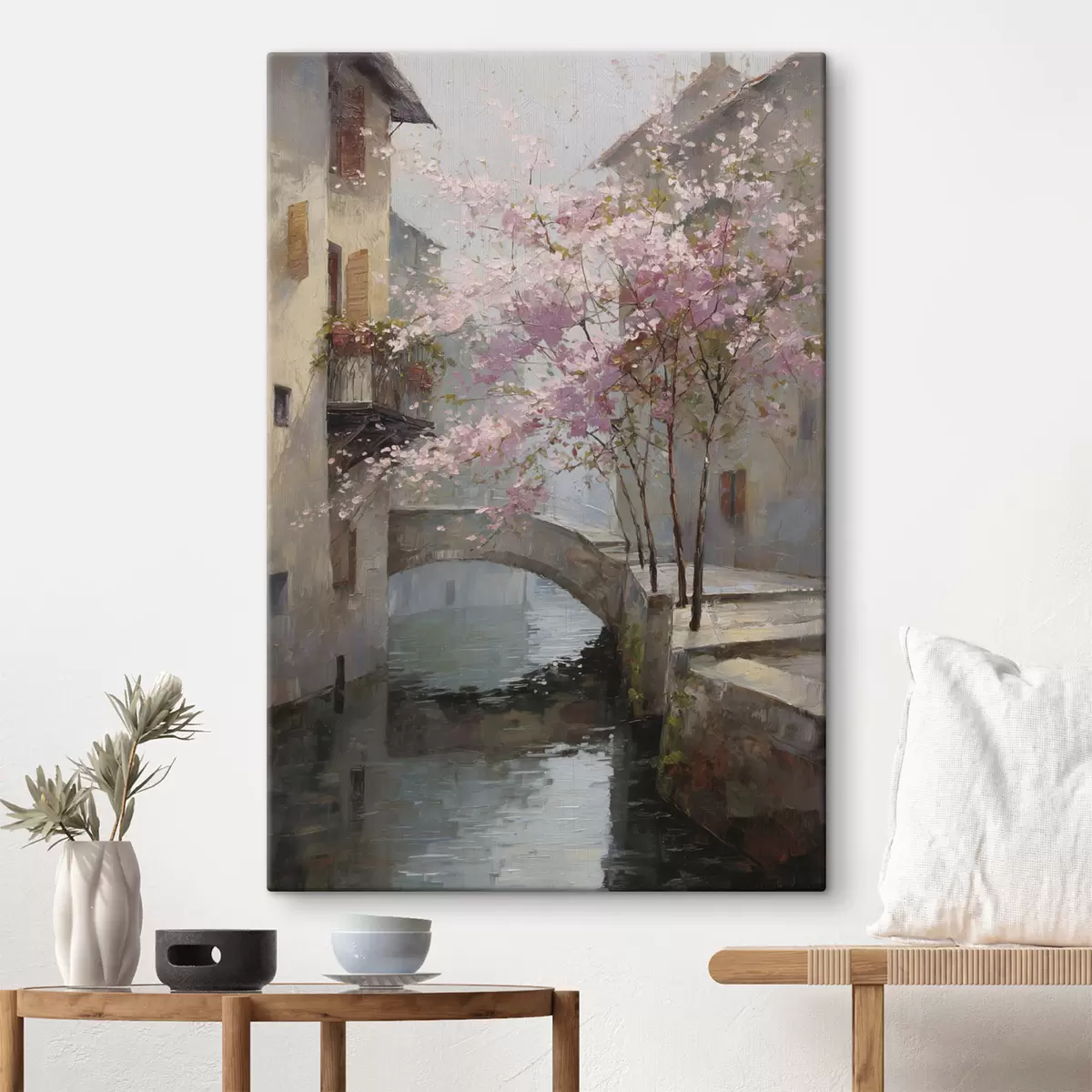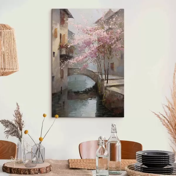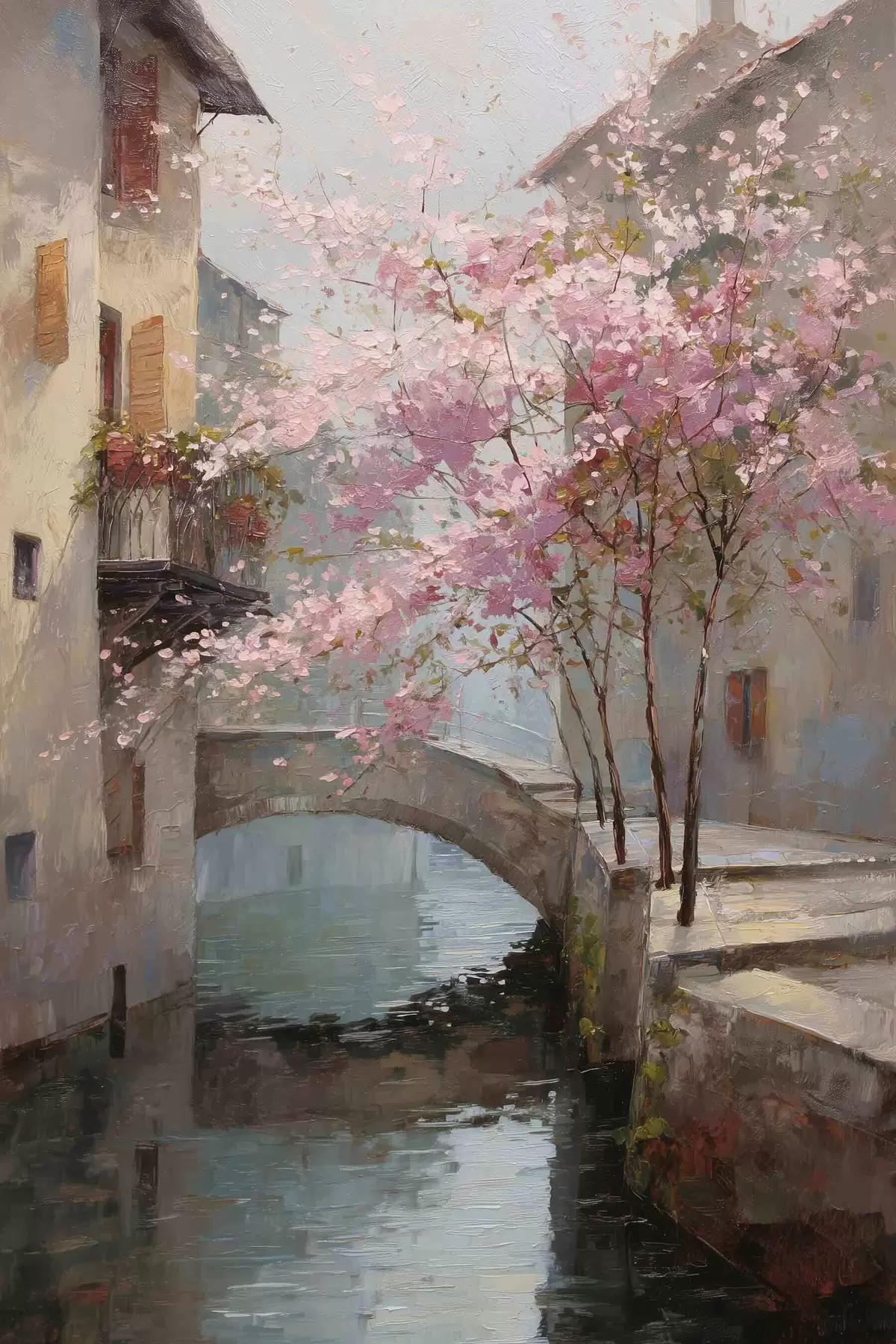 Picture romantic cityscape with a blossoming tree in the style of oil painting Nr s47127