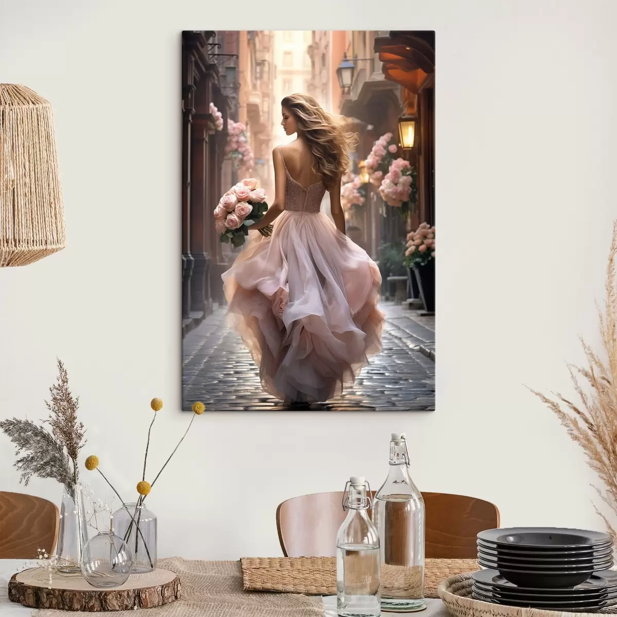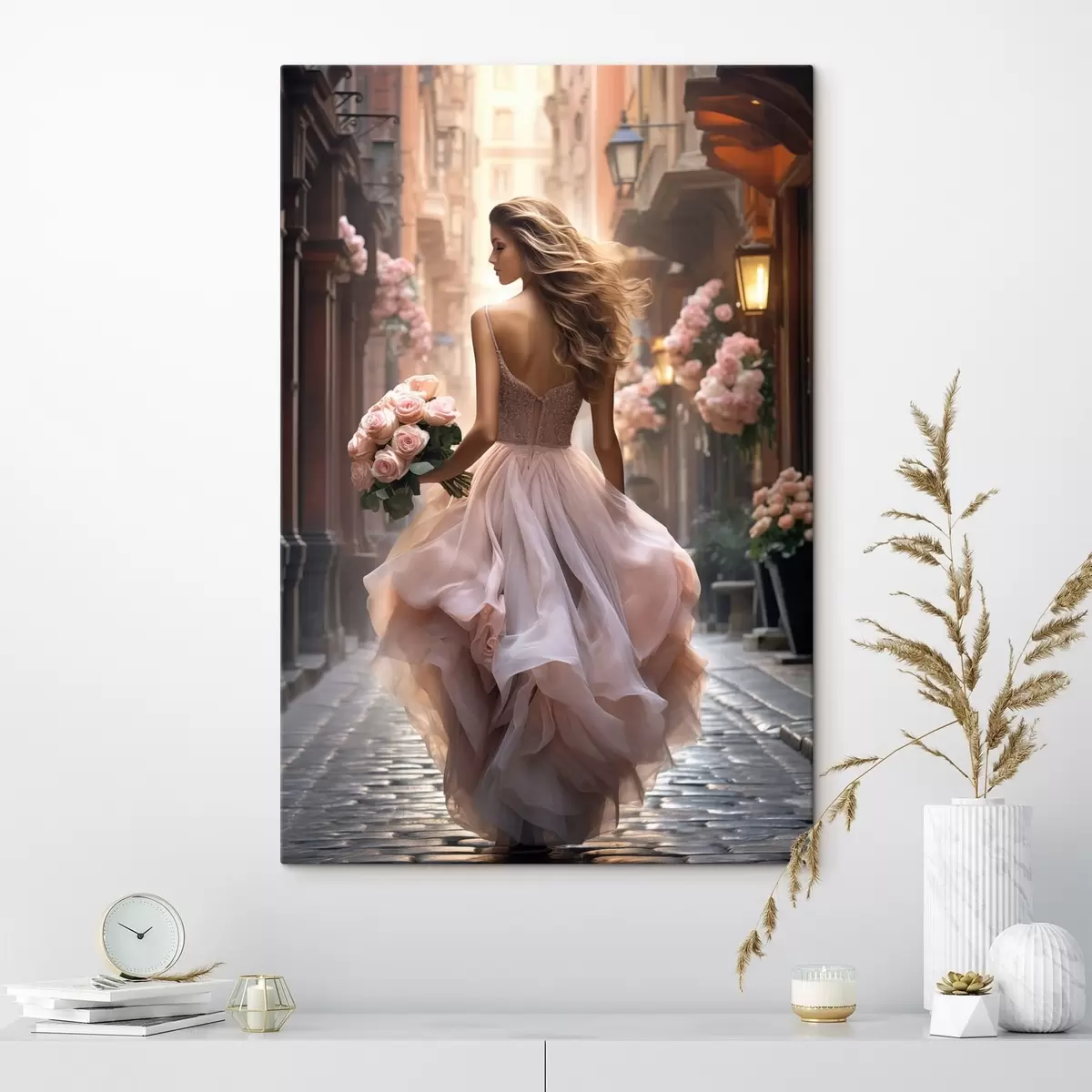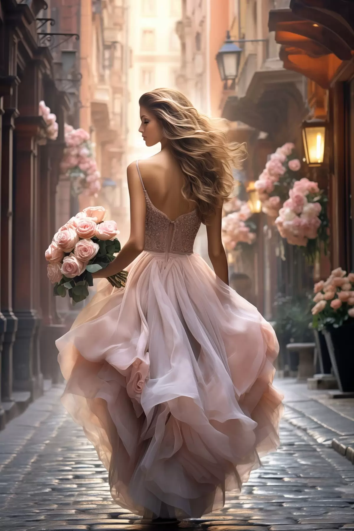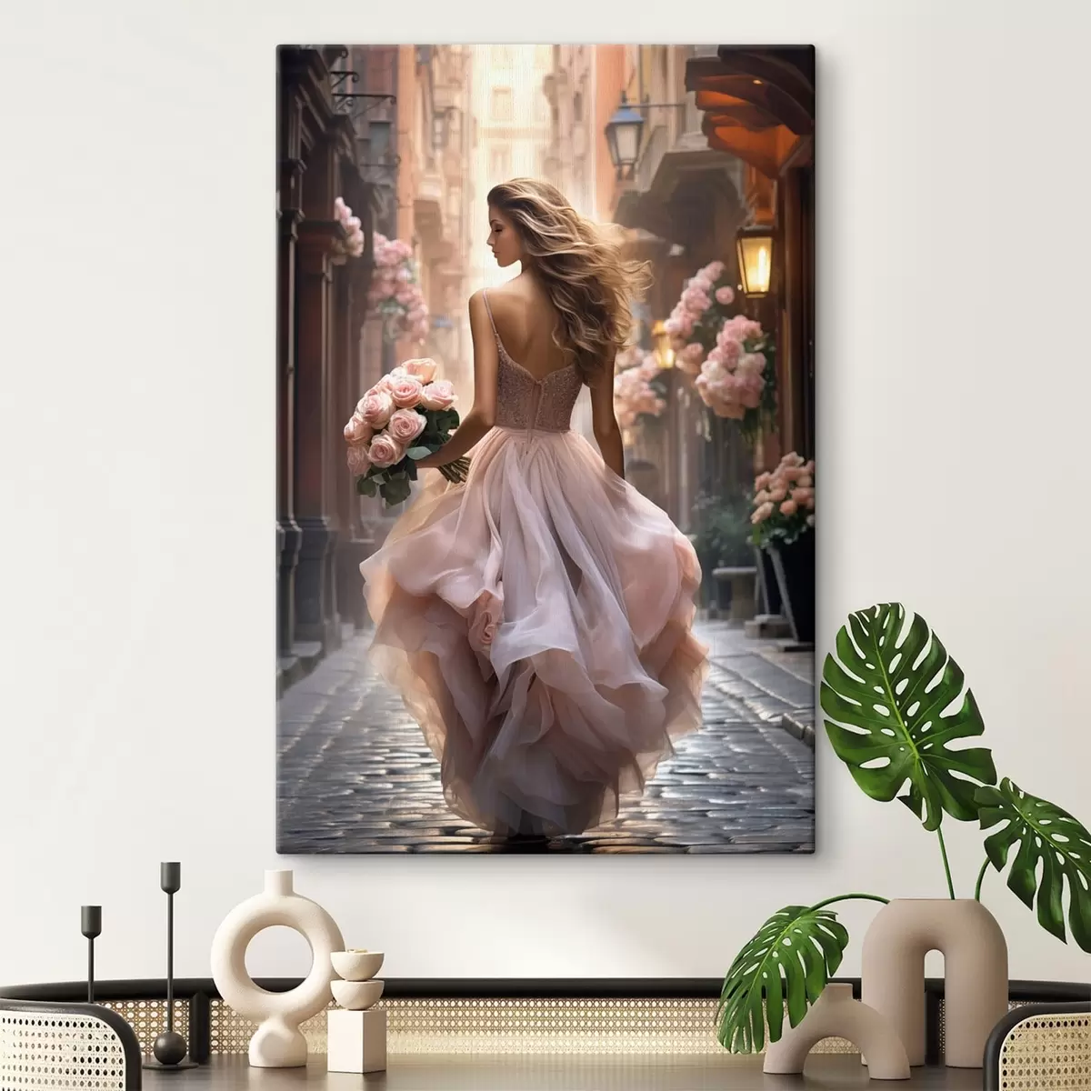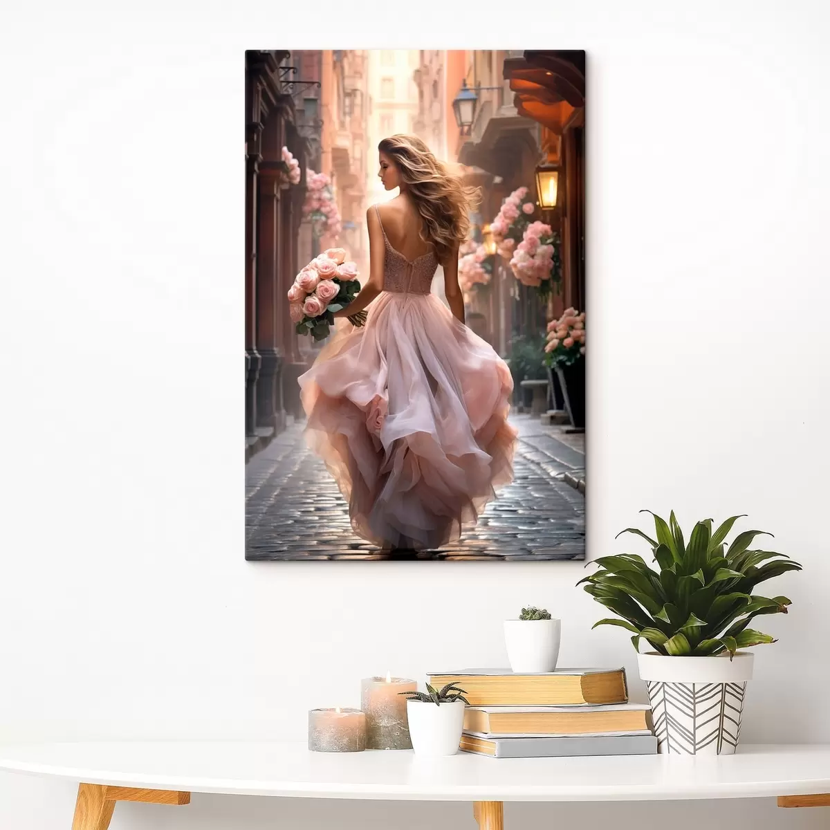 Picture Woman in a pink dress walking down a street Nr s47316
