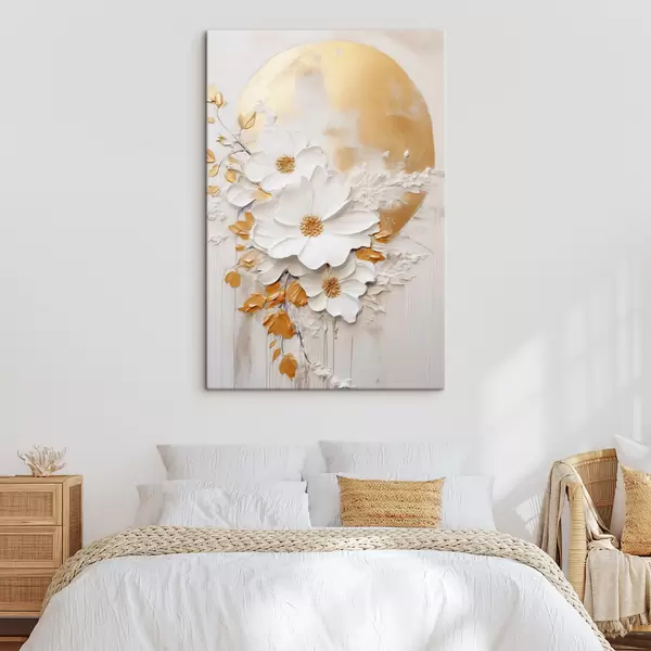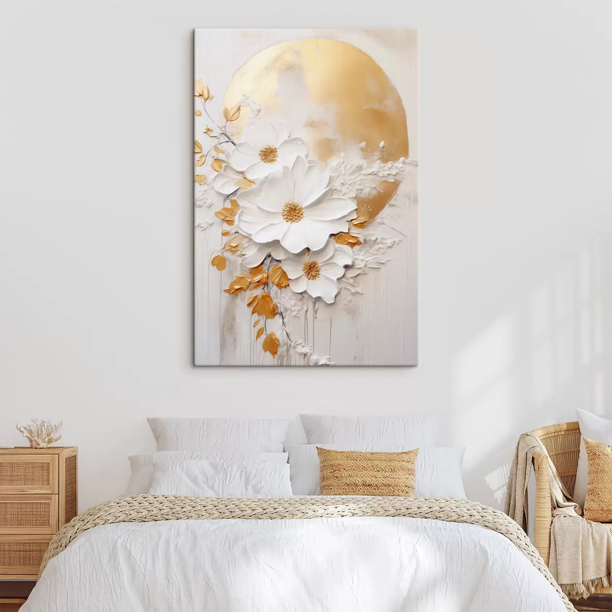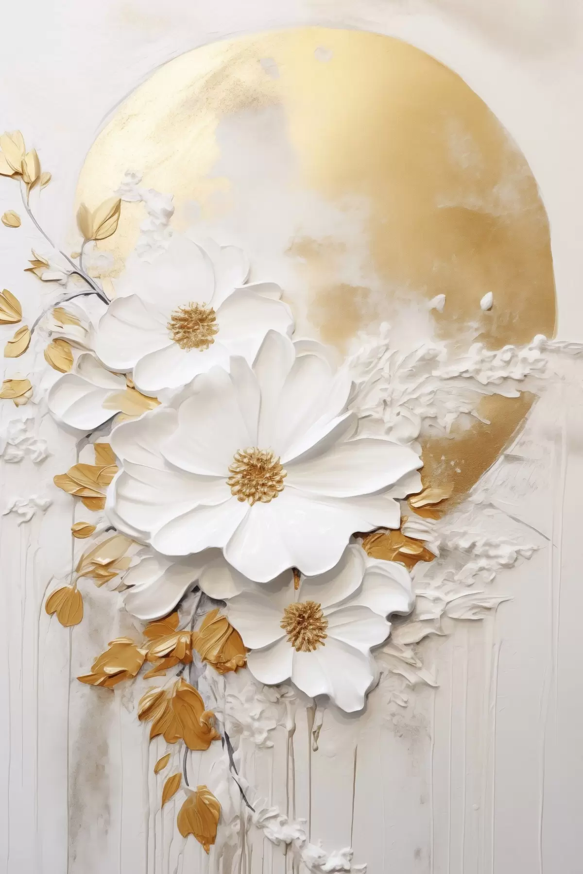 Picture White flowers with yellow accents and delicate leaves against a textured background, modern art Nr s47414
