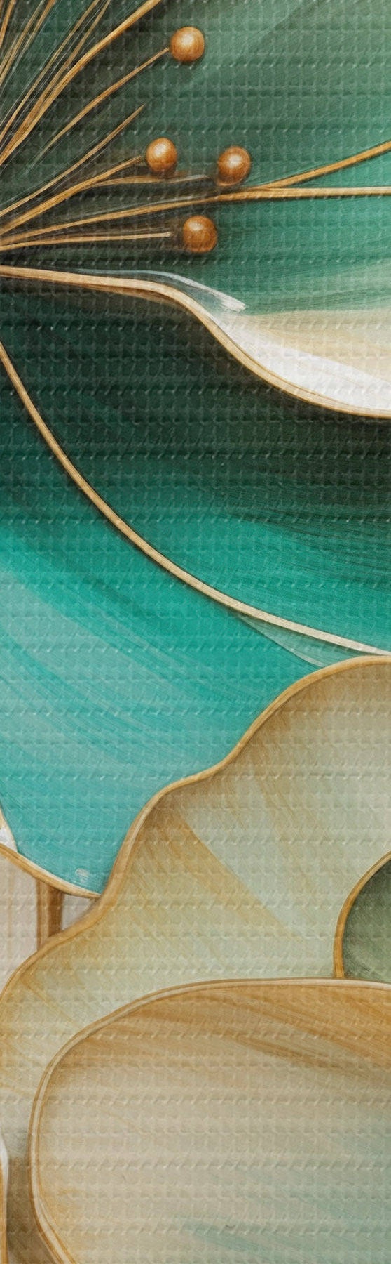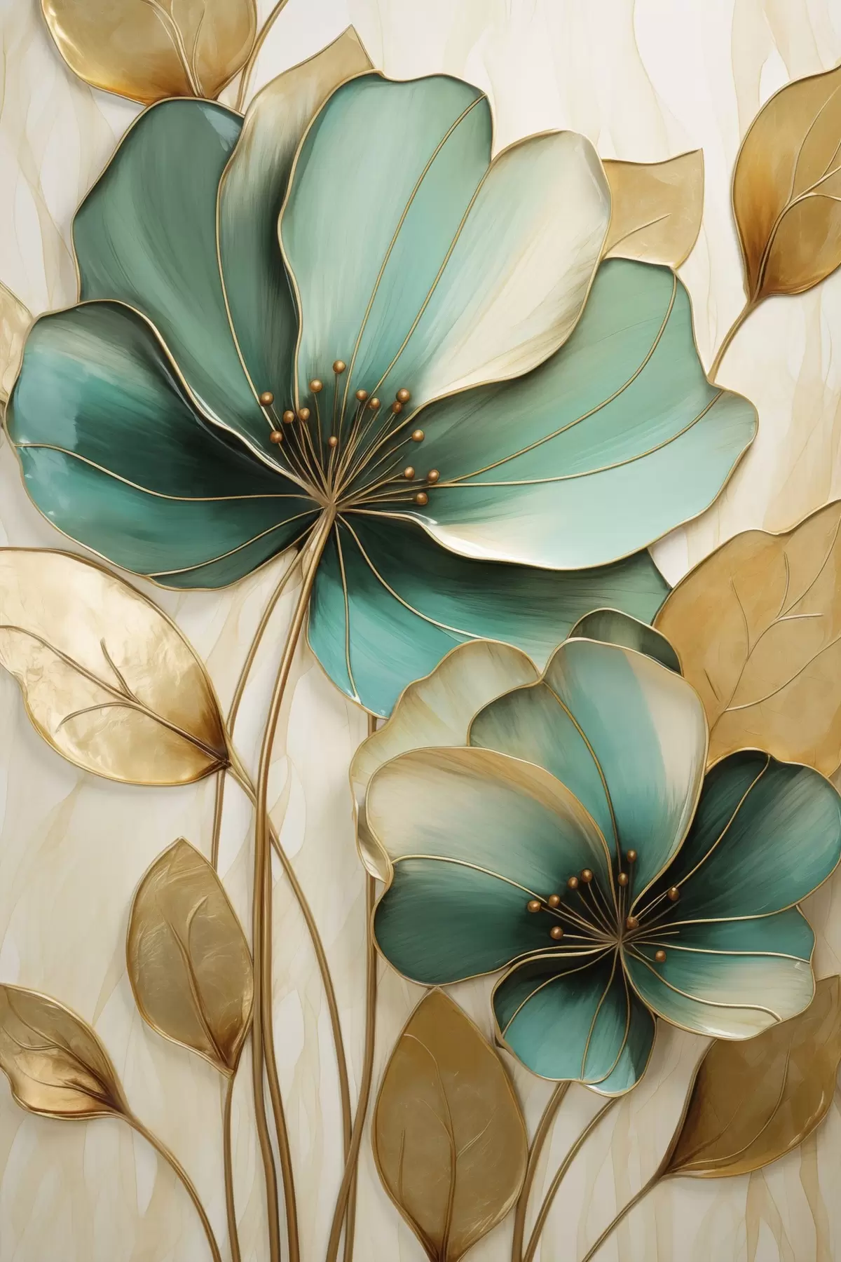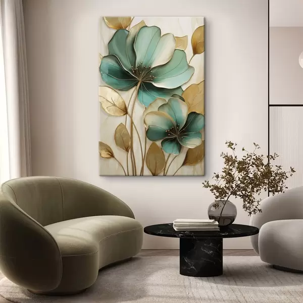 Picture Large teal and yellow flowers with outlines, surrounded by yellow leaves against abstract background Nr s47418