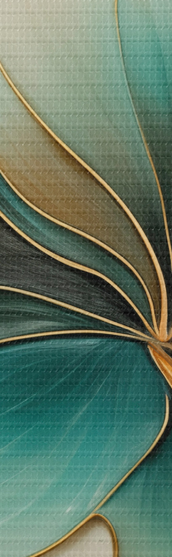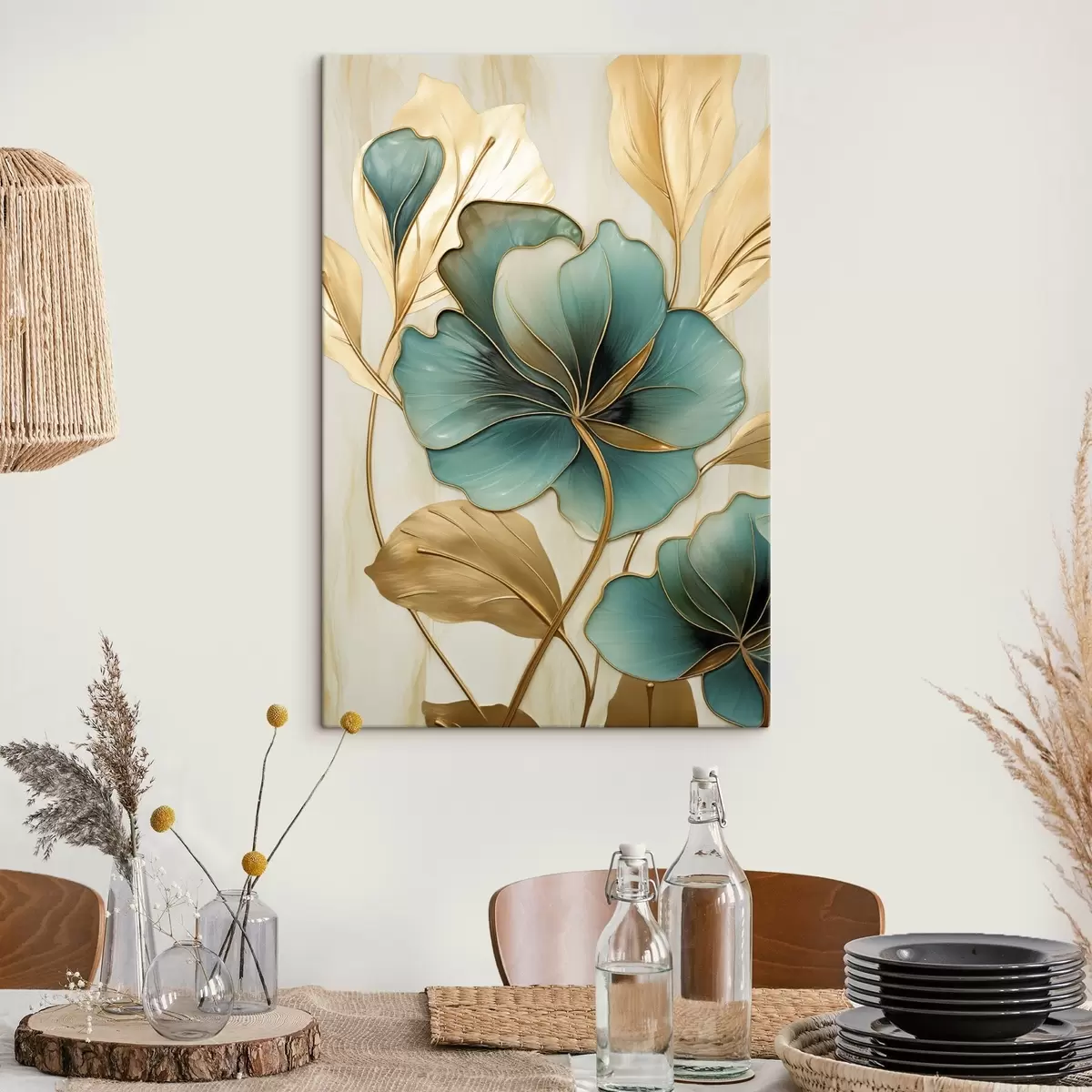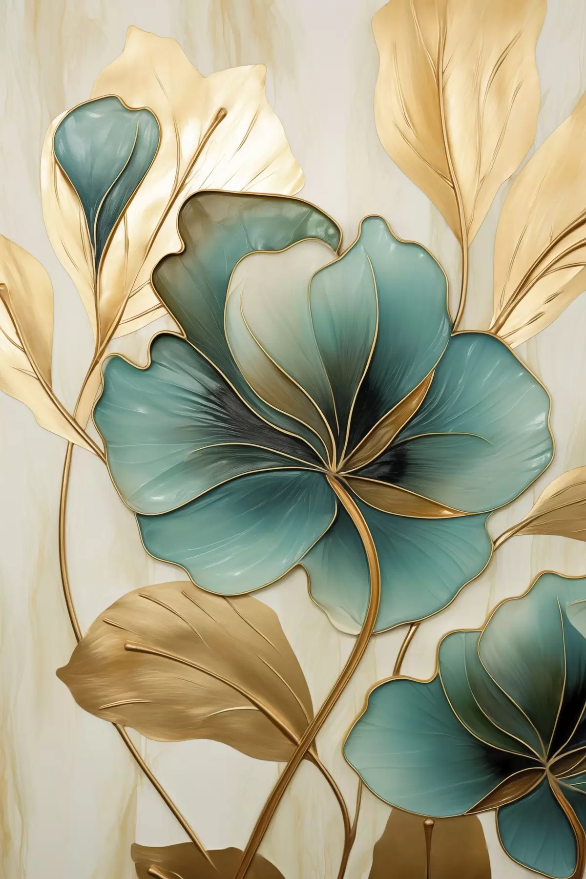 Picture Large teal and yellow flowers with outlines, surrounded by yellow leaves against abstract background Nr s47419
