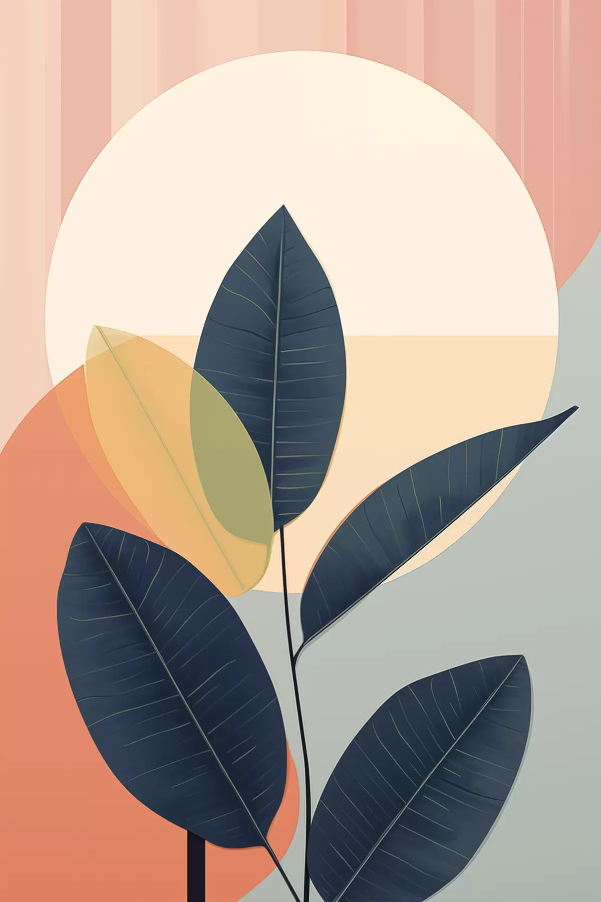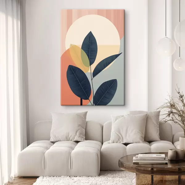 Picture Dark leaves against a background of abstract shapes in peach and gray with a large, pale yellow circle Nr s47424