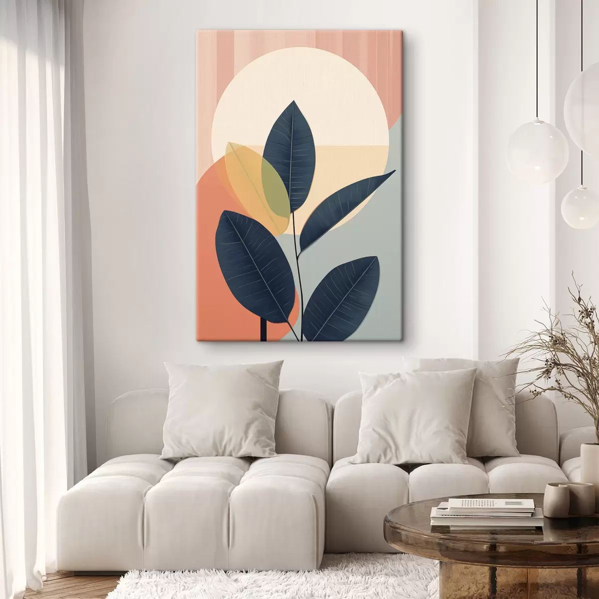 wall murals Dark leaves against a background of abstract shapes in peach and gray with a large, pale yellow circle s47424