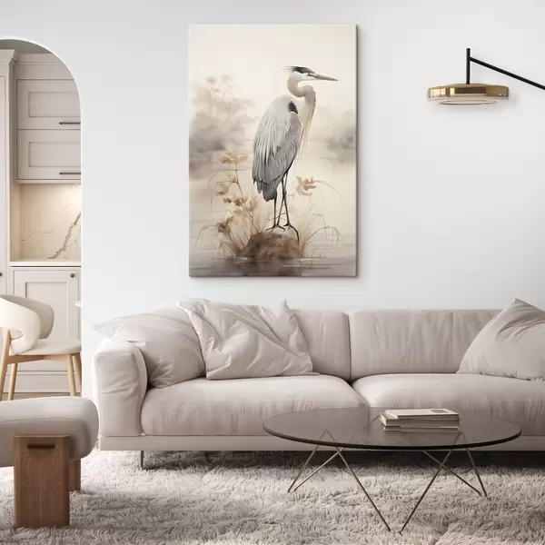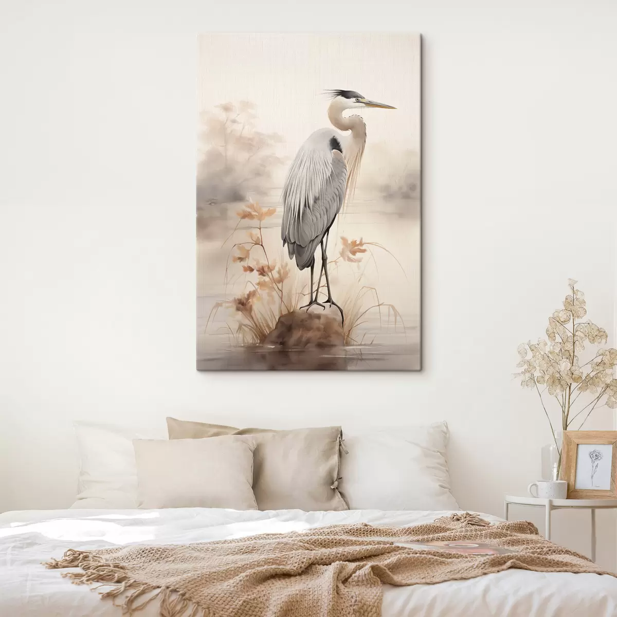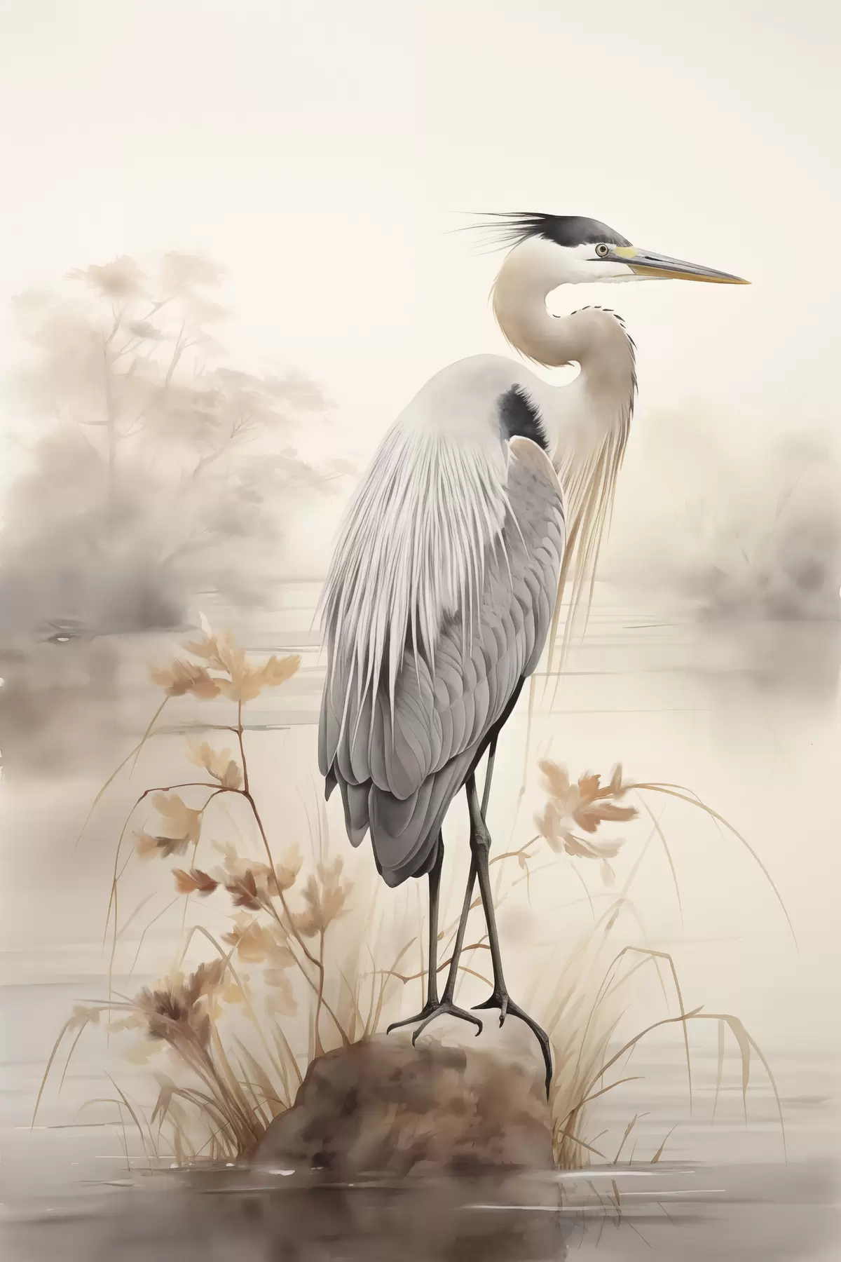 wall murals A heron stands on a rock in a lake with tall grasses and trees in the background s47426