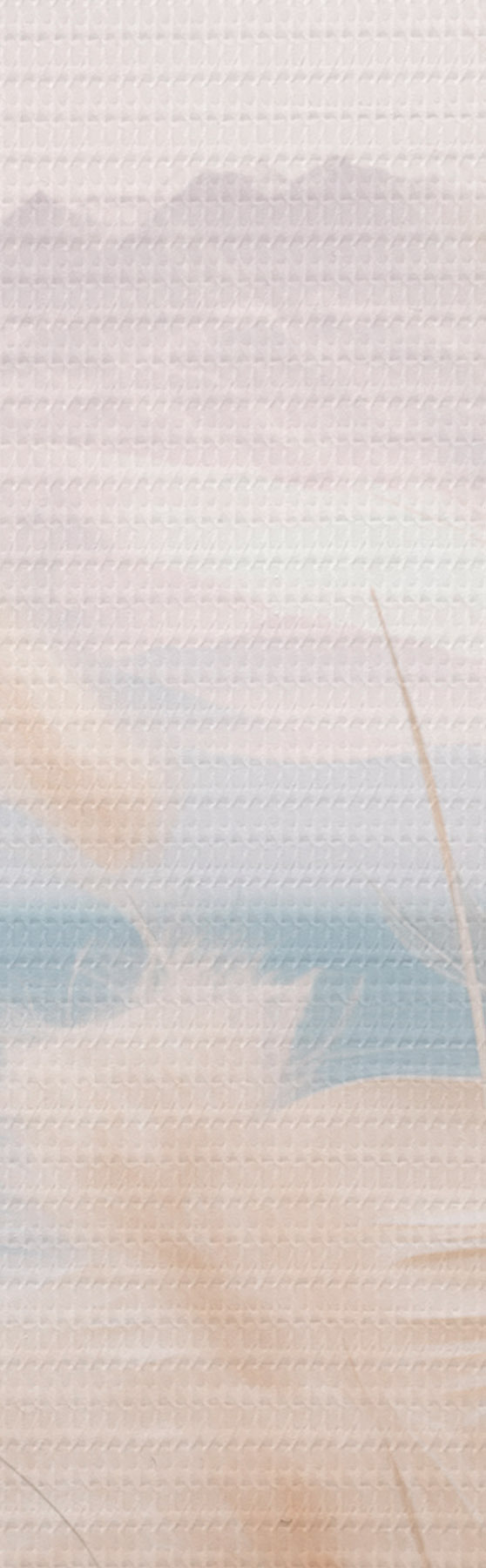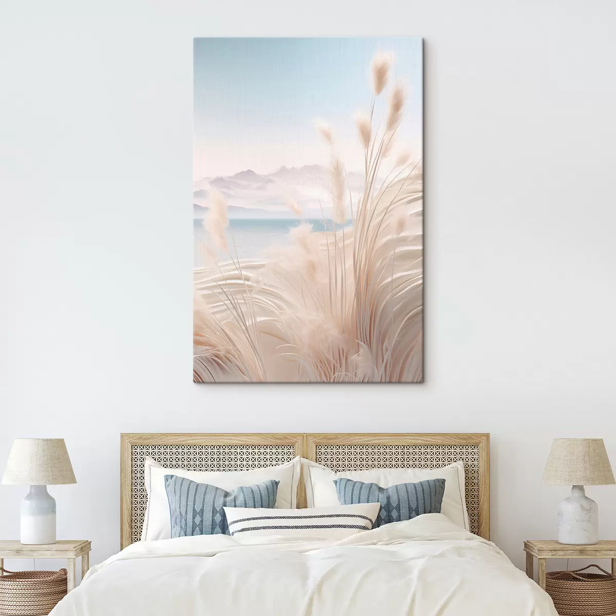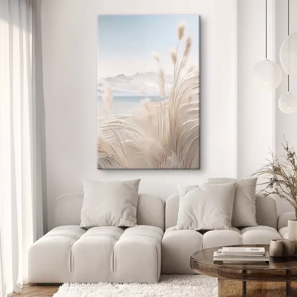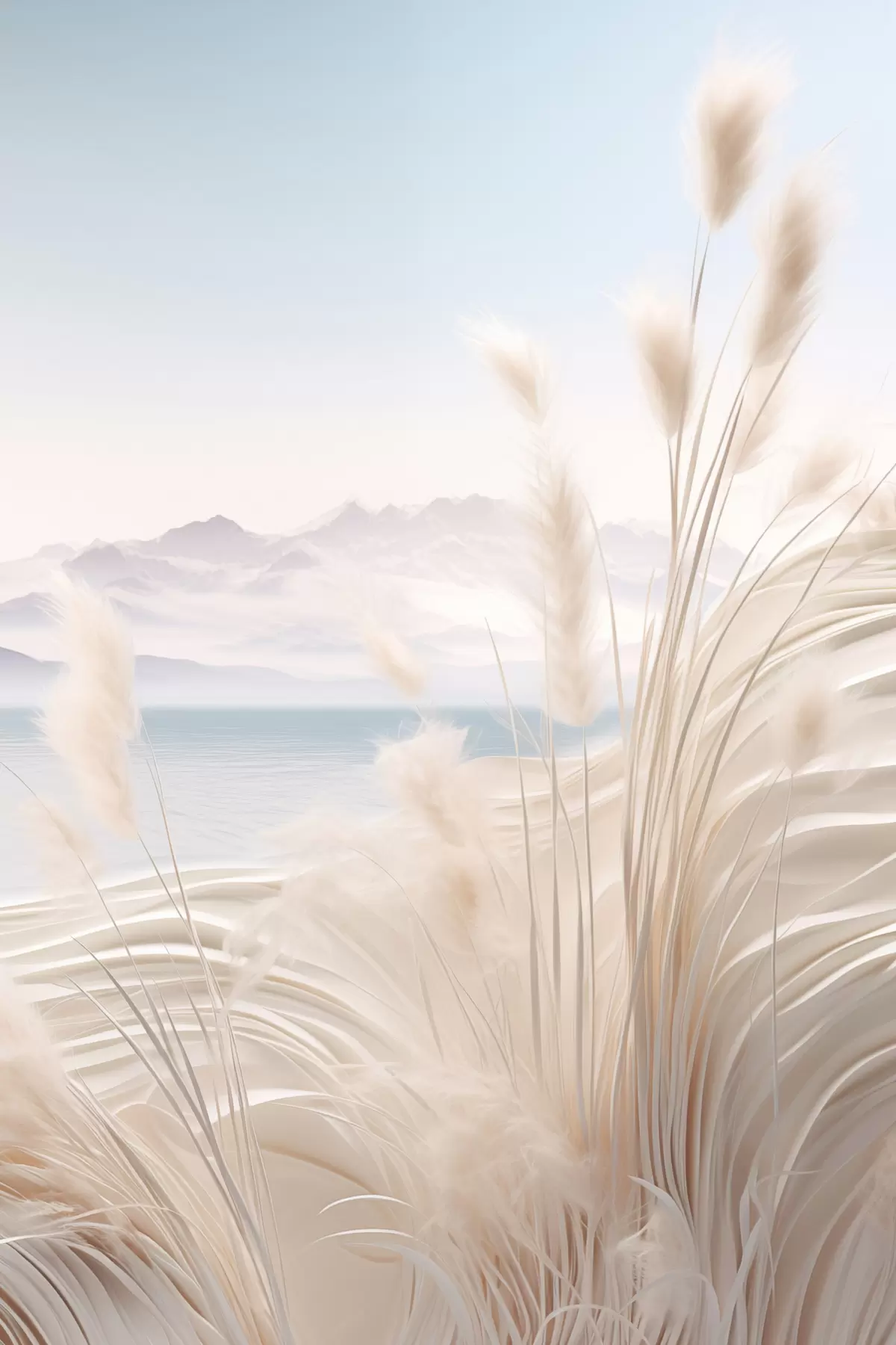 wall murals Tall, feathery pampas grass in soft beige tones, with a sandy beach and mountains in the background s47433