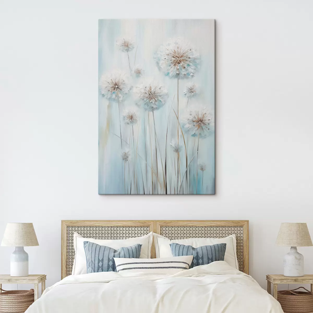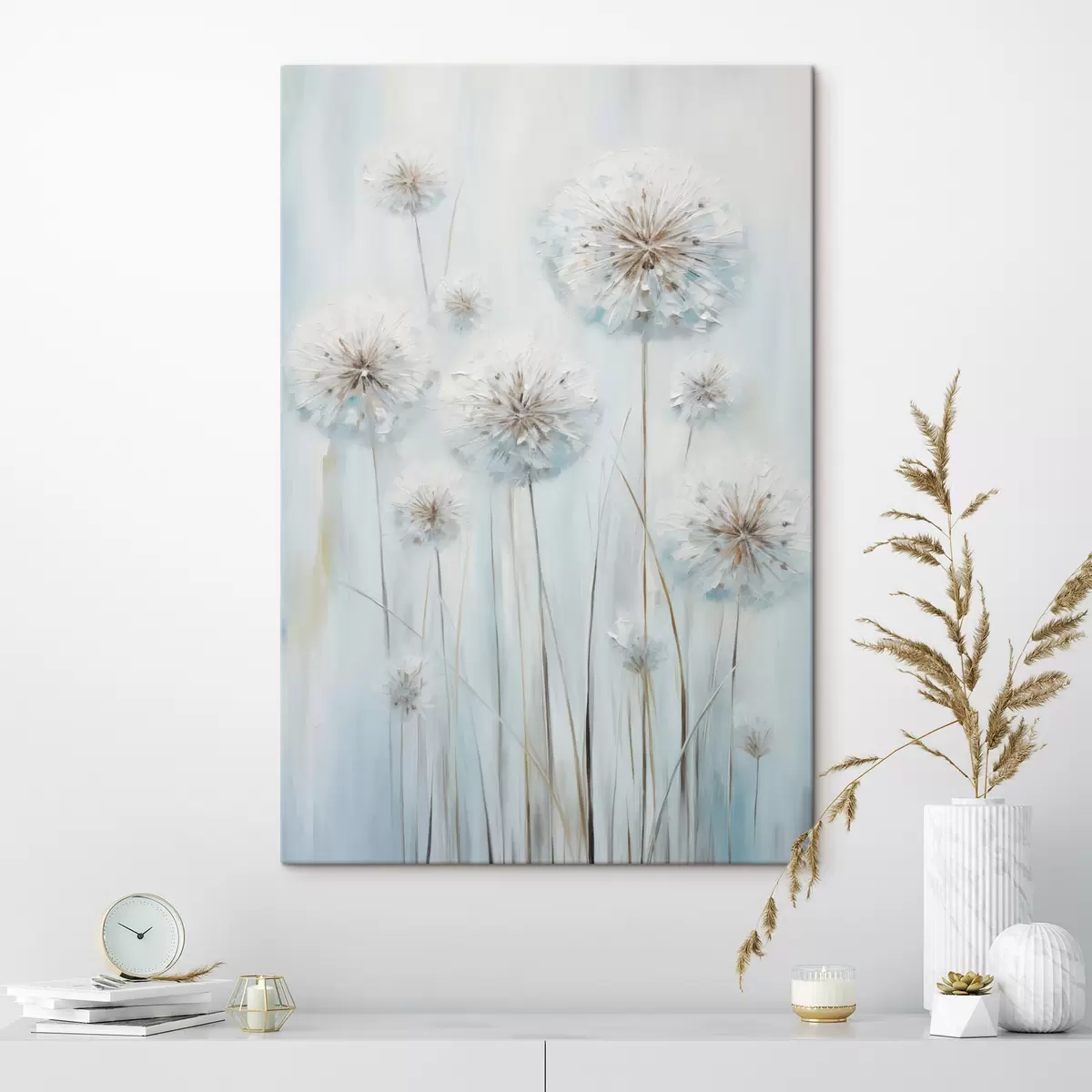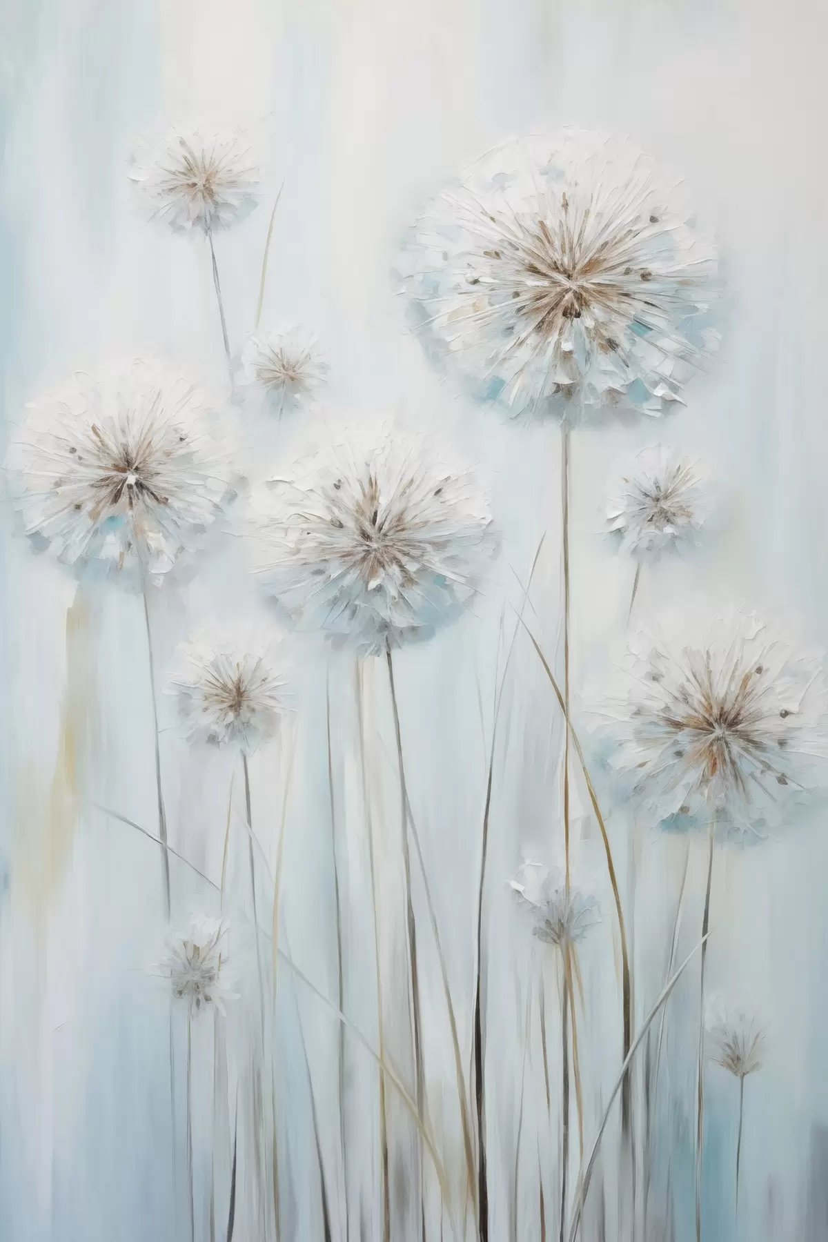 Picture Textured painting style of dandelions against a soft blue and white background Nr s47856