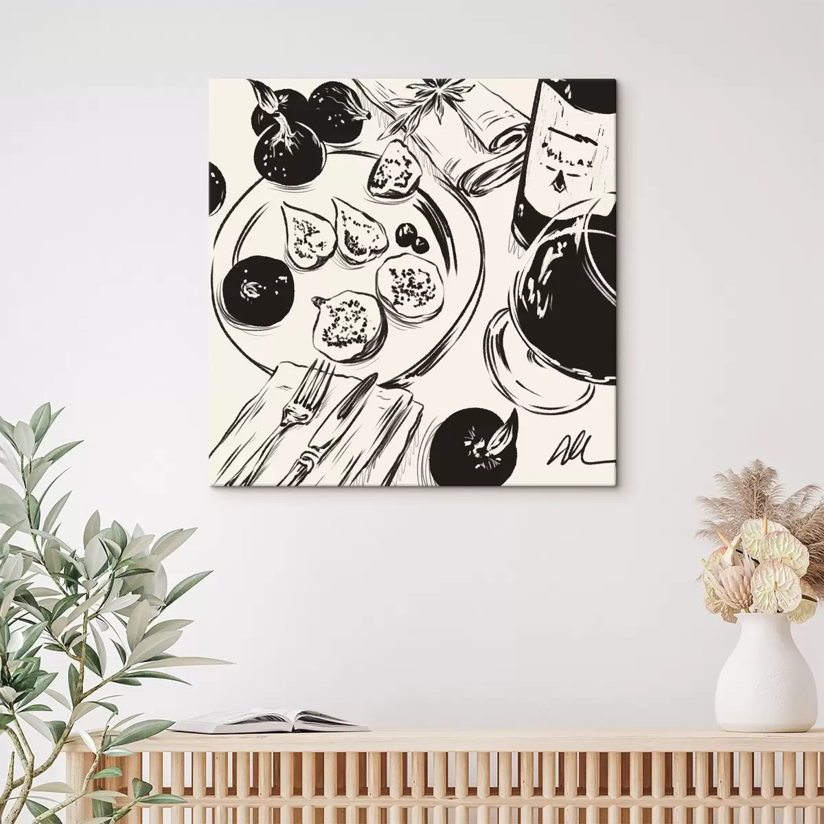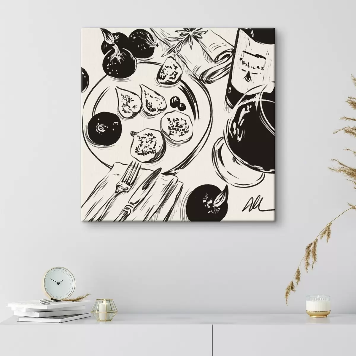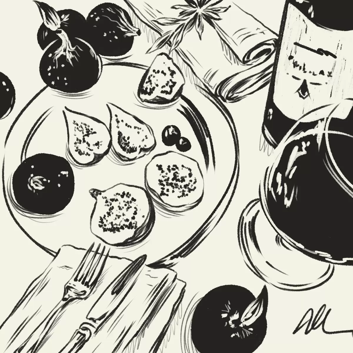 wall murals Black and white sketch of table with fruit and glass s48030