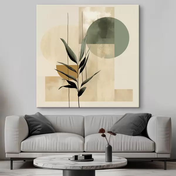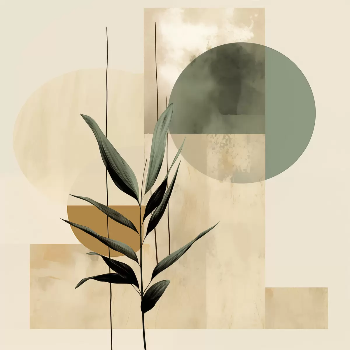 Picture A dark green plant with abstract geometric shapes and watercolor textures in beige and green Nr s48409
