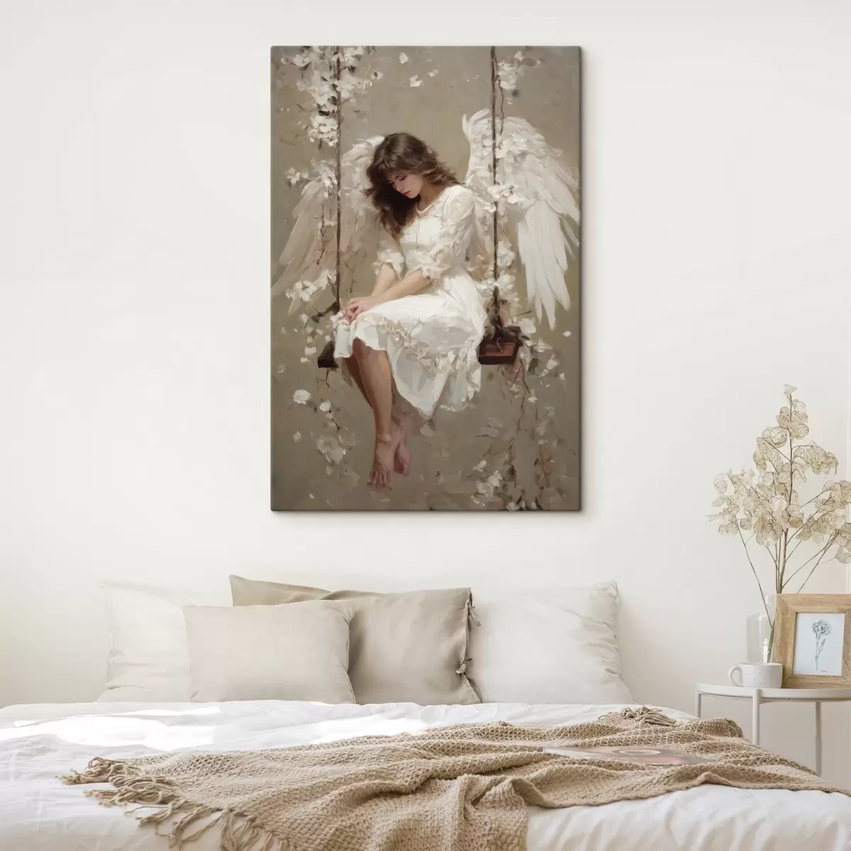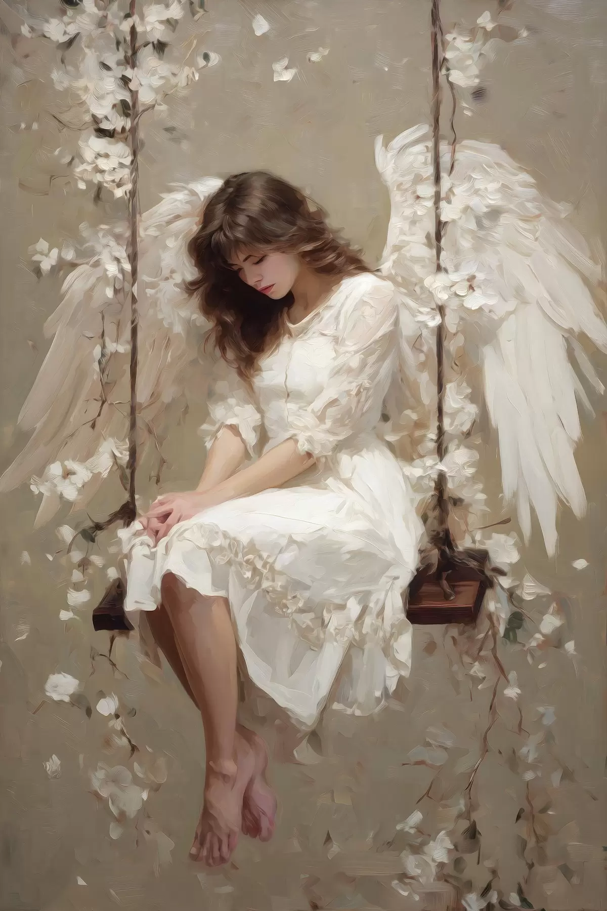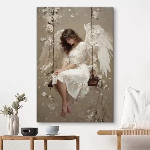 Picture an angel girl on a swing, painted in an oil-style Nr s48789