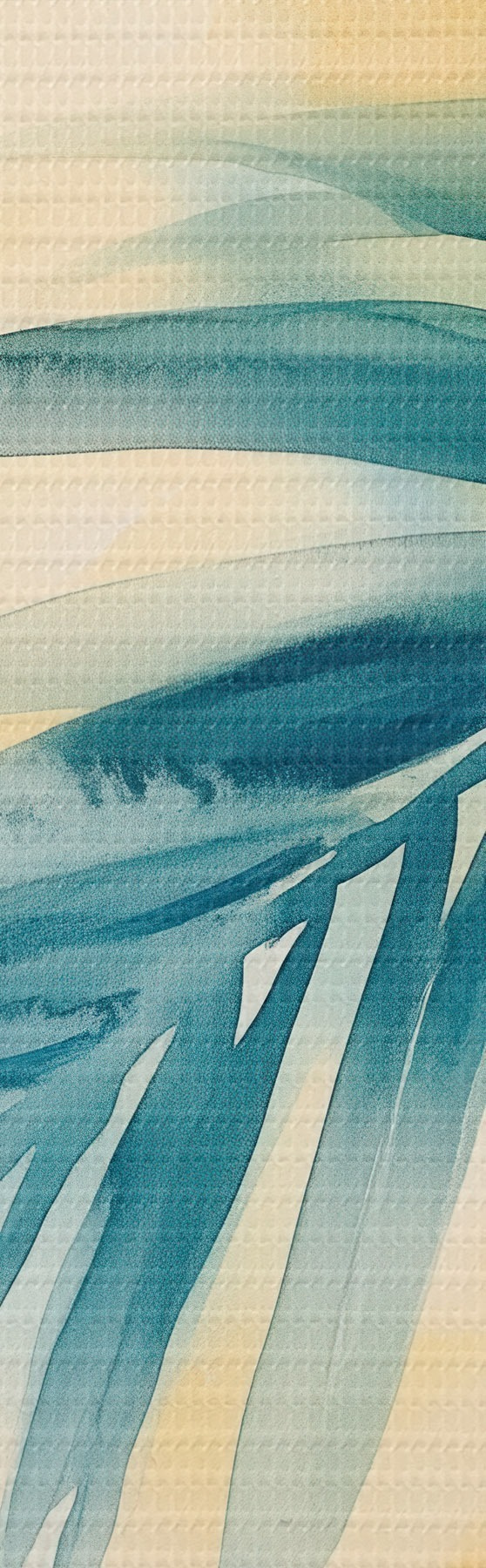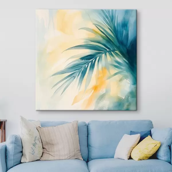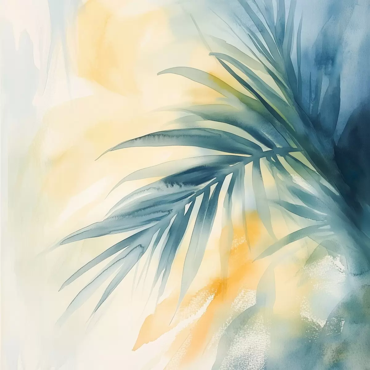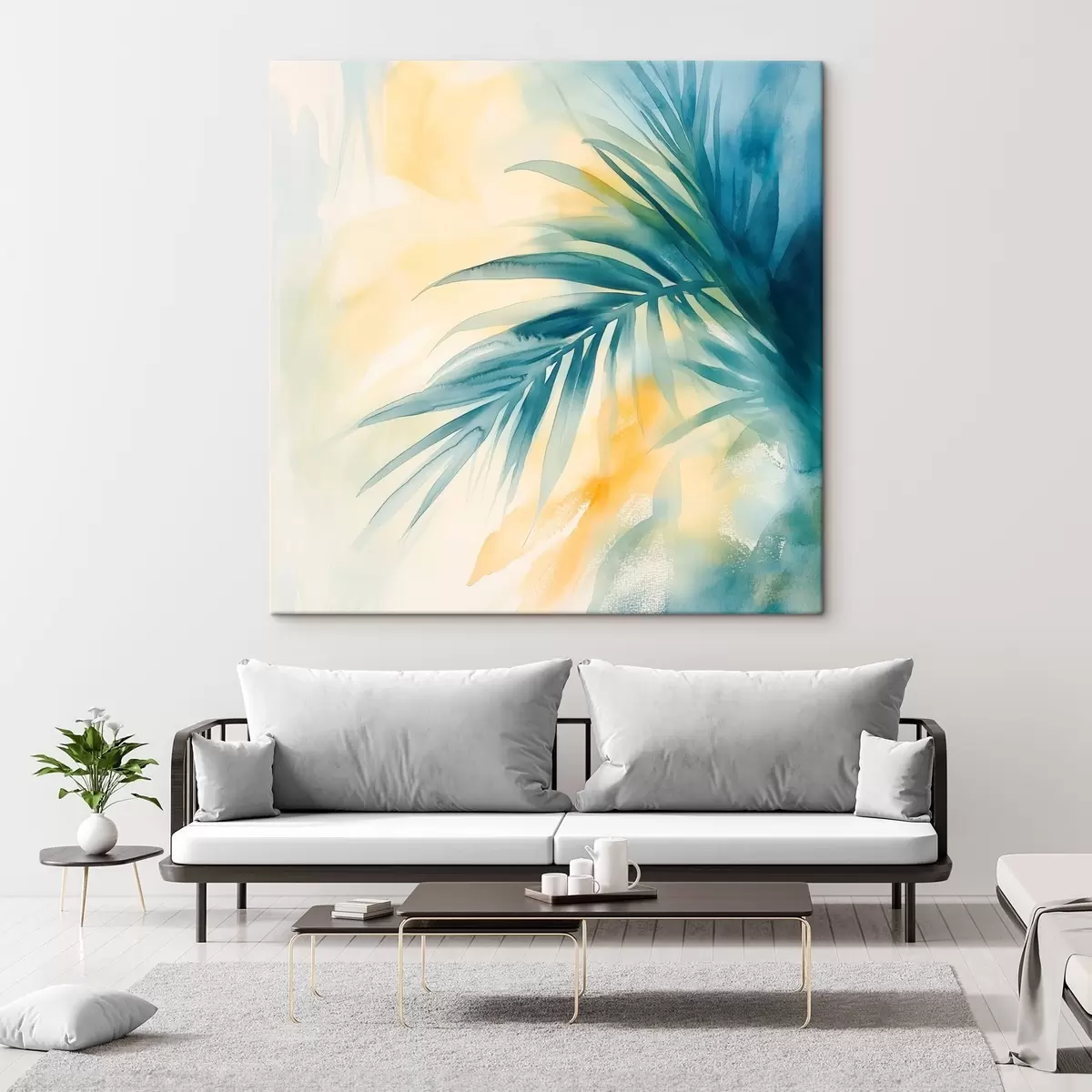 Picture Tropical palm leaves in a blue-turquoise palette against a background of warm watercolor stains Nr s48849