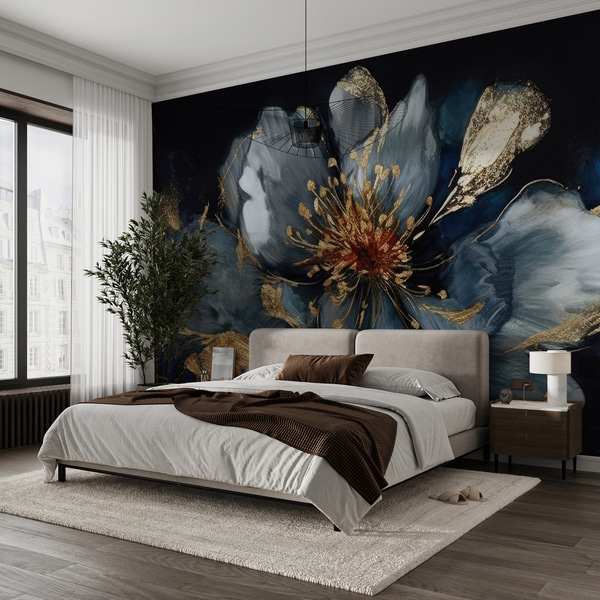 Three graceful flowers with translucent petals, intertwined with ribbons of light and wind in blue tones