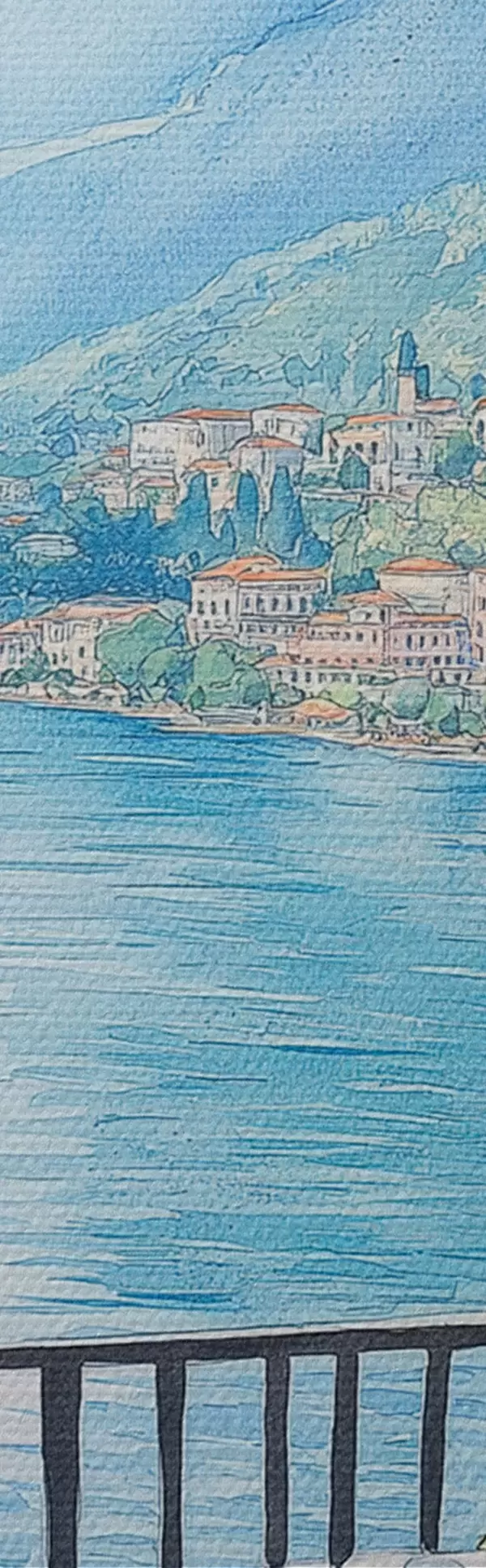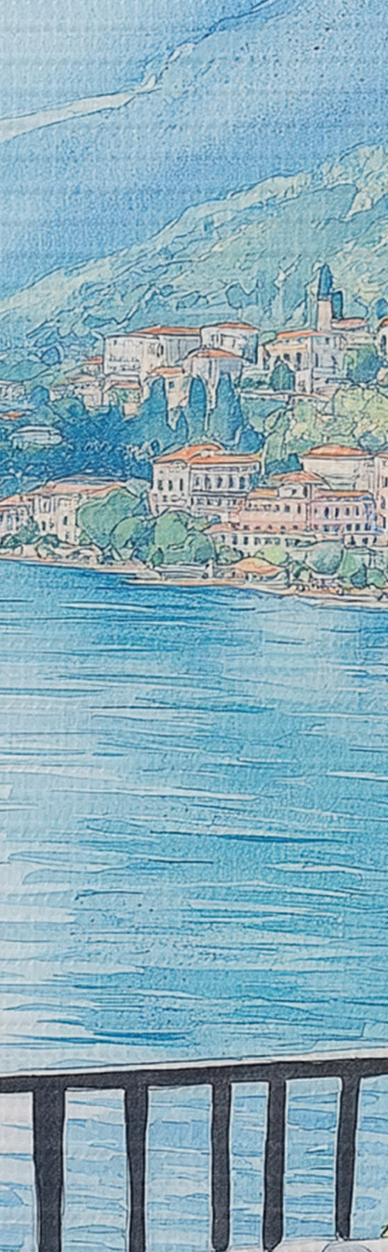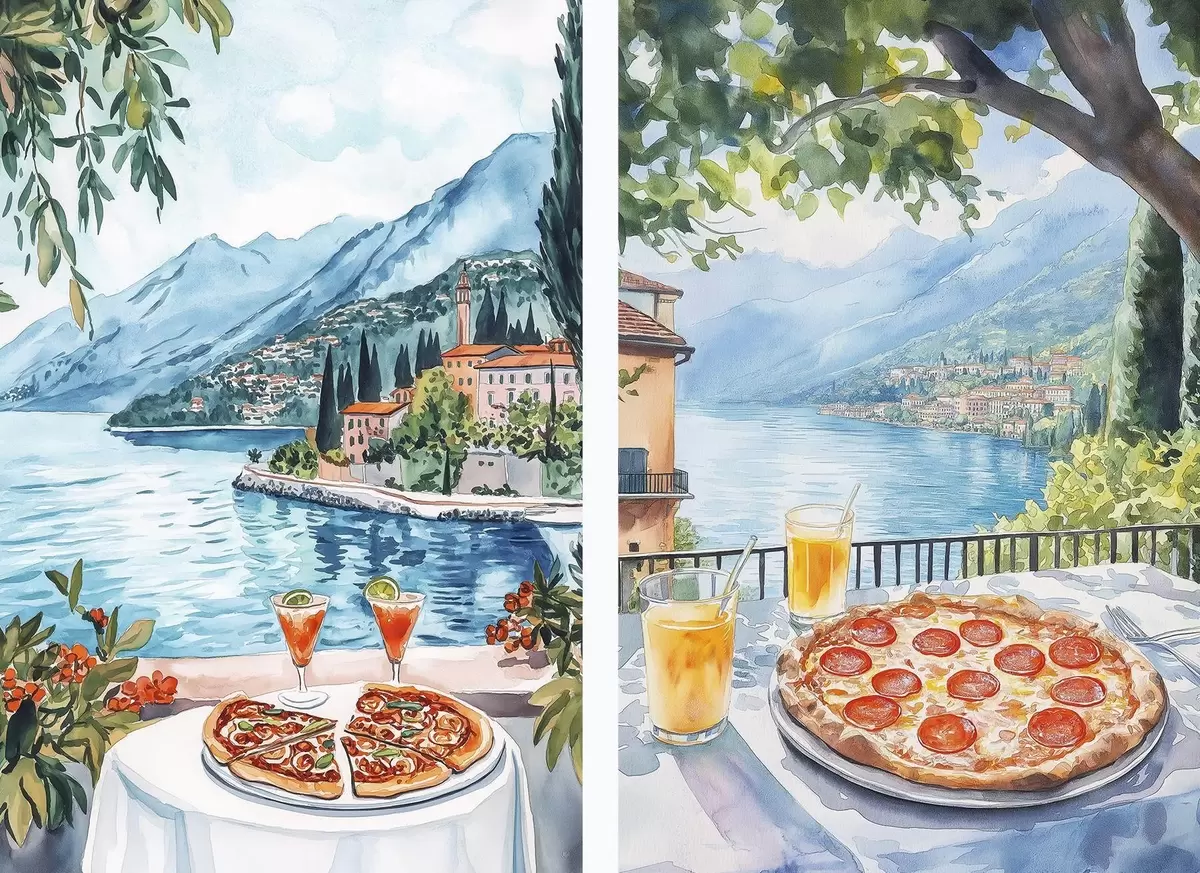 murales Lago Como, brunch en Italia, estilo acuarela, pizza margarita, naturaleza de verano m00406