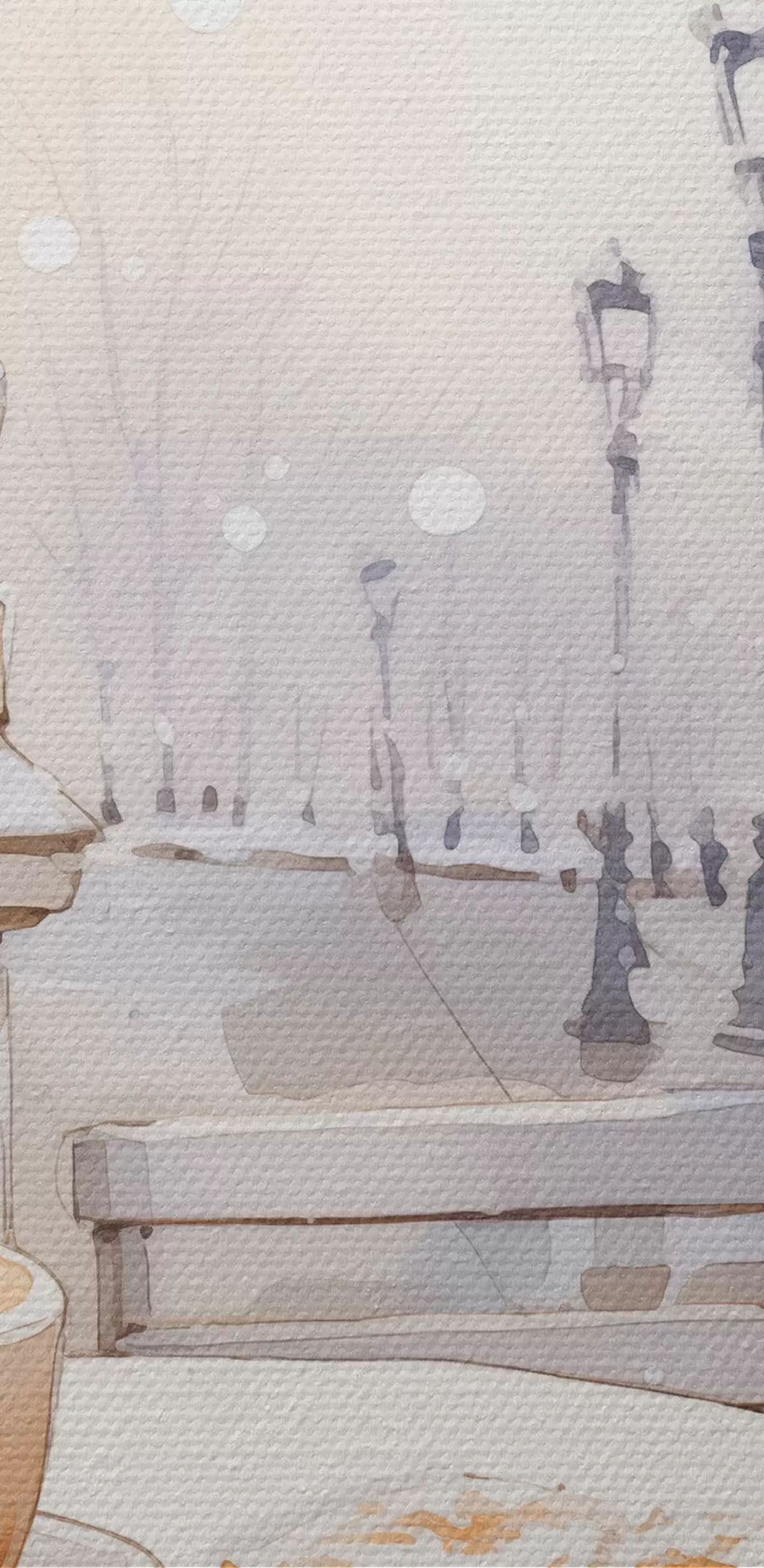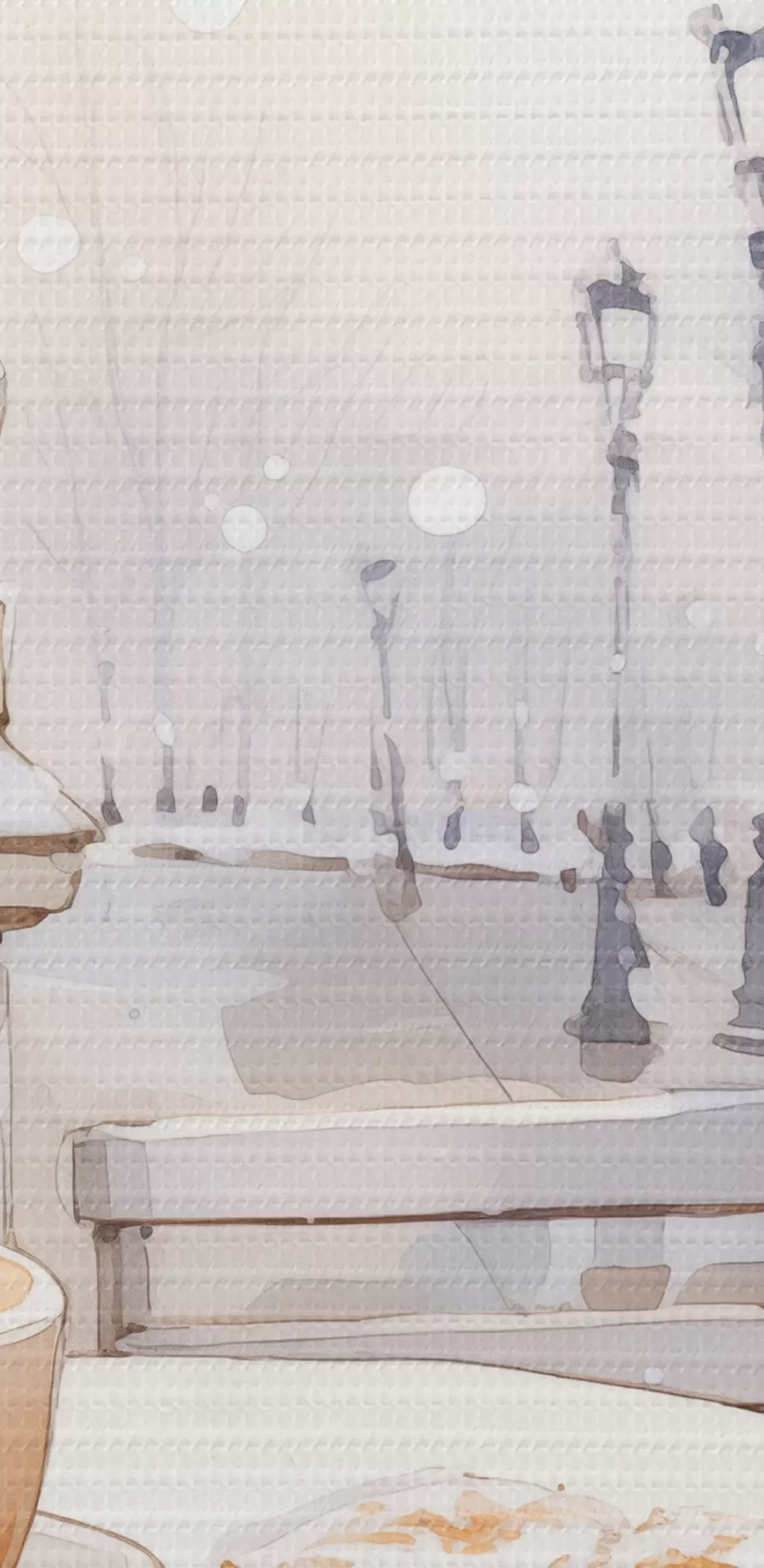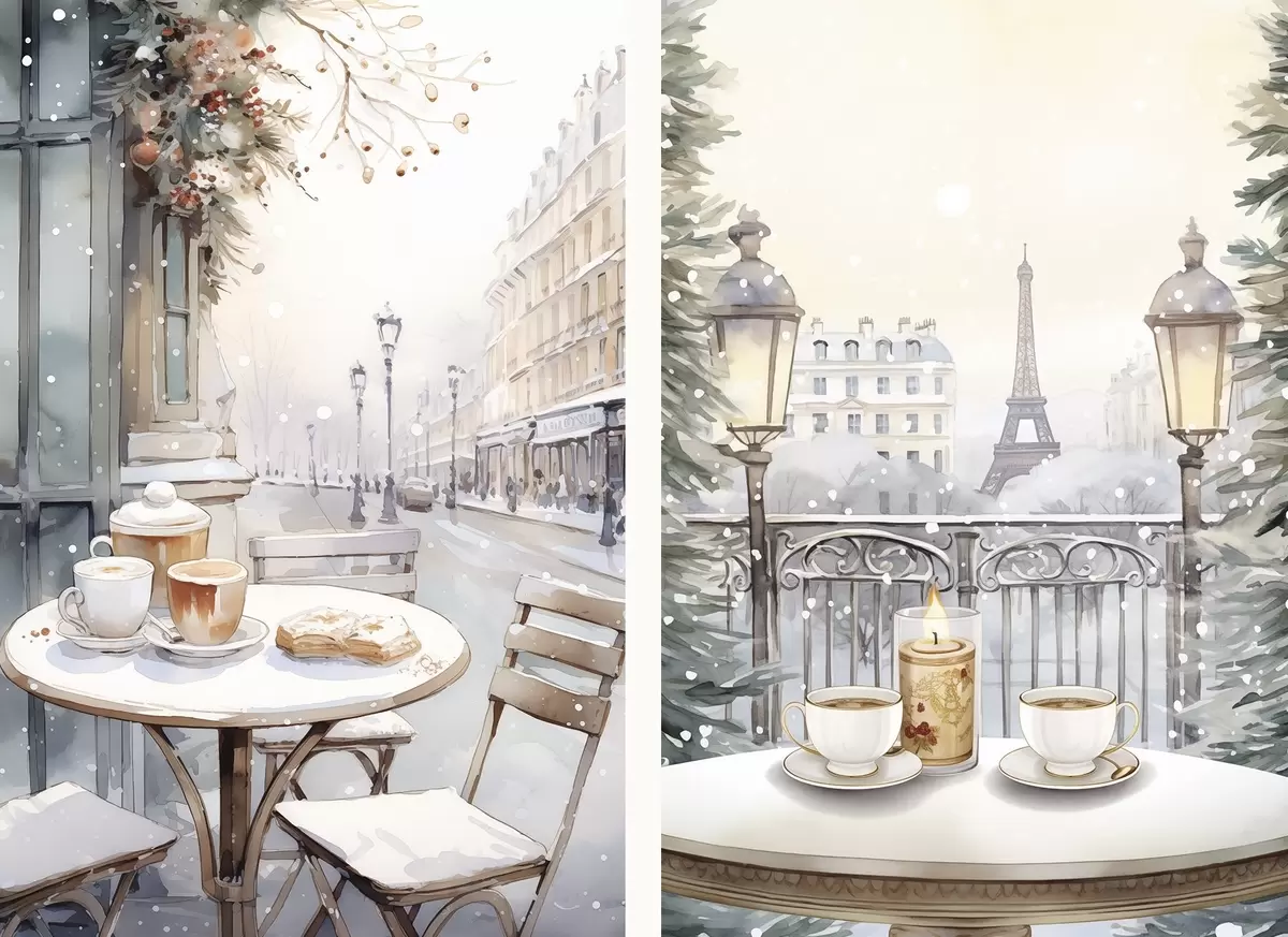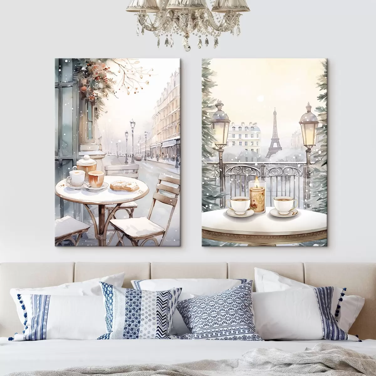 murales Estéticas cafeterías con tazas de café, calle de la ciudad de París, invierno, arquitectura m00413