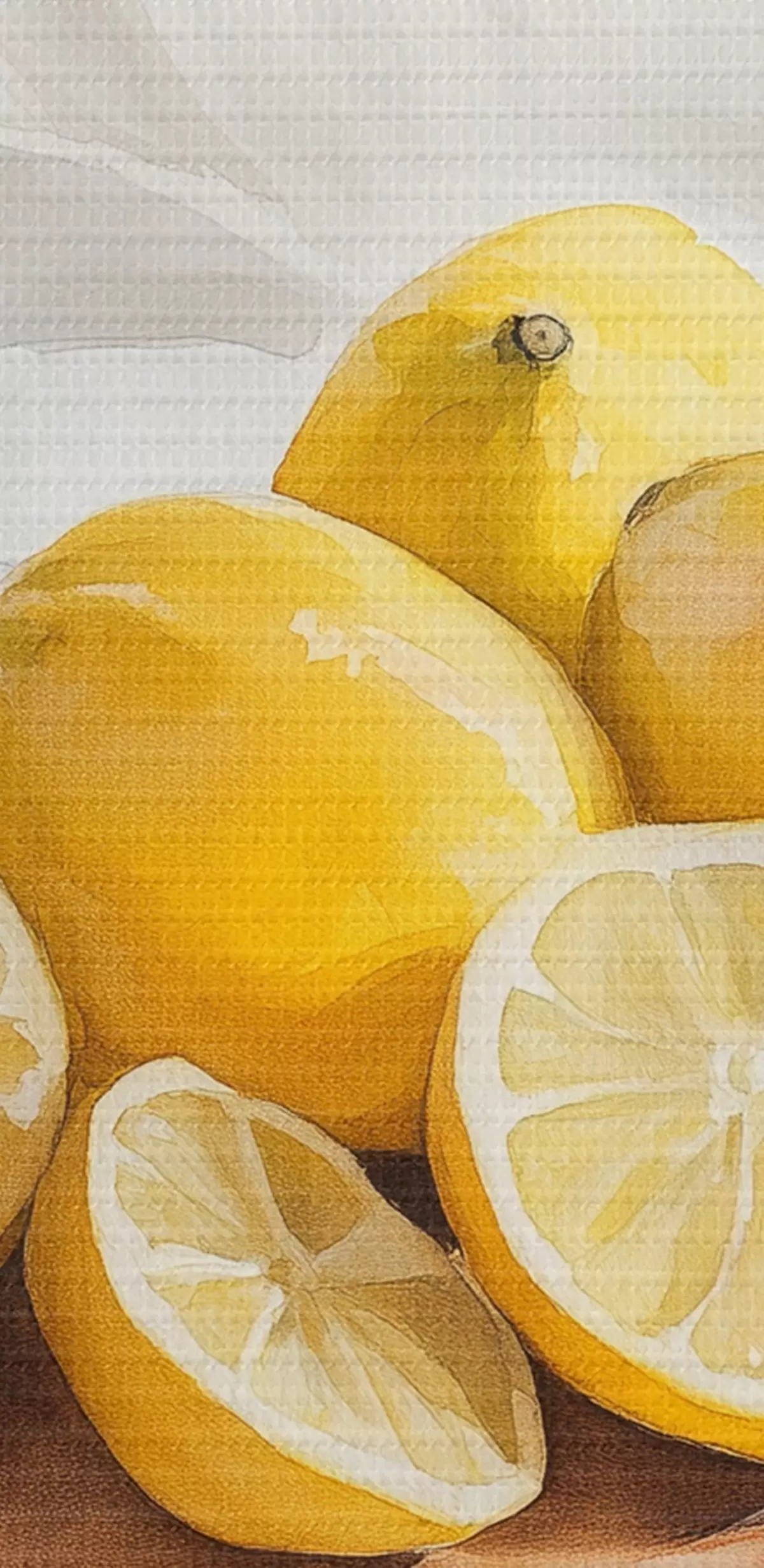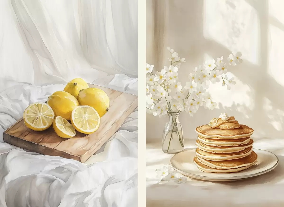 murales Panqueques con mantequilla de maní, limones en la tabla de madera, estilo acuarela m00416