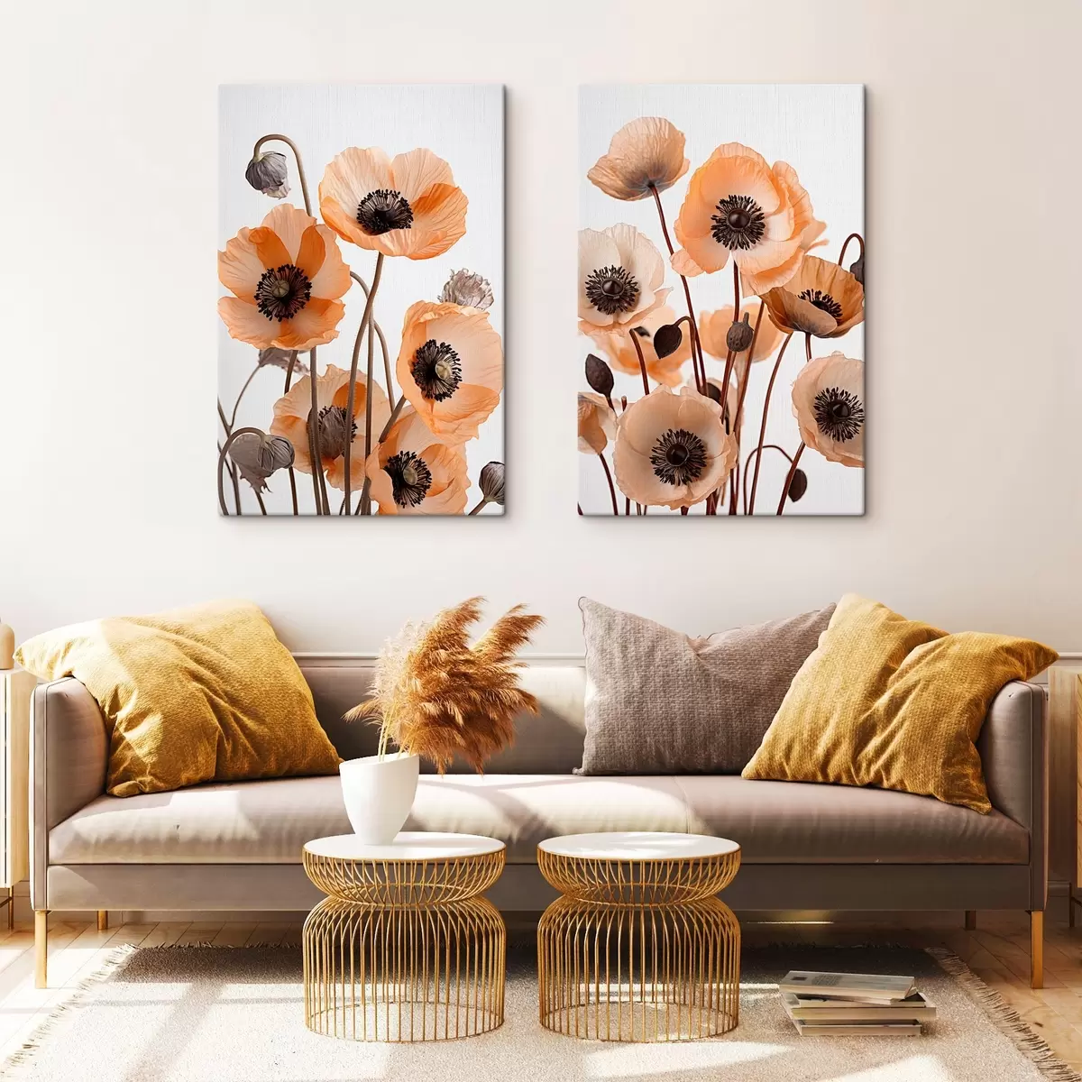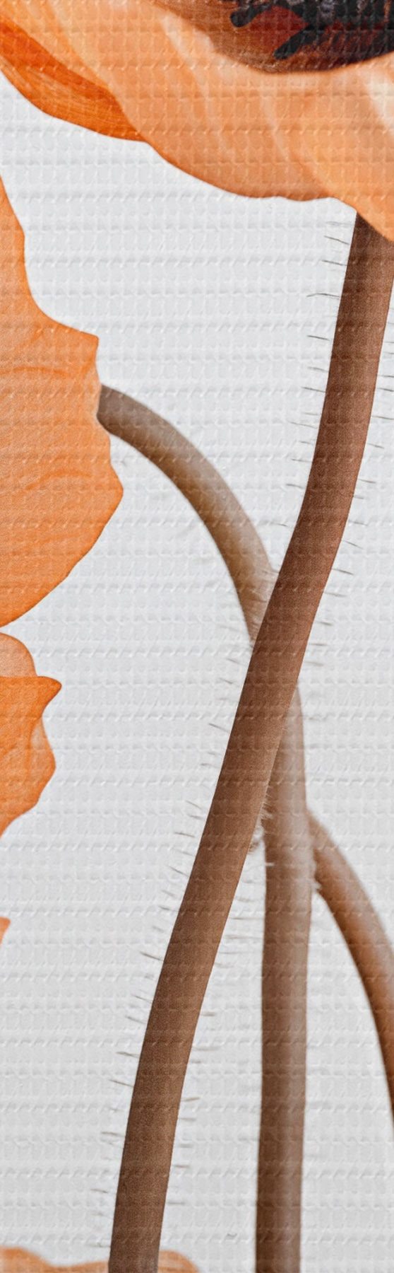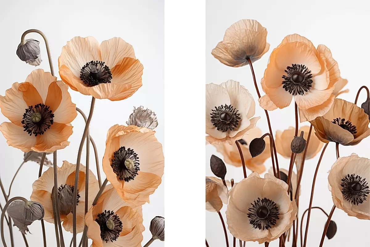 murales Amapolas naranjas, flores secas sobre fondo claro, iluminación suave, pétalos delicados, arreglo floral m00518