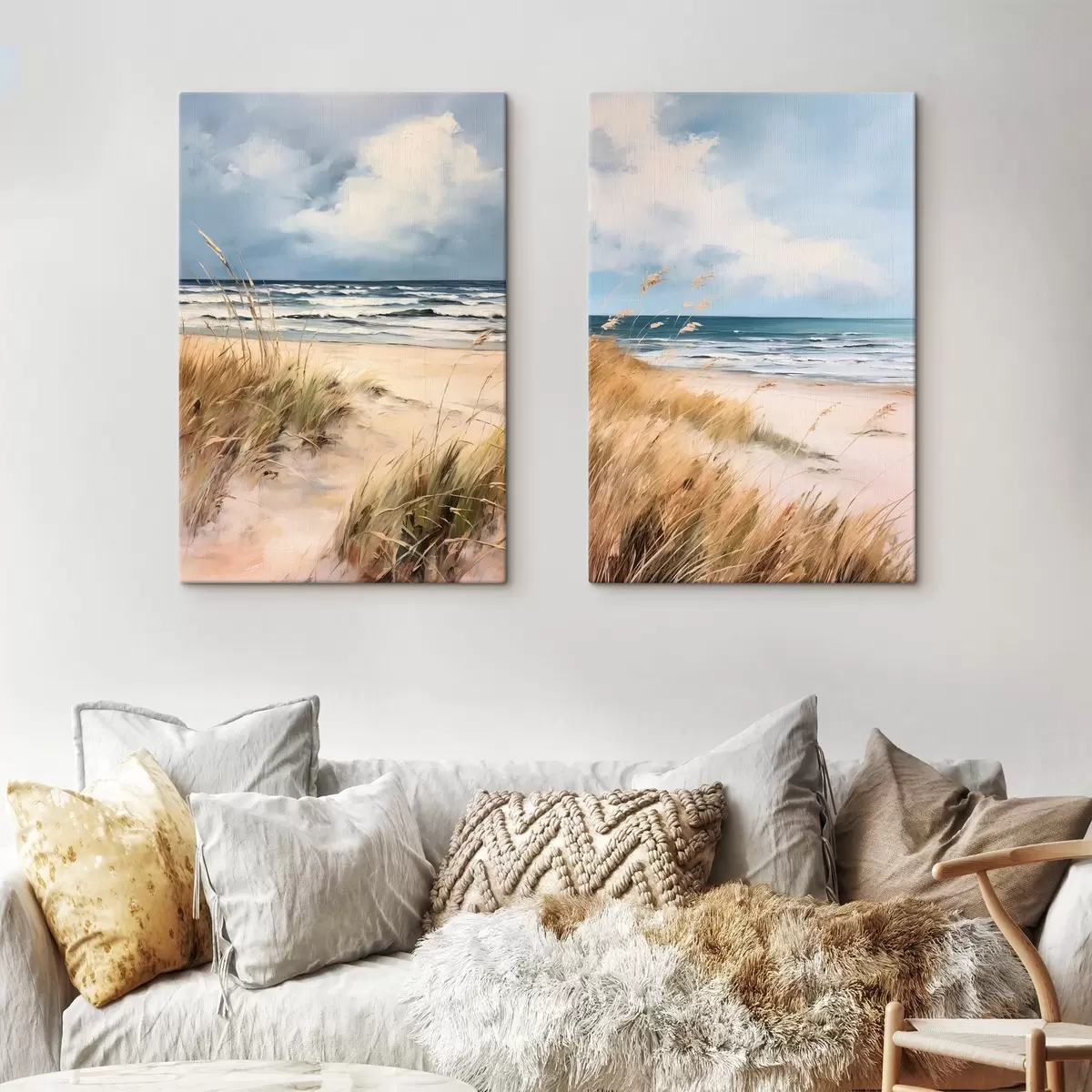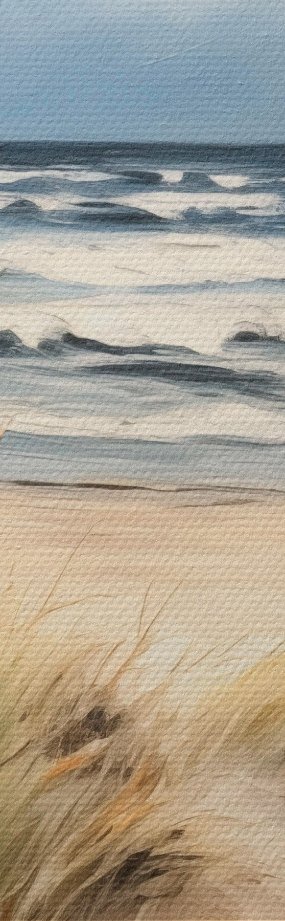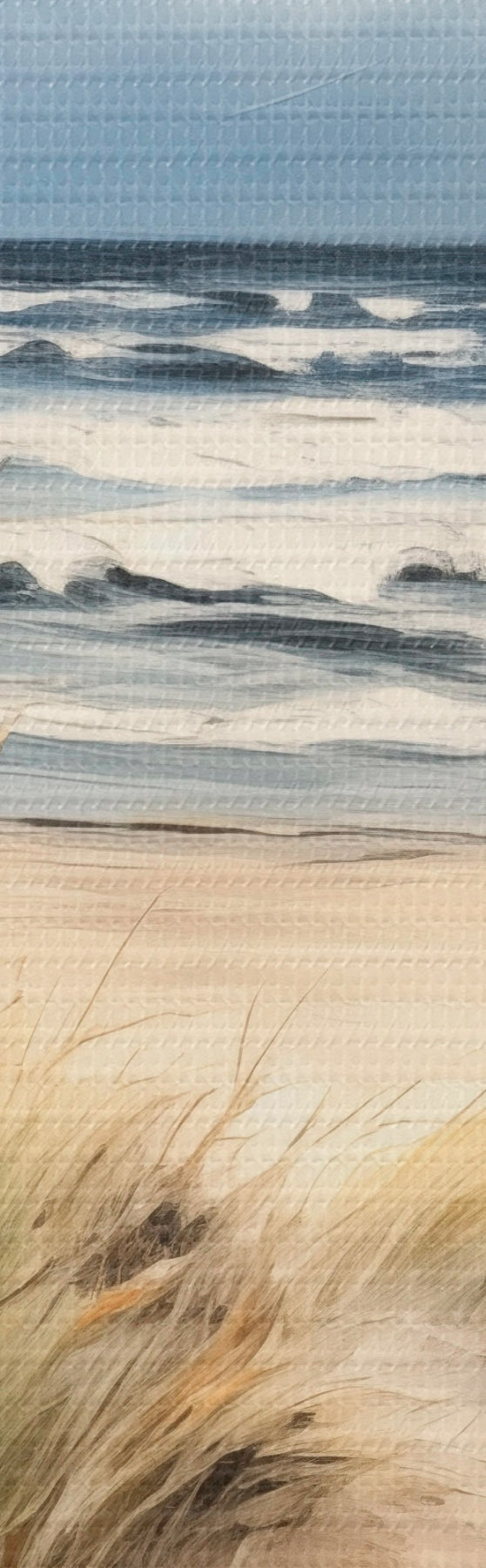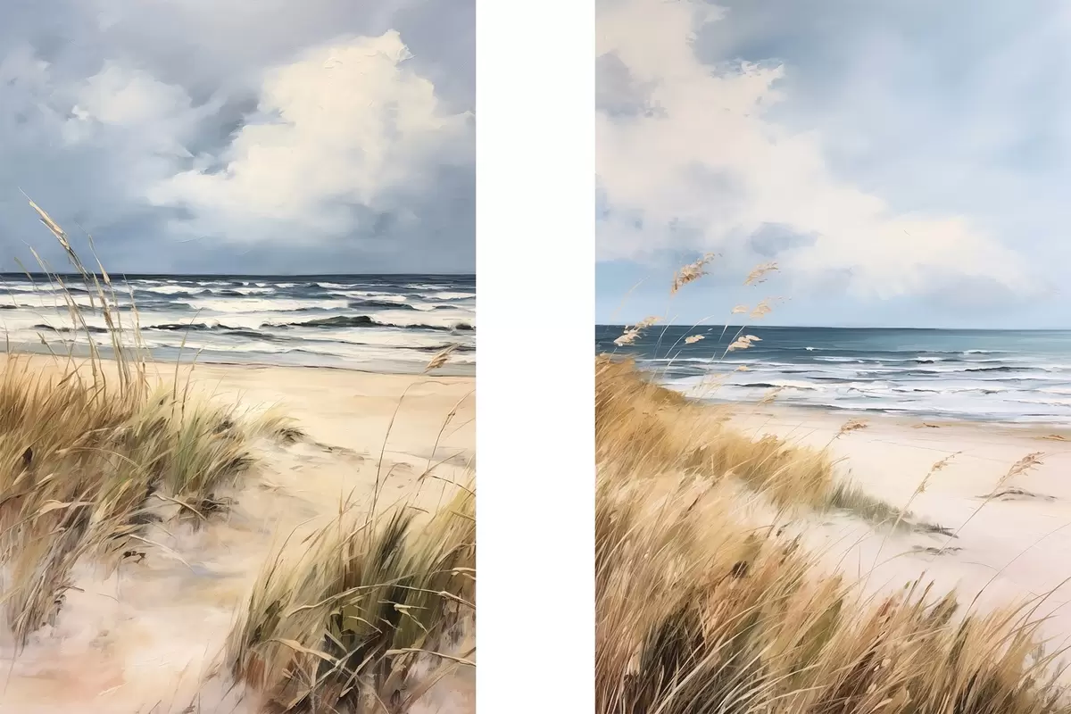 murales Una playa de arena con hierba alta en primer plano, el océano con olas y un cielo nublado al fondo m00521