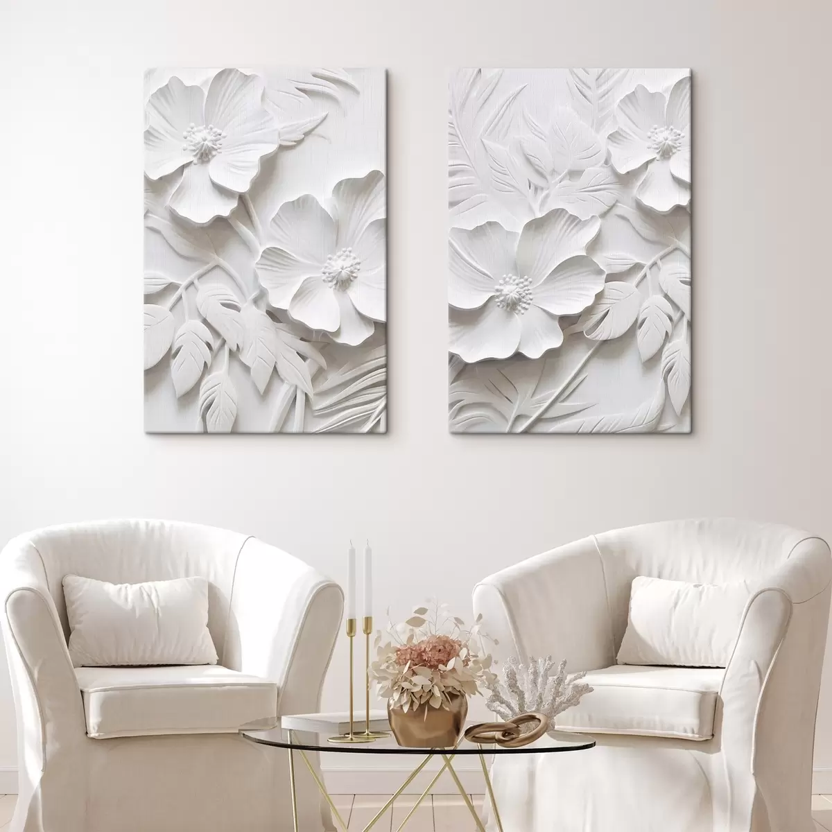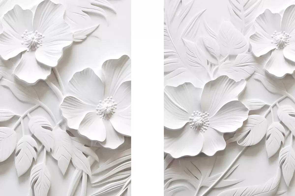 murales Flores blancas minimalistas decorativas con hojas, imitación relieve, fondo blanco m00524