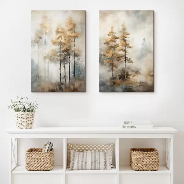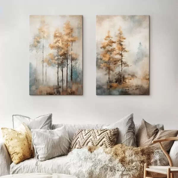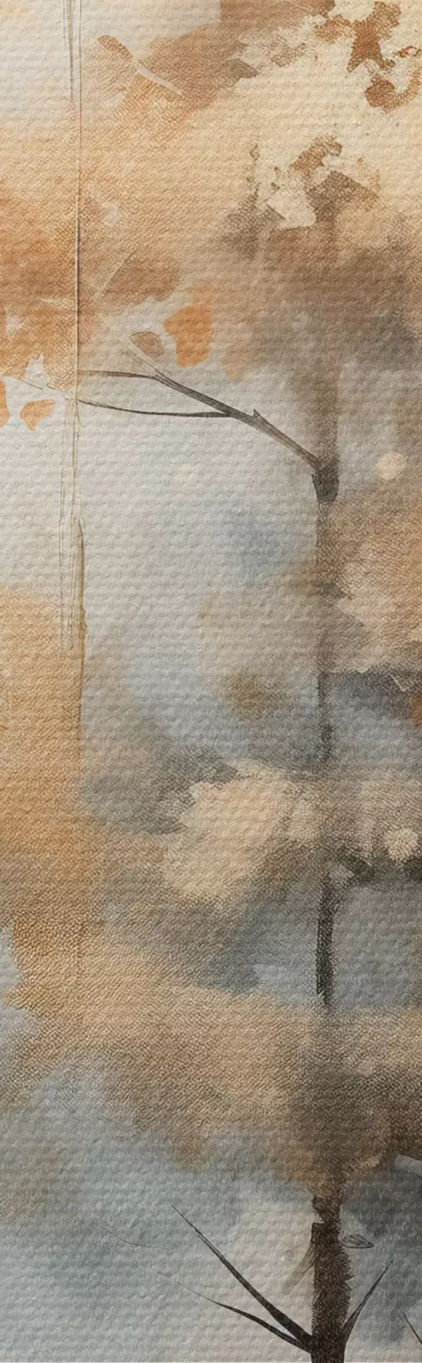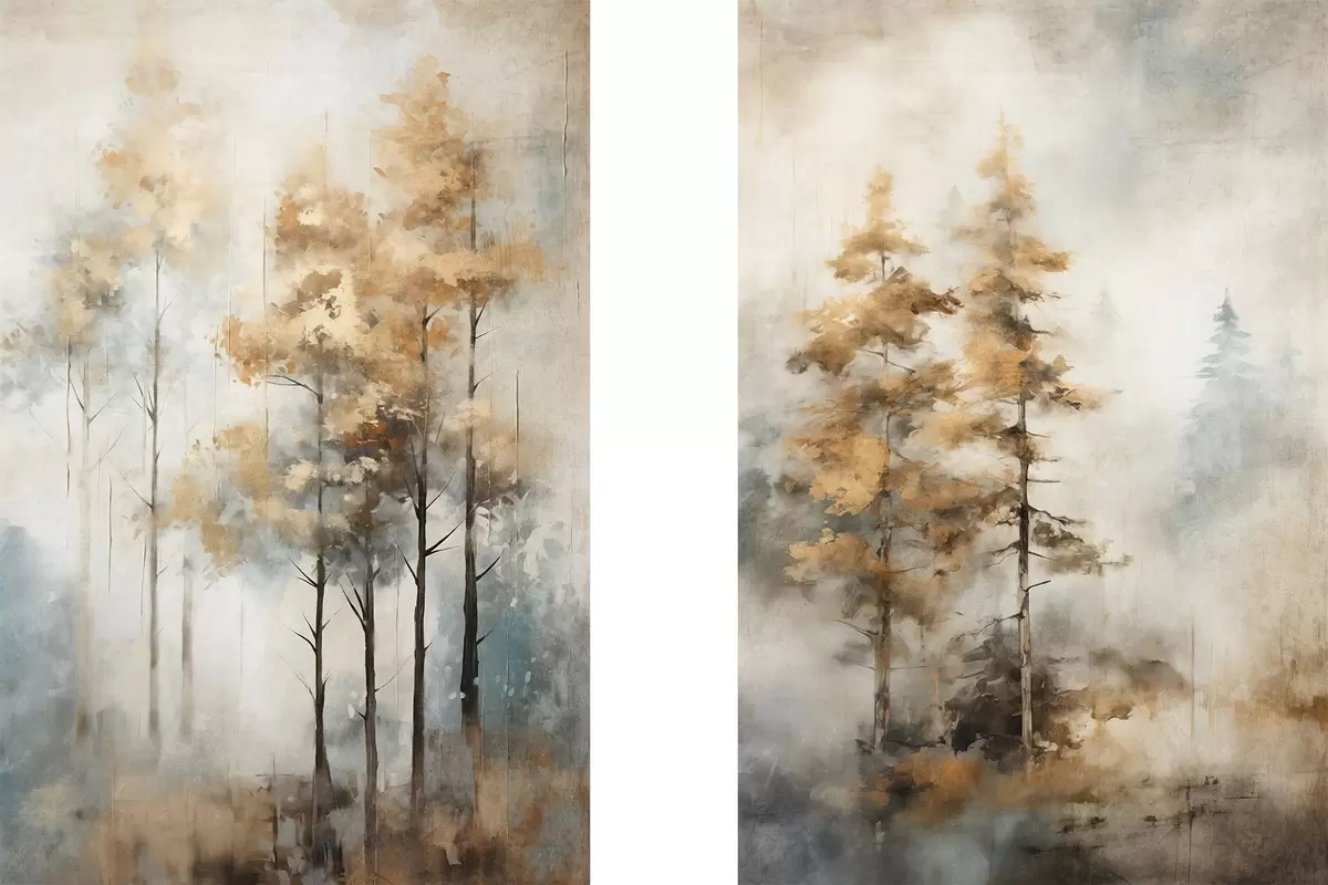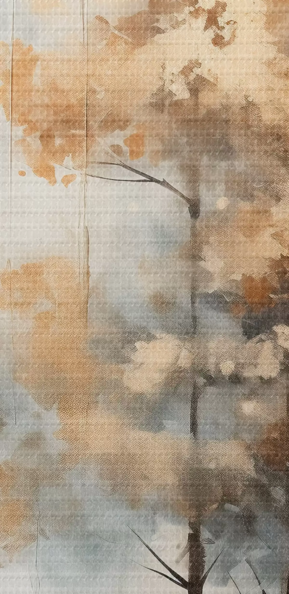 murales Árboles altos con textura y hojas amarillas en un bosque , el fondo es una mezcla de suaves tonos azules y marrones m00528