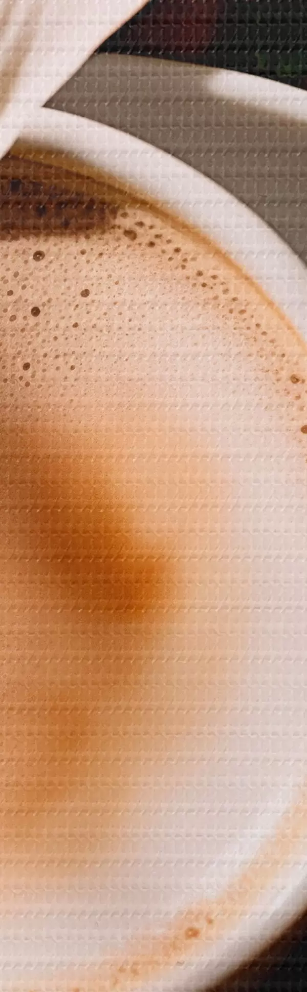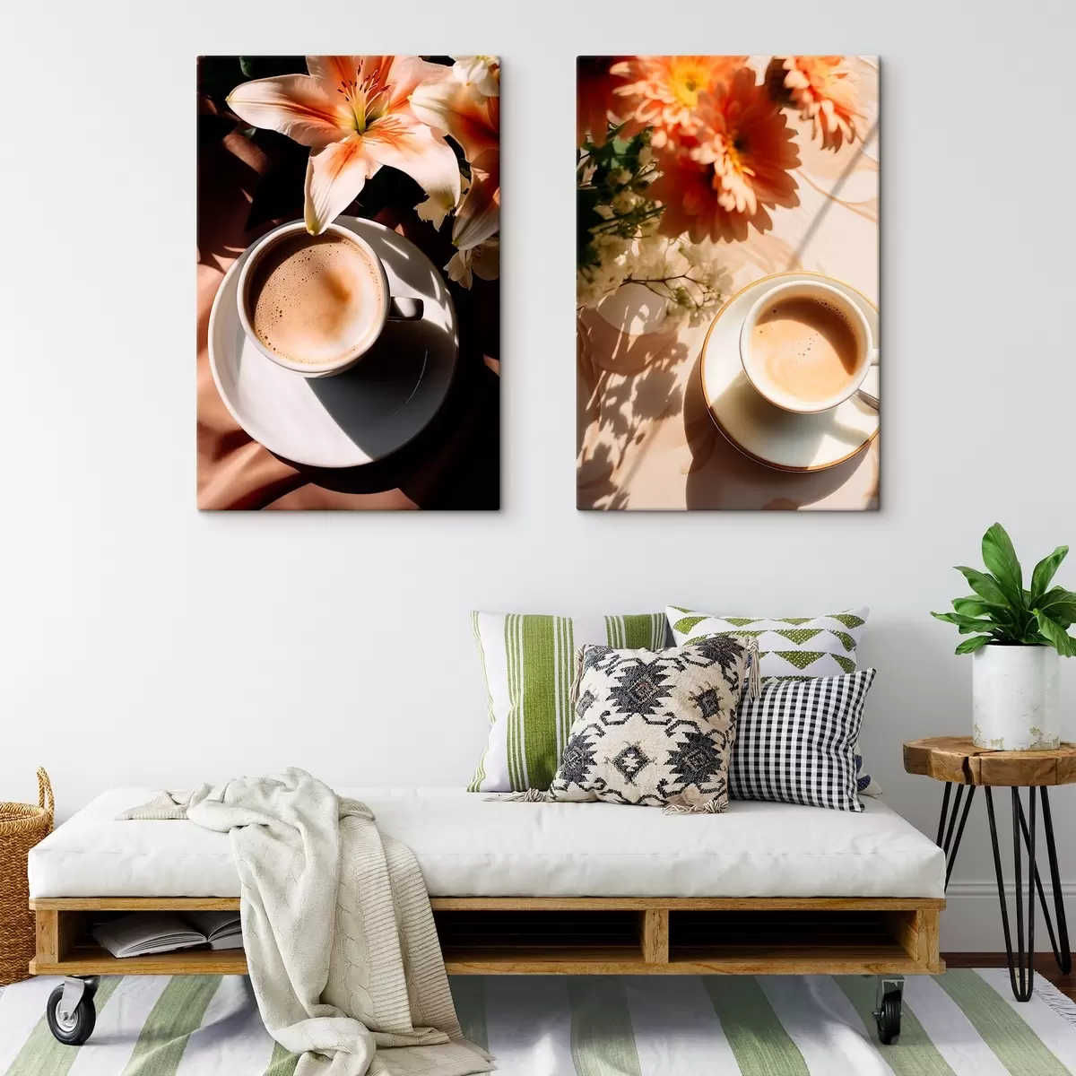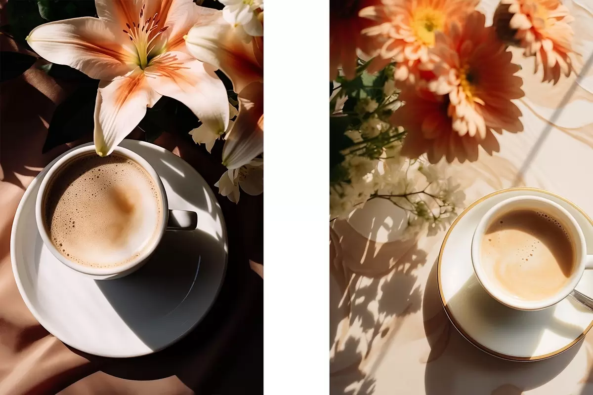 murales Una taza de café con espuma en un plato blanco, unas flores al fondo, con luz solar m00654
