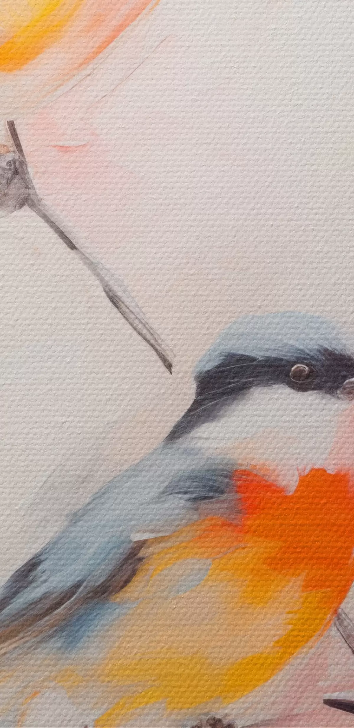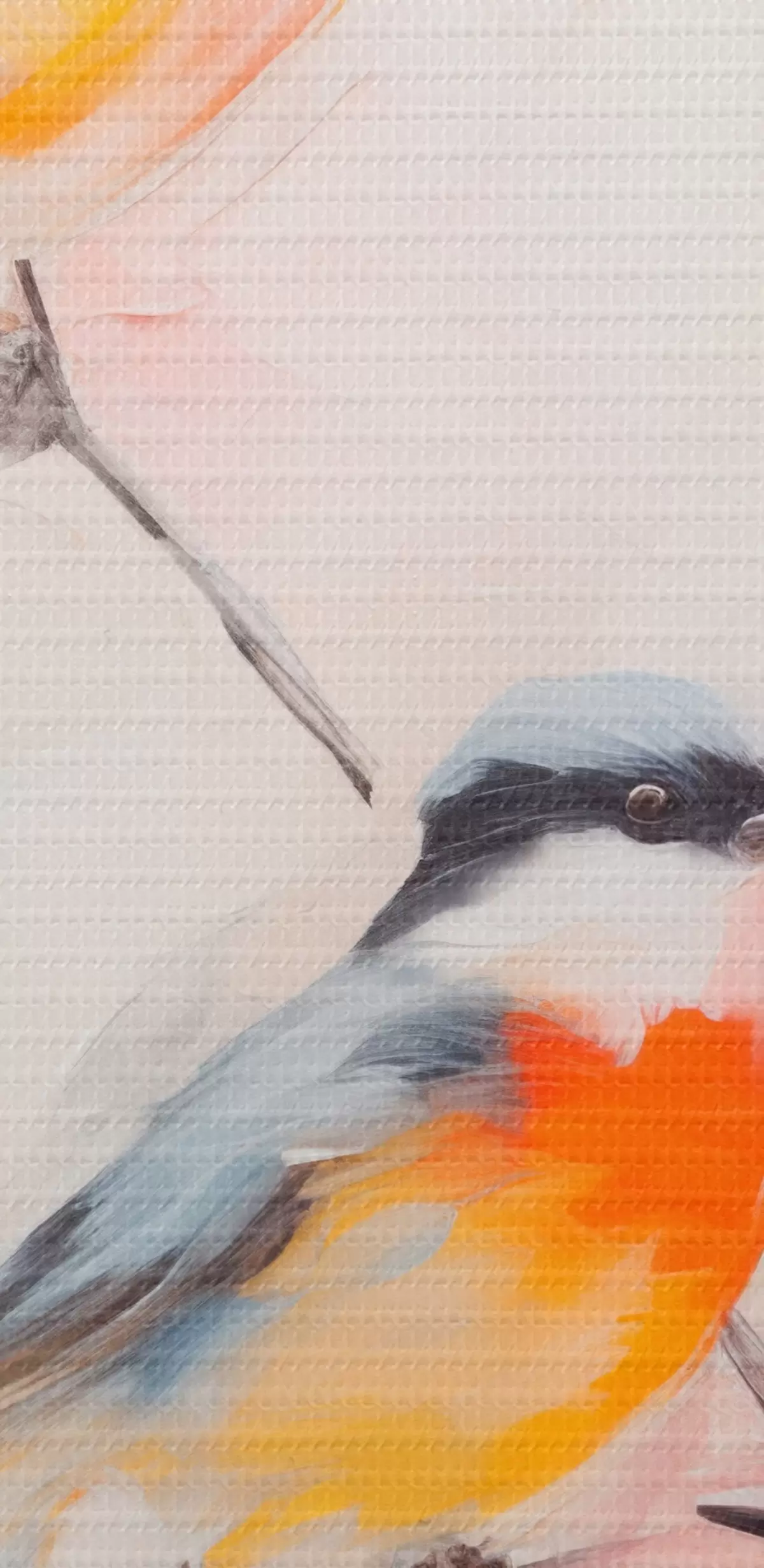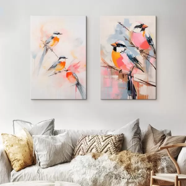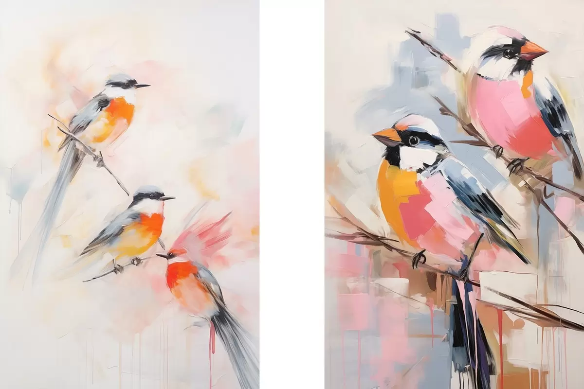 murales Pájaros posados en ramas , suaves colores pastel, fondo claro con tonos rosas y blancos m00658