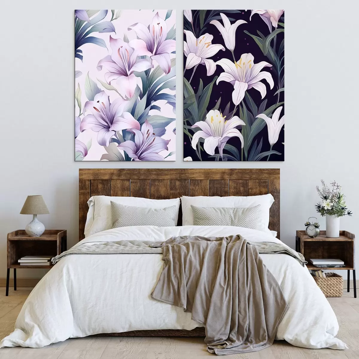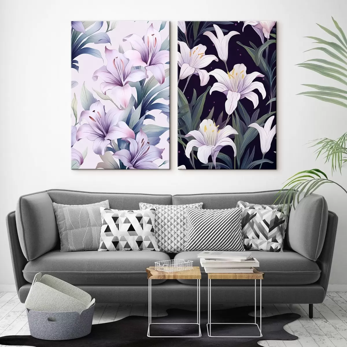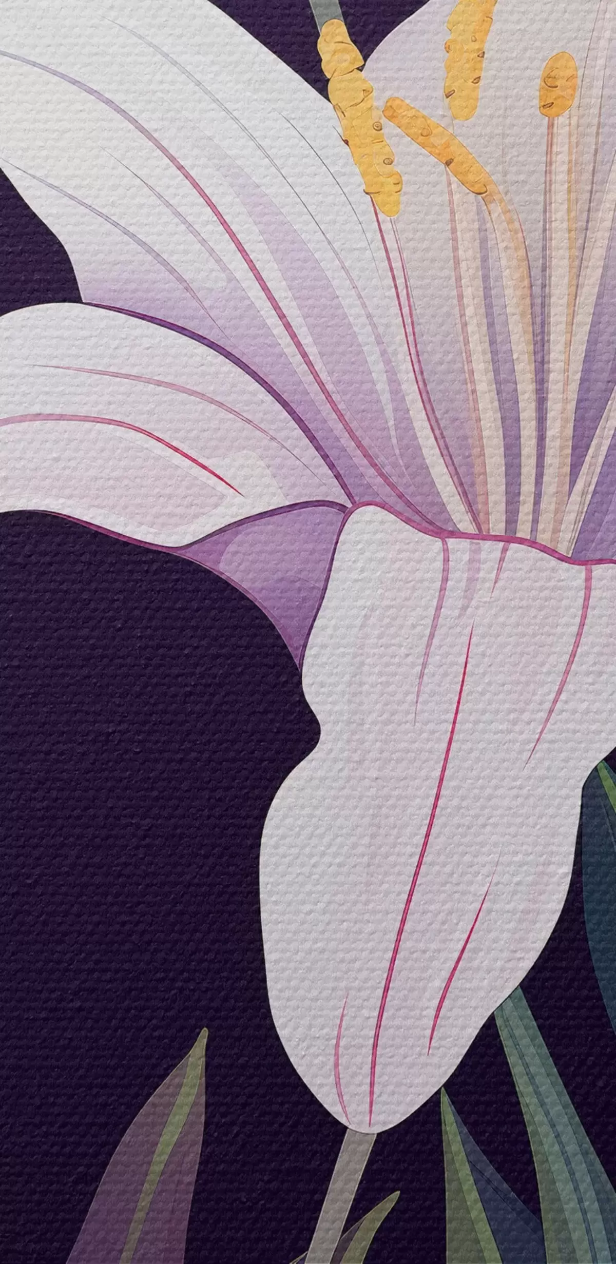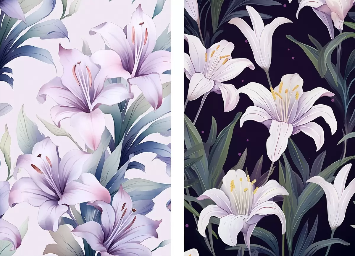 murales Delicados lirios rosas con hojas verdes sobre fondo claro y oscuro m00689