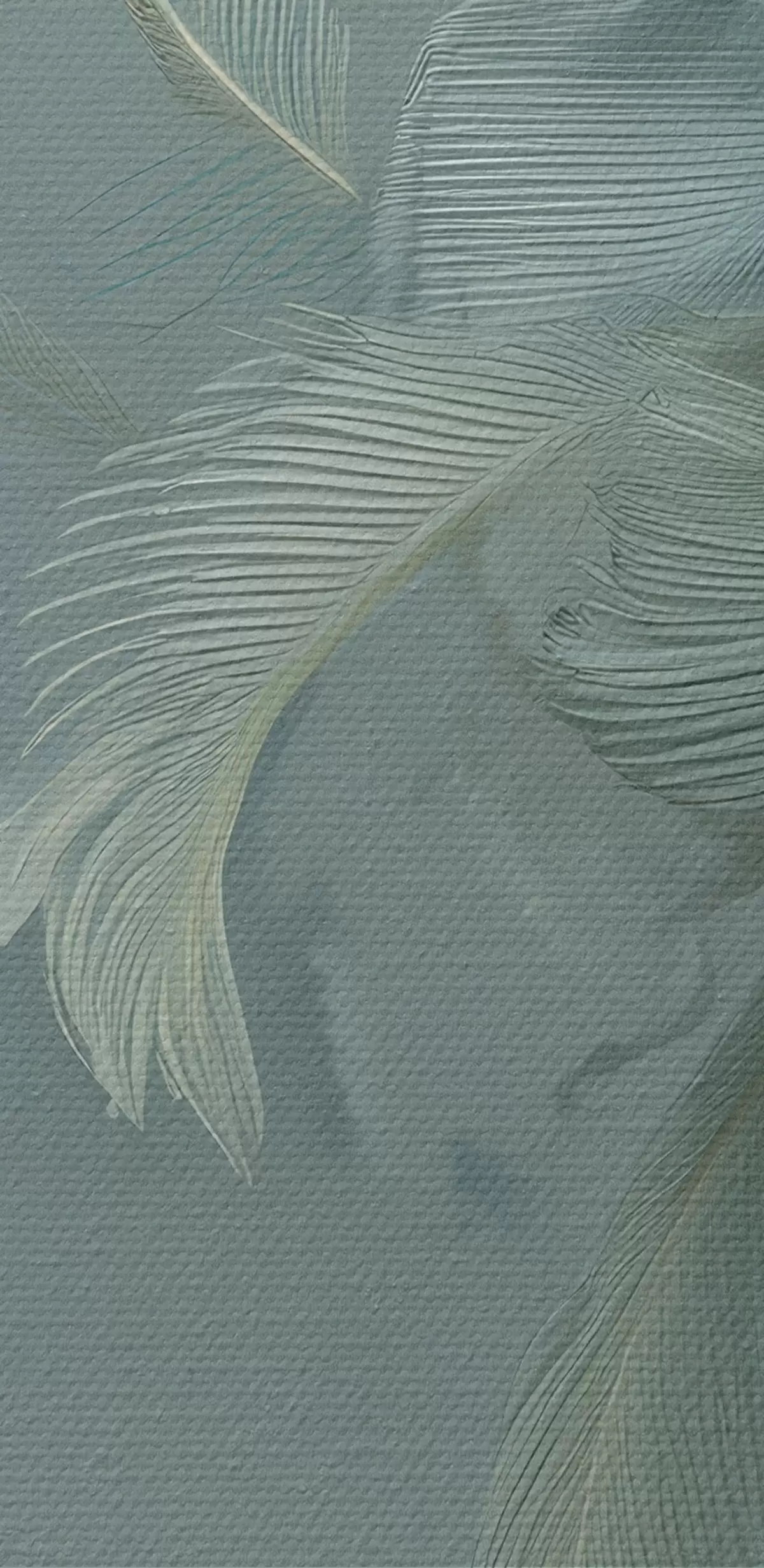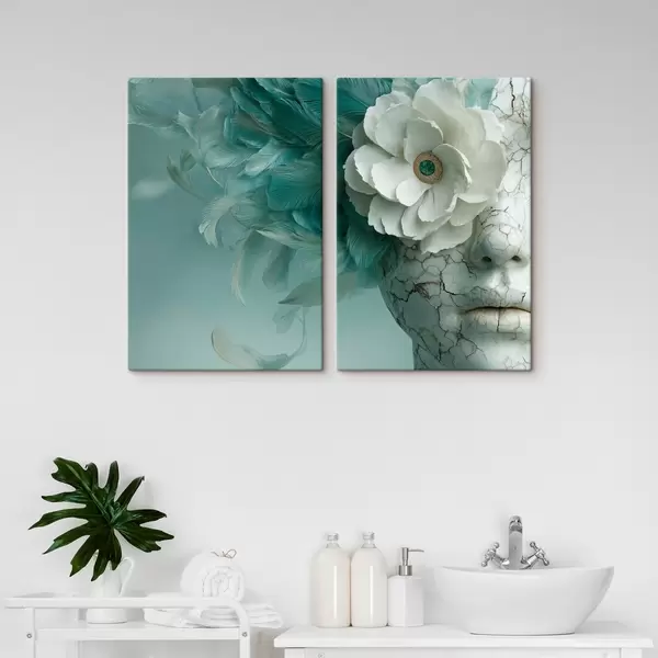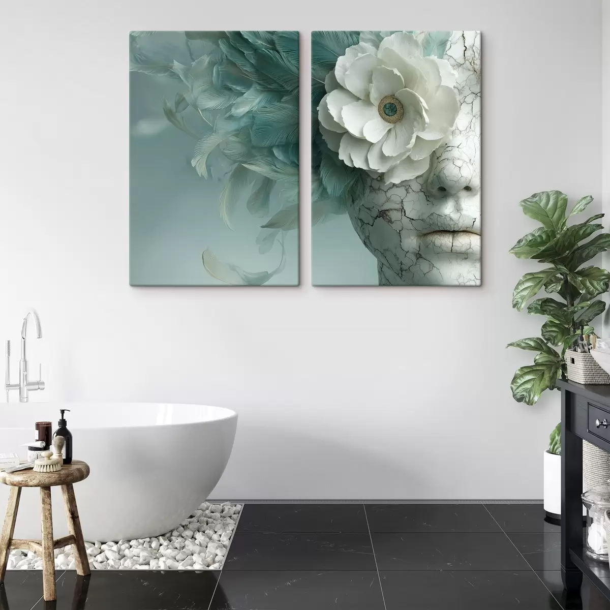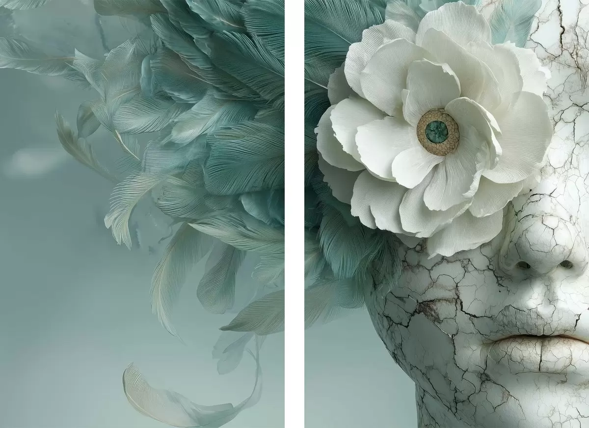 murales rostro de mármol de una niña con una flor y plumas m00699