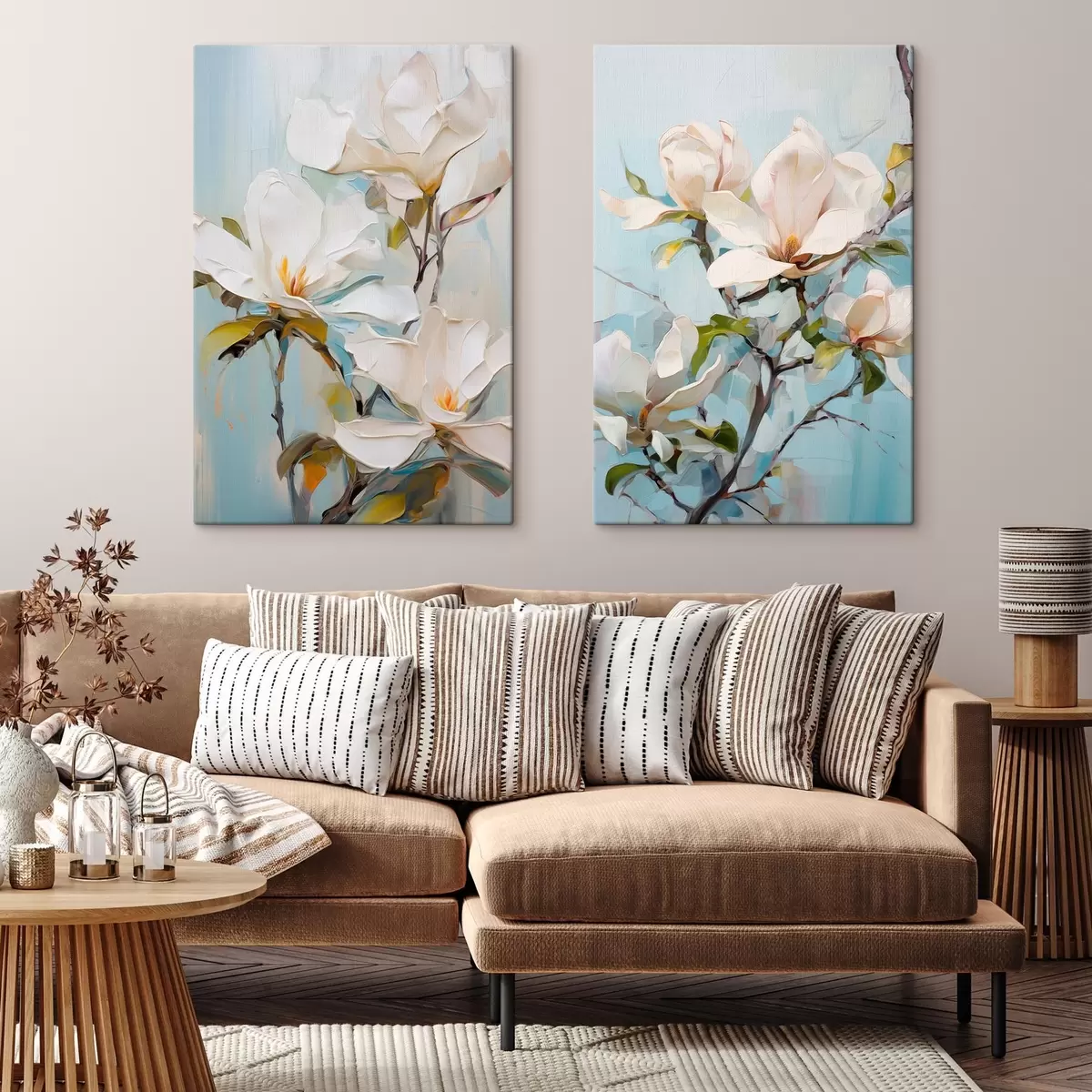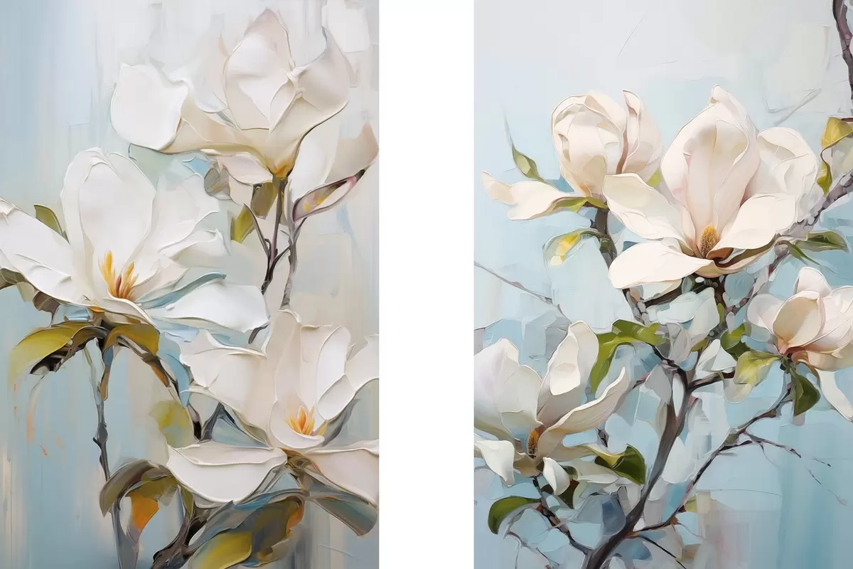 murales Flores blancas de magnolia, fondo azul claro con suaves pinceladas, estilo pintura al óleo, textura impasto m00881