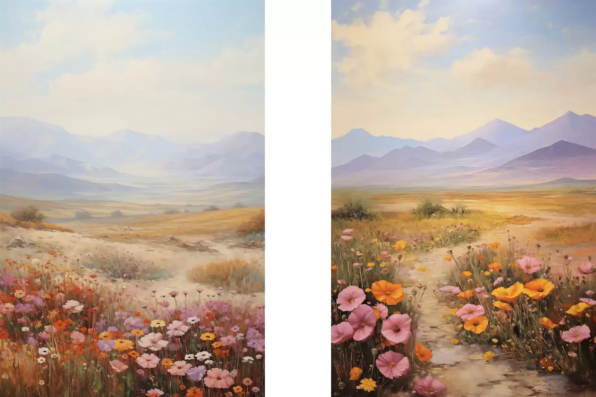 murales Paisaje, un campo de flores coloridas con montañas al fondo, colores suaves y pastel m01003