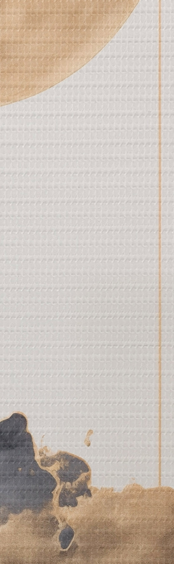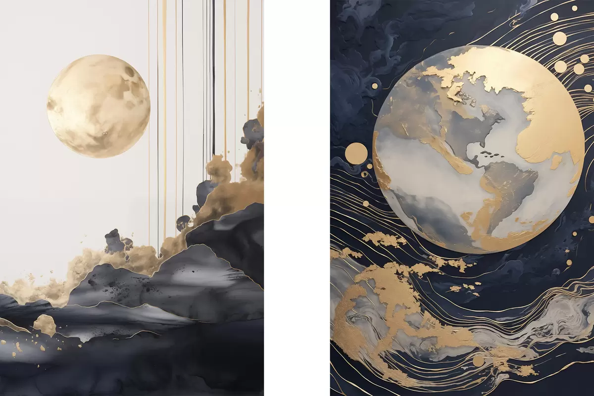 murales Planeta decorativo texturizado en el espacio con líneas y puntos amarillos, estilo abstracto, minimalista y moderno m01014