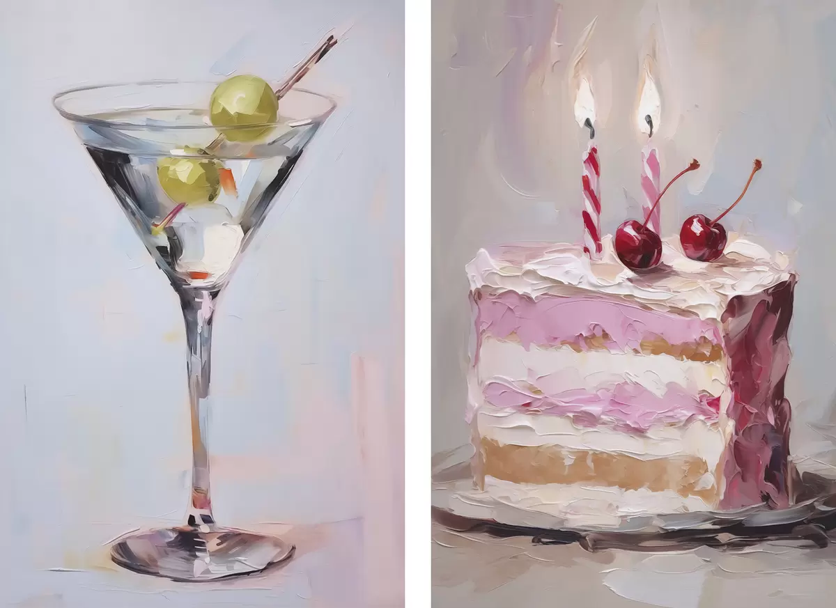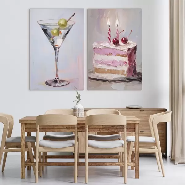 murales Un vaso con una bebida y un trozo de tarta, pintura de imitación m01019