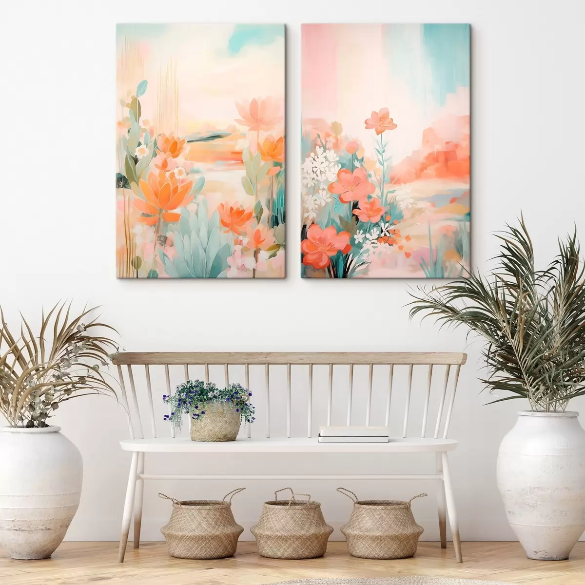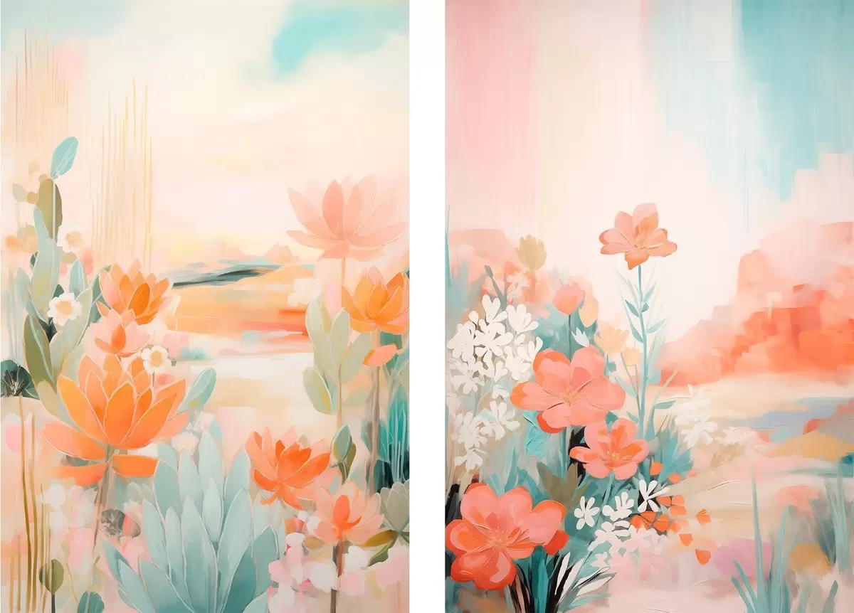 murales Motivos florales en tonos pastel sobre un fondo de valle brumoso y luminoso. m01085