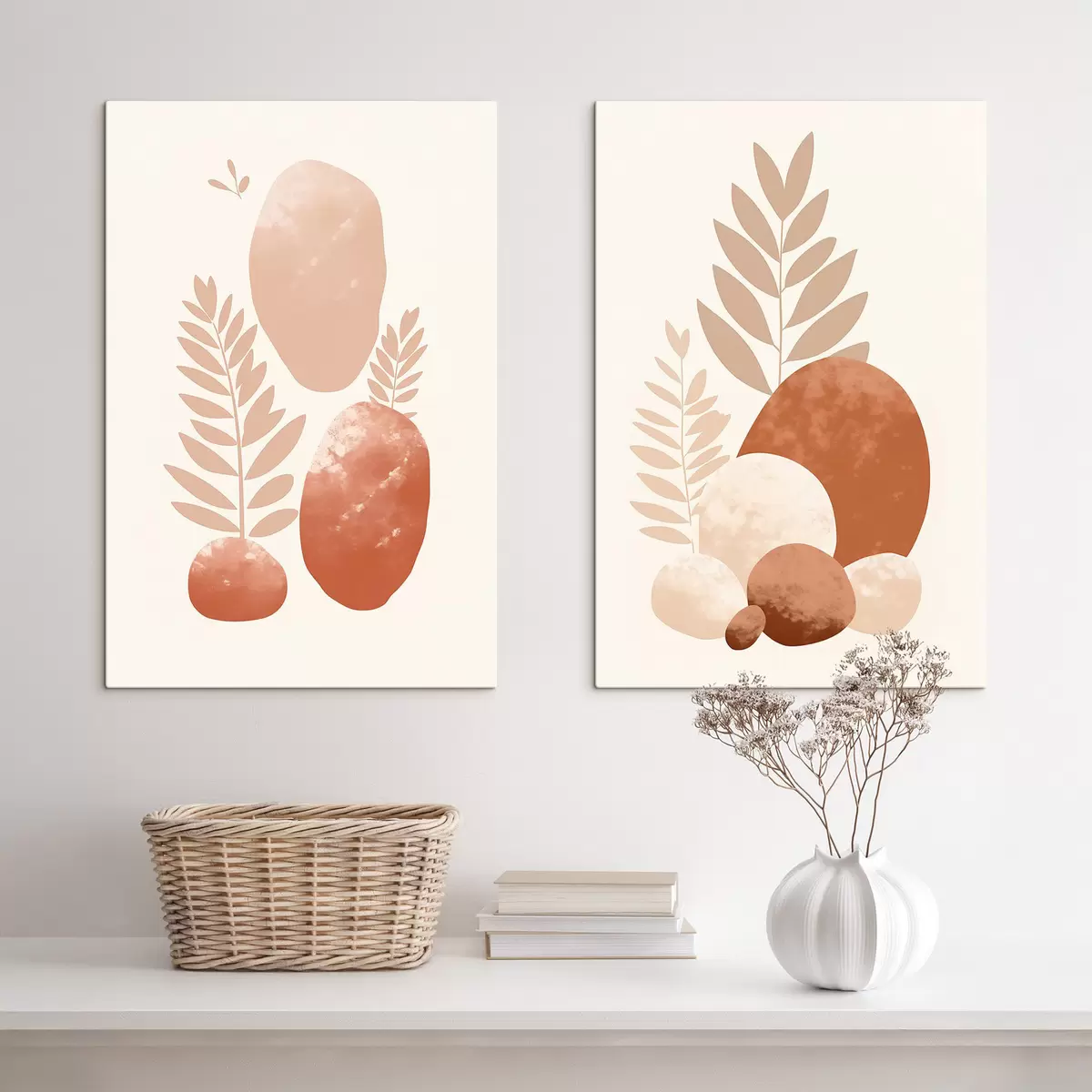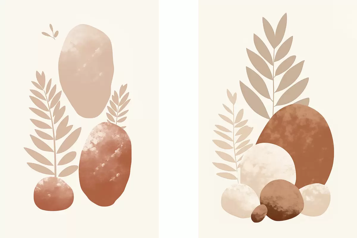 murales Formas abstractas, piedras y hojas con textura en tonos melocotón y terracota apagados, minimalistas, fondo crema m01114