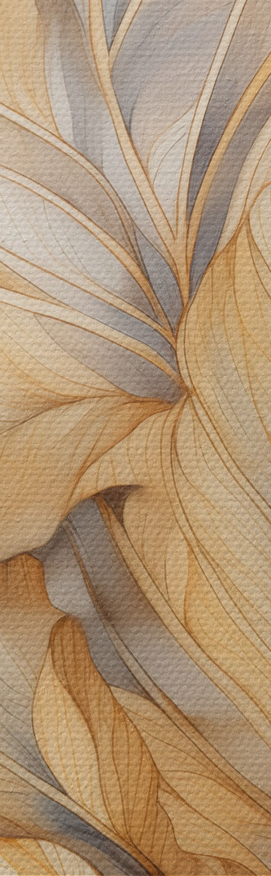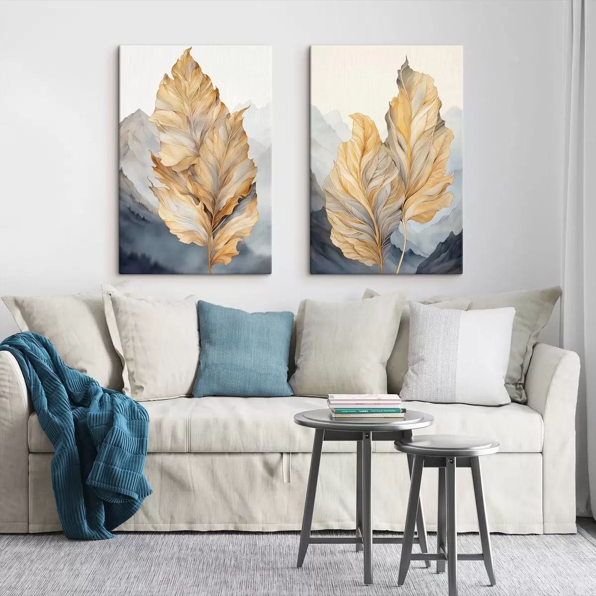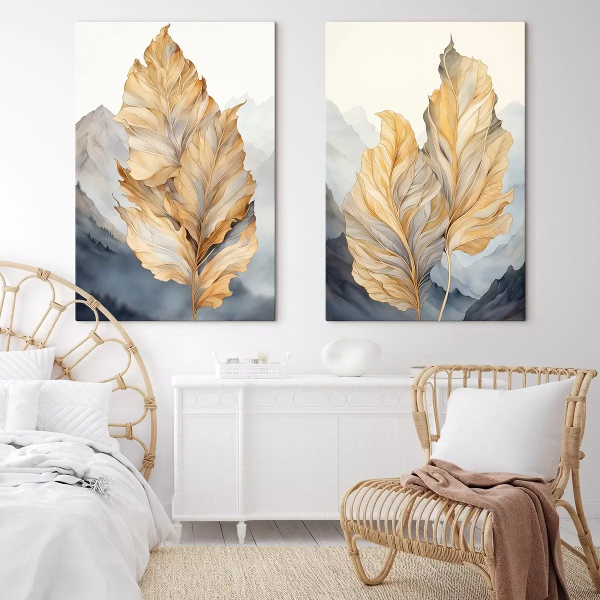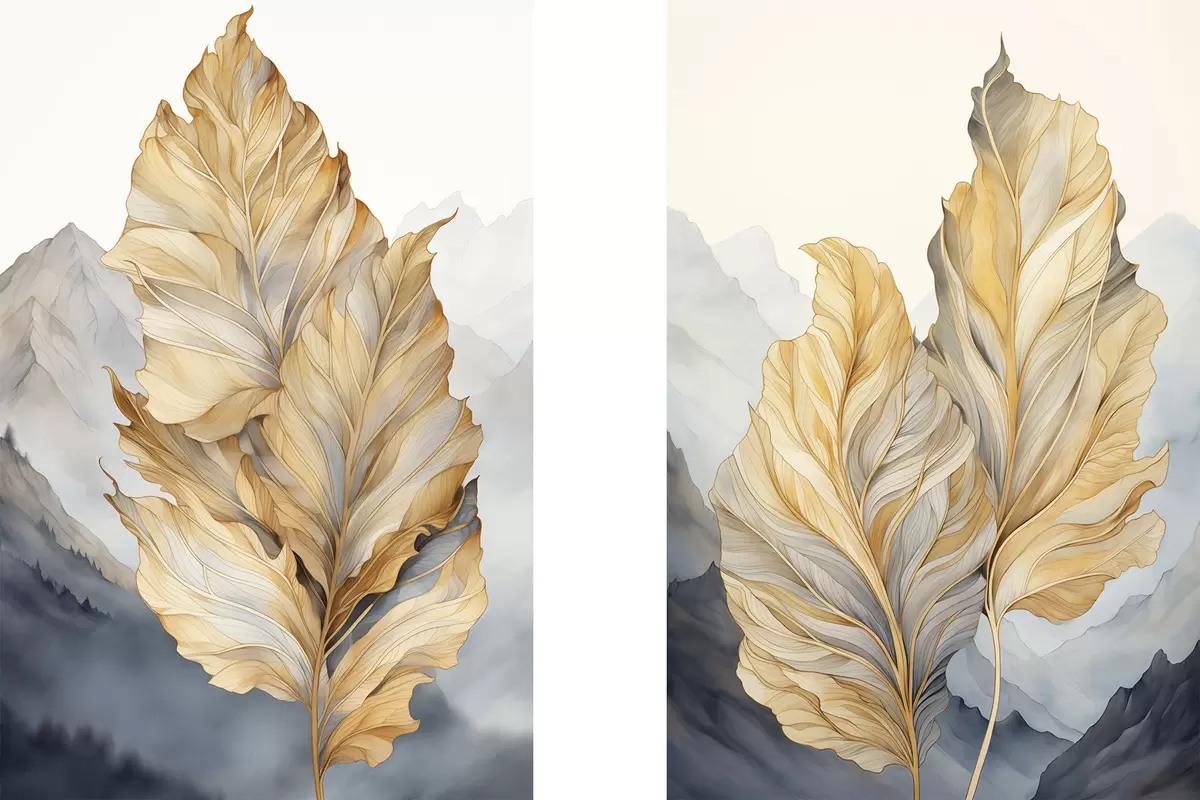 murales Hojas abstractas grandes, amarillas y marrones con detalles intrincados, sobre un paisaje montañoso m01119
